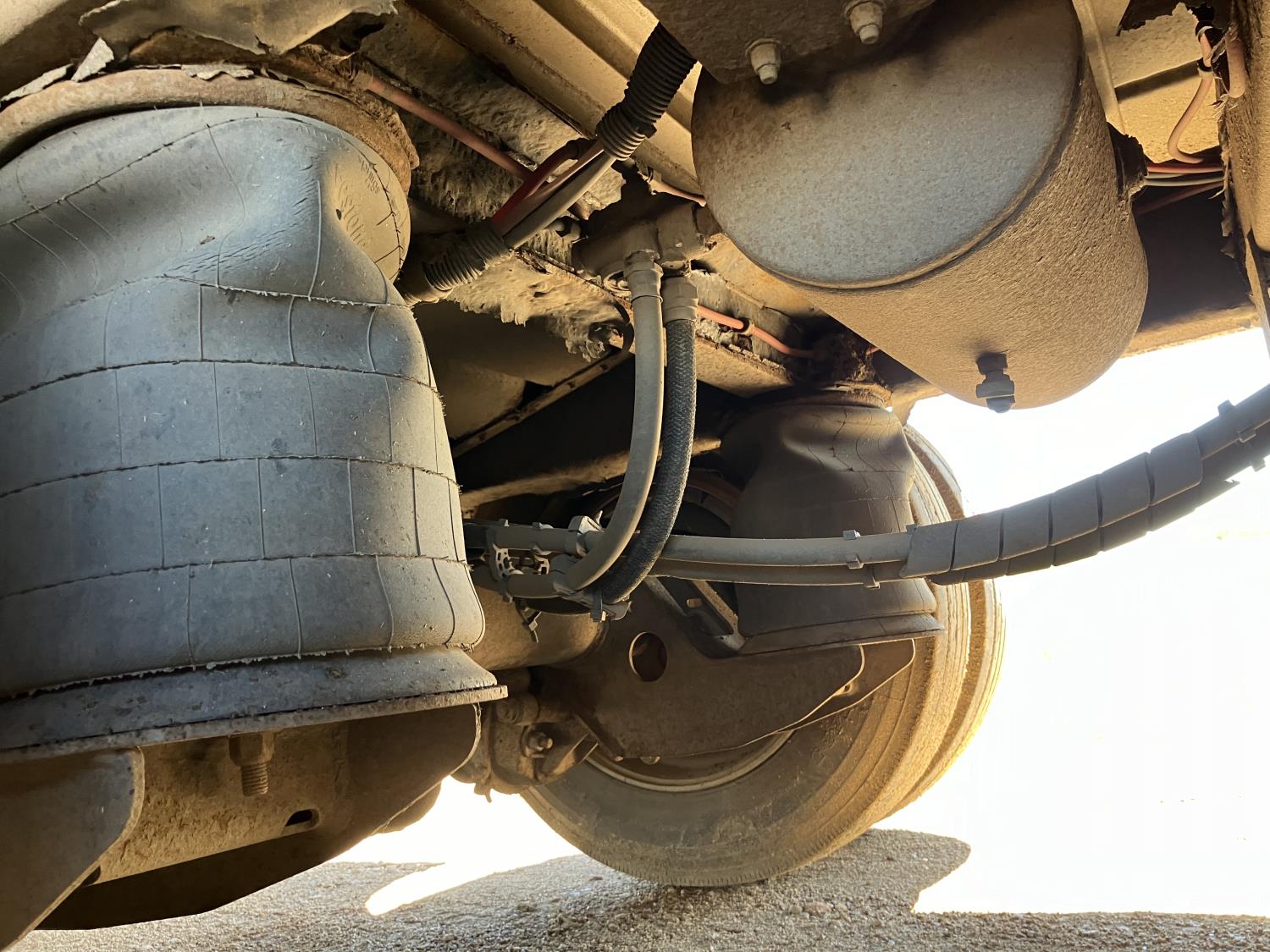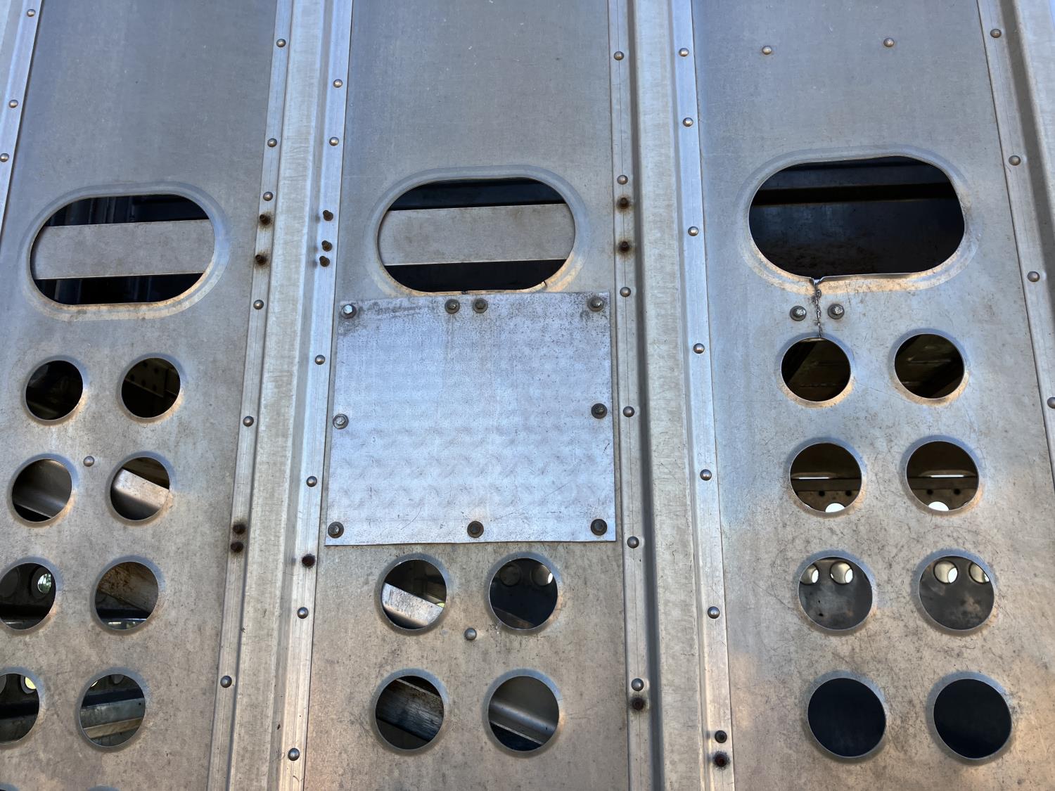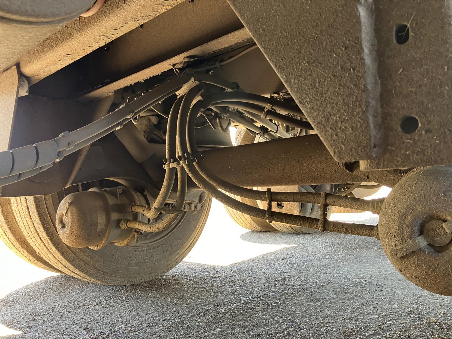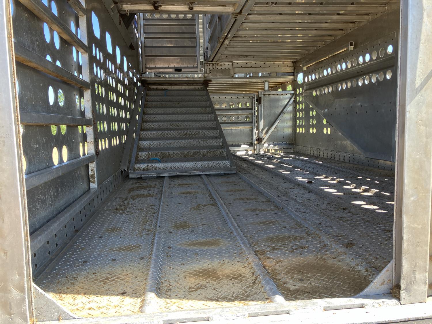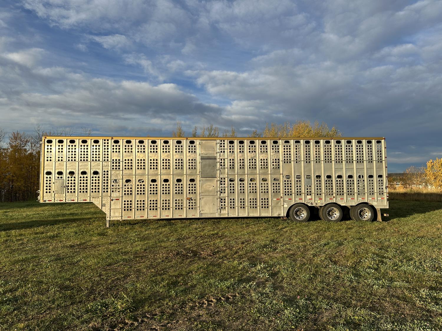 dog house, suspension air gauge, front and rear lift axels, 16 ft rear end, 26 ft belly, 10 ft nose, front deck planks, escape latches, aluminum wheels, 225/70R22.5 tires