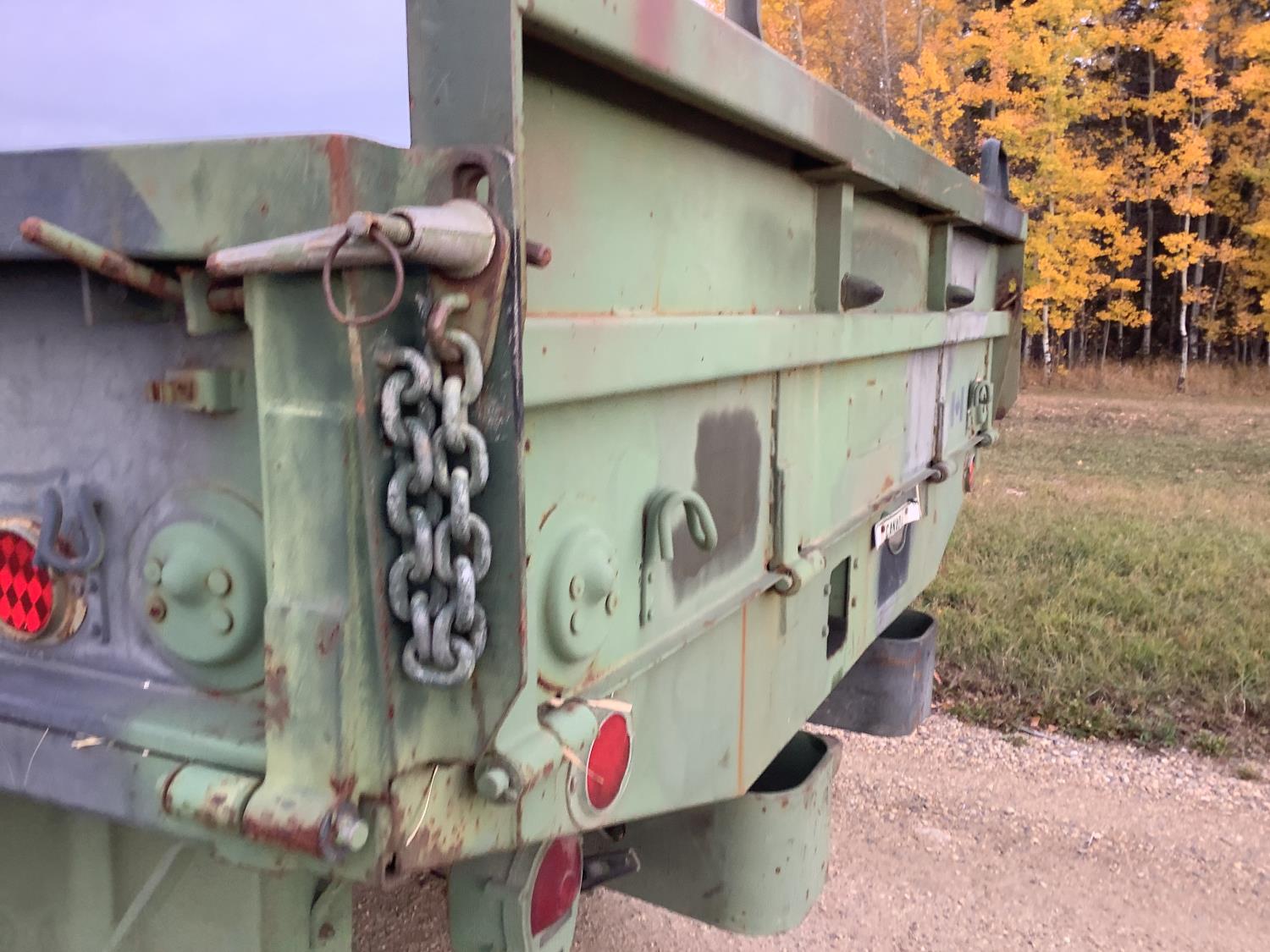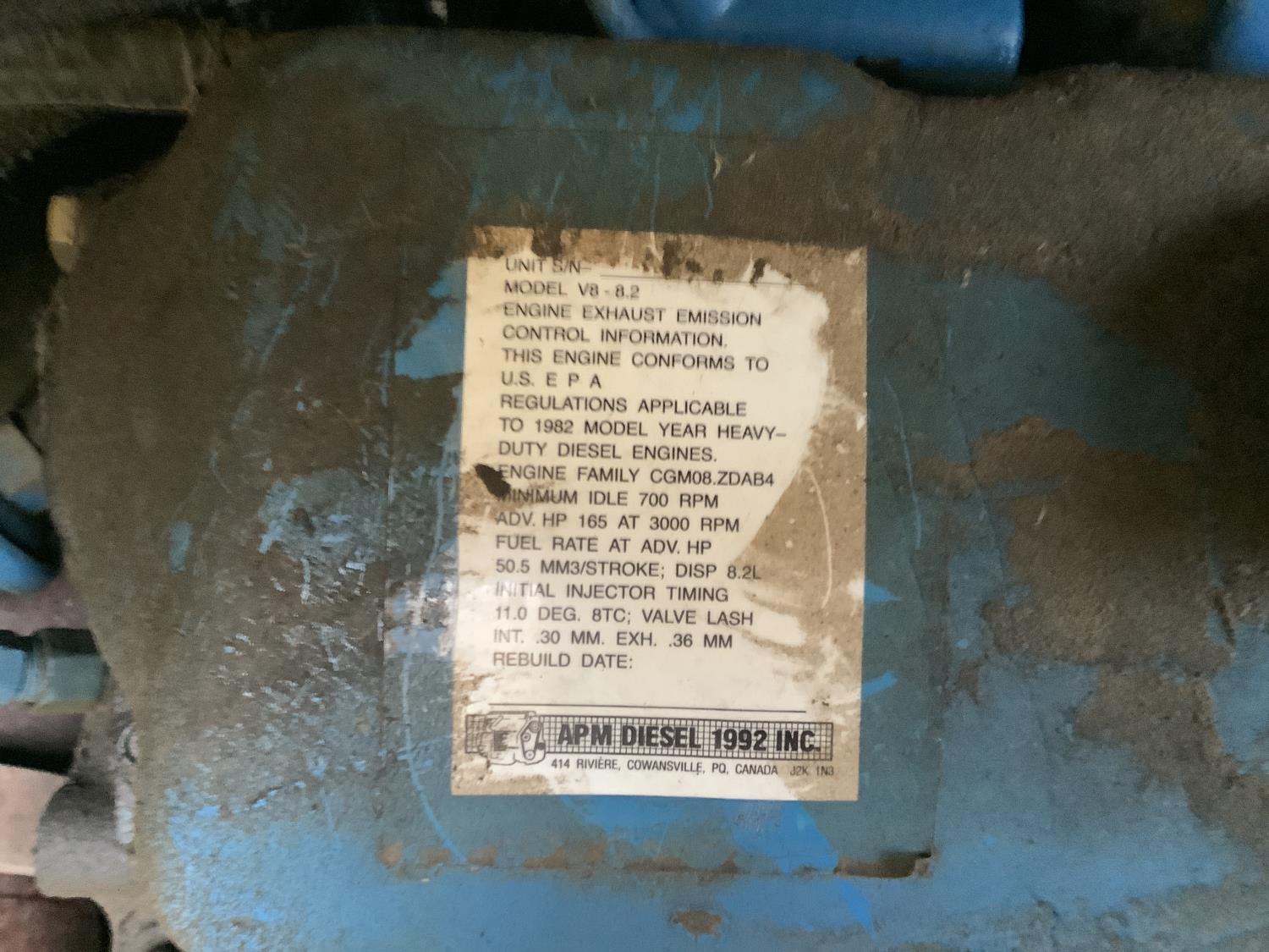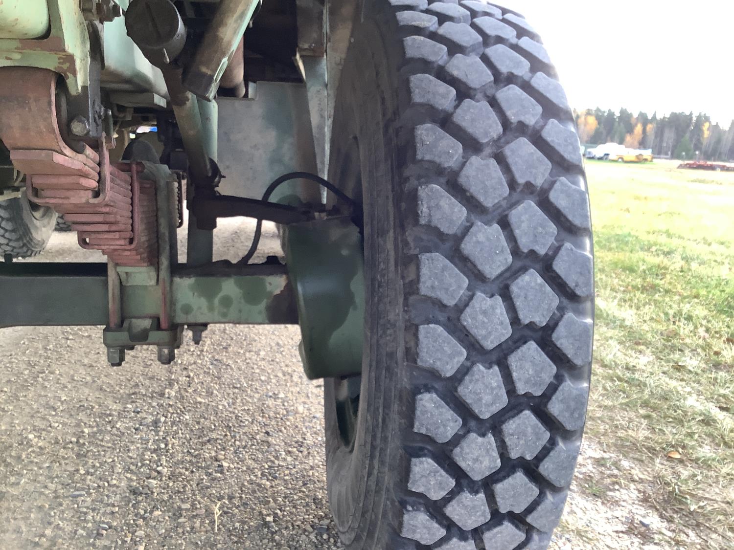 GM 8.2 Fuel squeezer V8 diesel engine, Allison automatic transmission, air over hydraulic brakes, manual park brake, spring suspension, steel box with fold down sides, rear pintle hitch