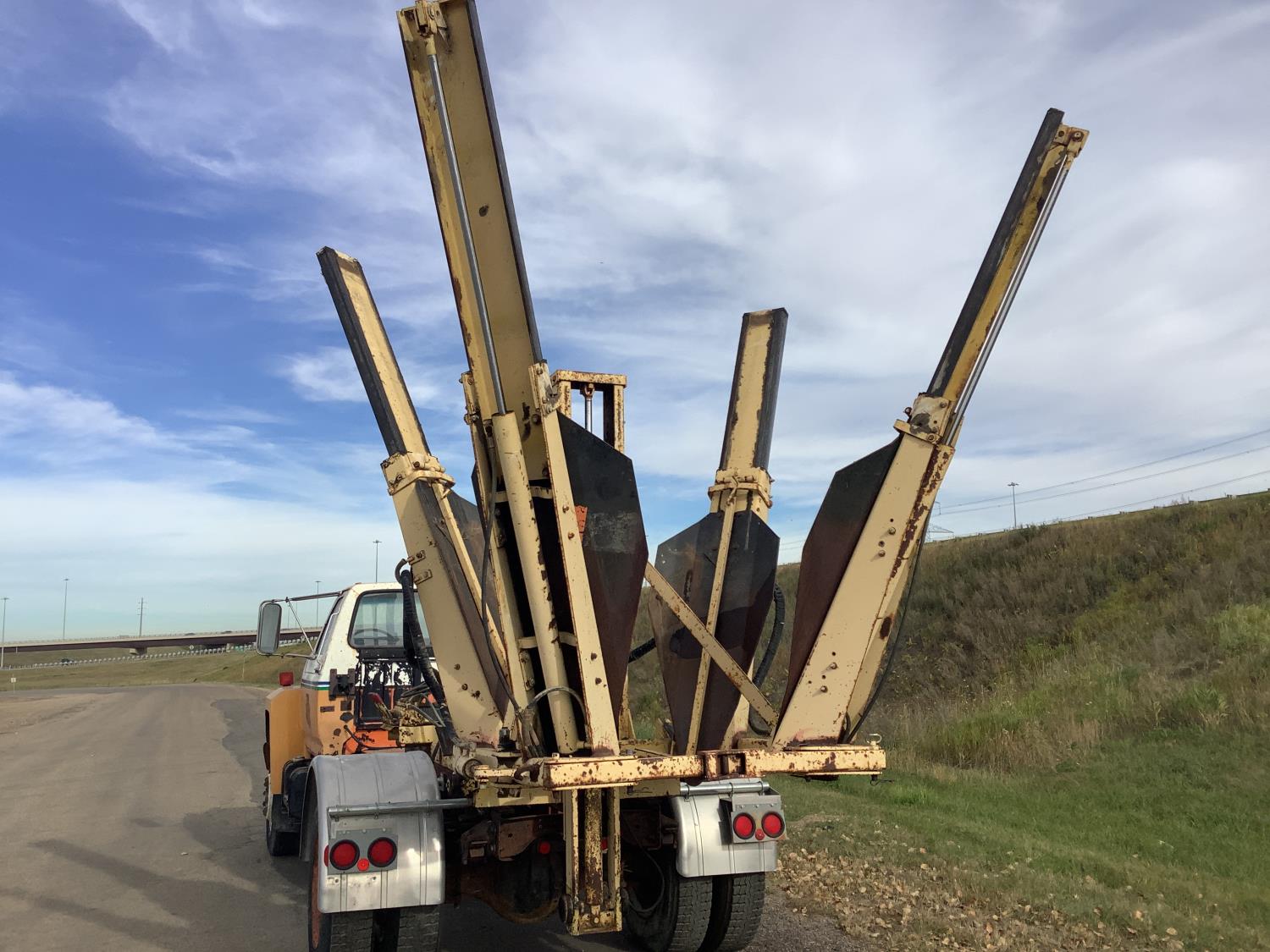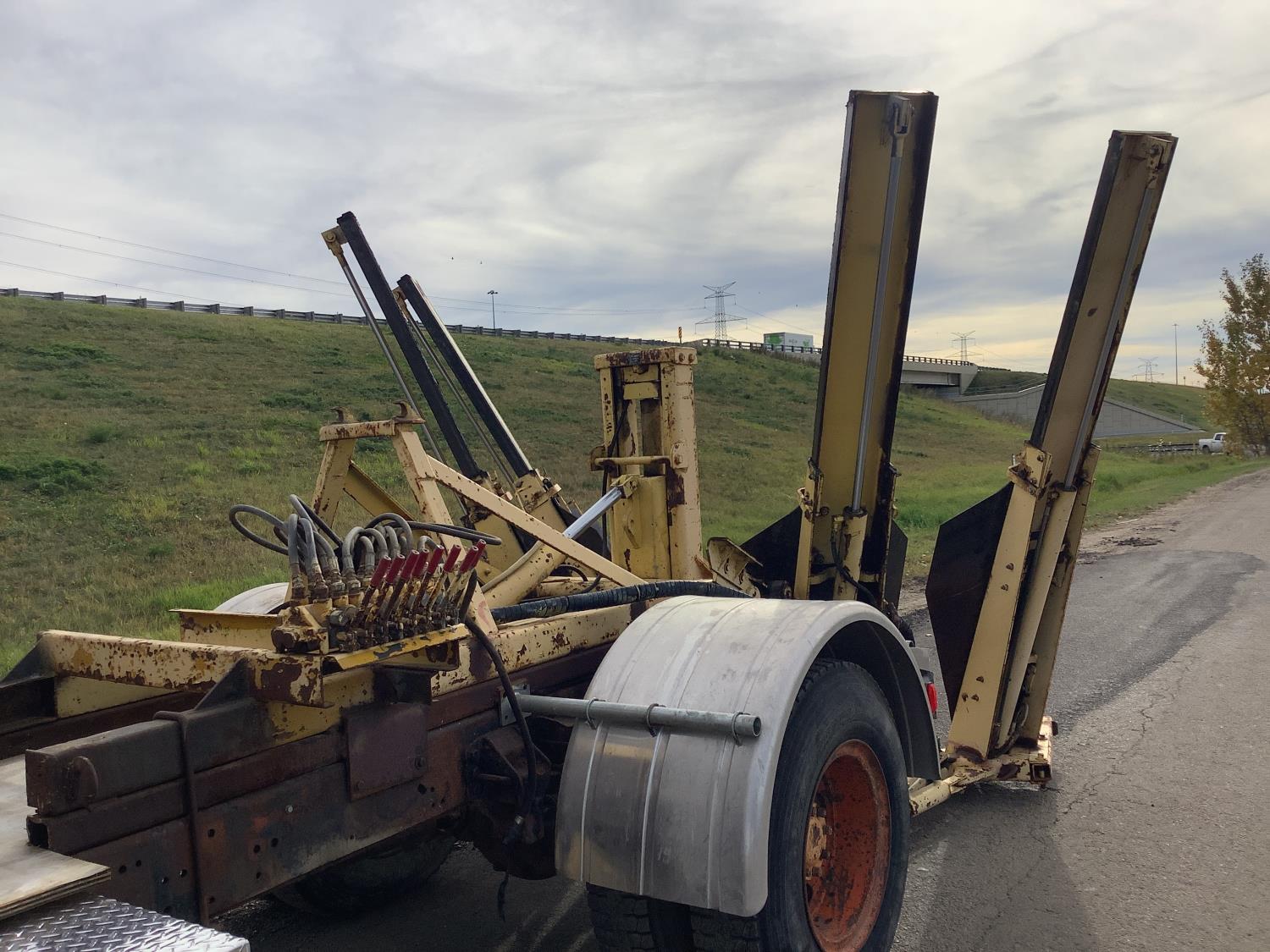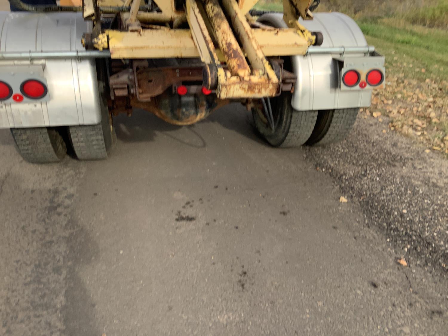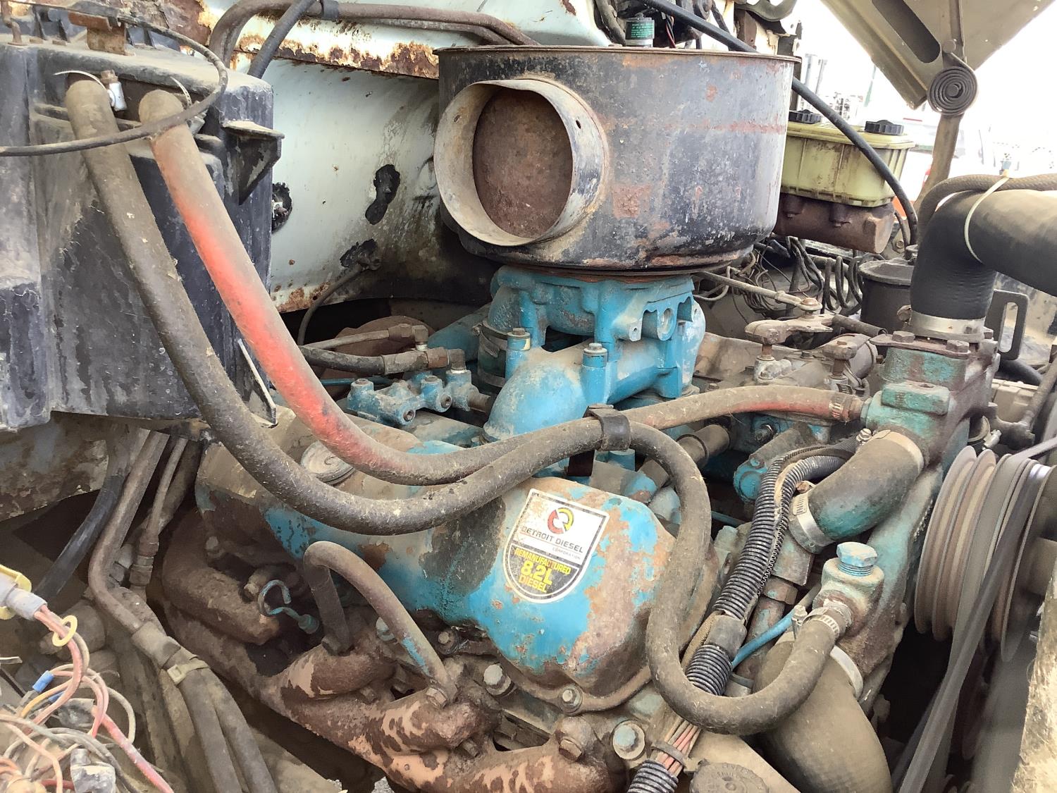 Detroit 8.2 Liter V8 engine, 5 speed transmission c/w 2 speed axle, spring ride suspension, hydraulic brakes, 10:00X20 tires, rear mount tree spade with side mount controls, hydraulic pump runs off the truck PTO