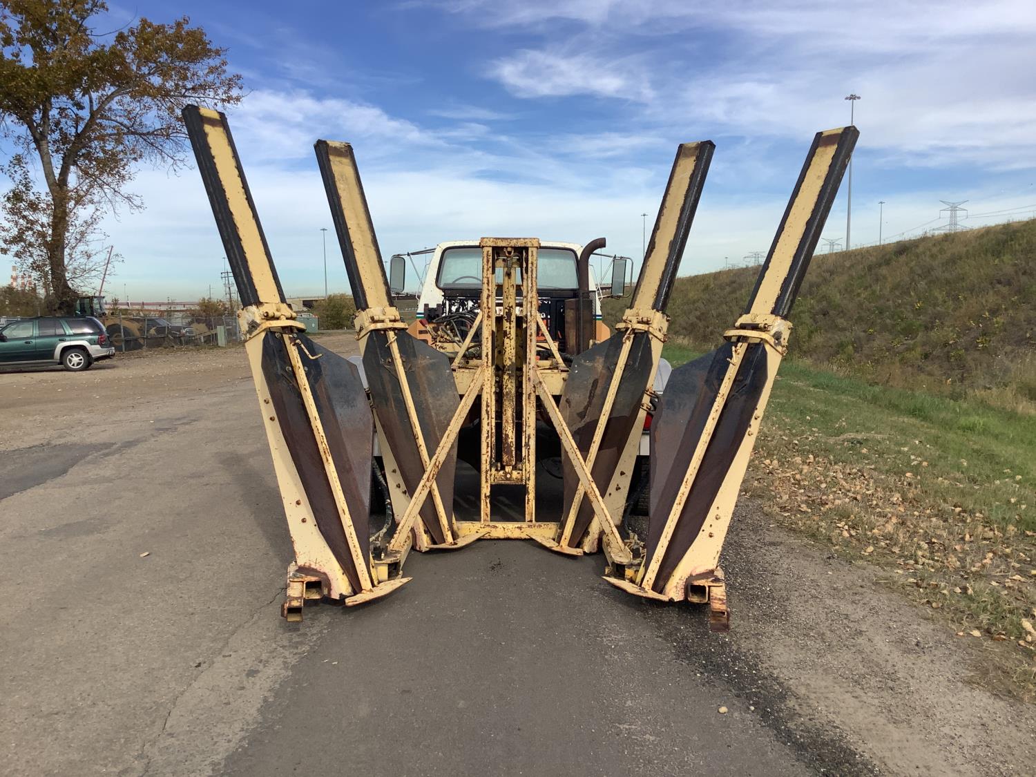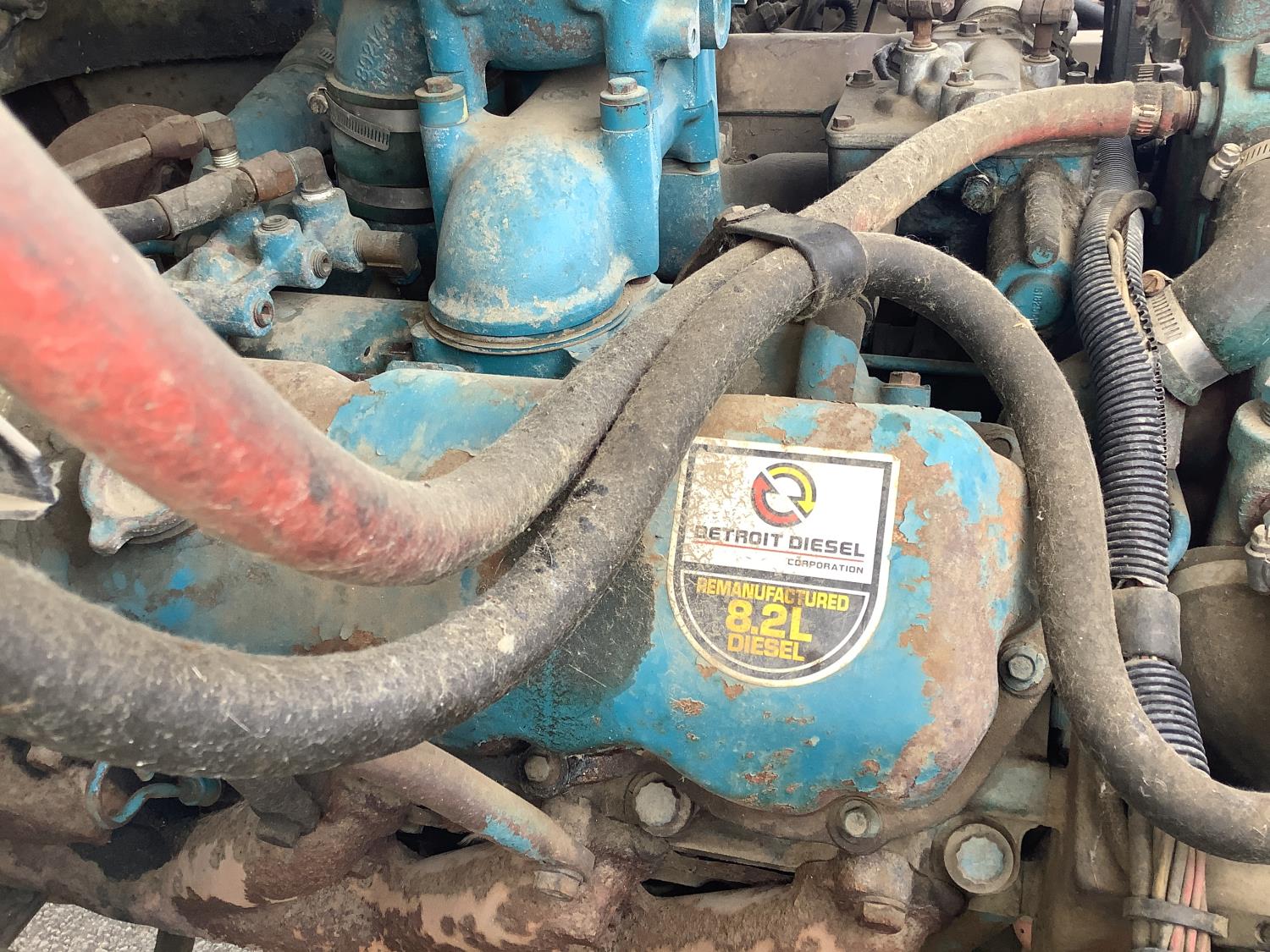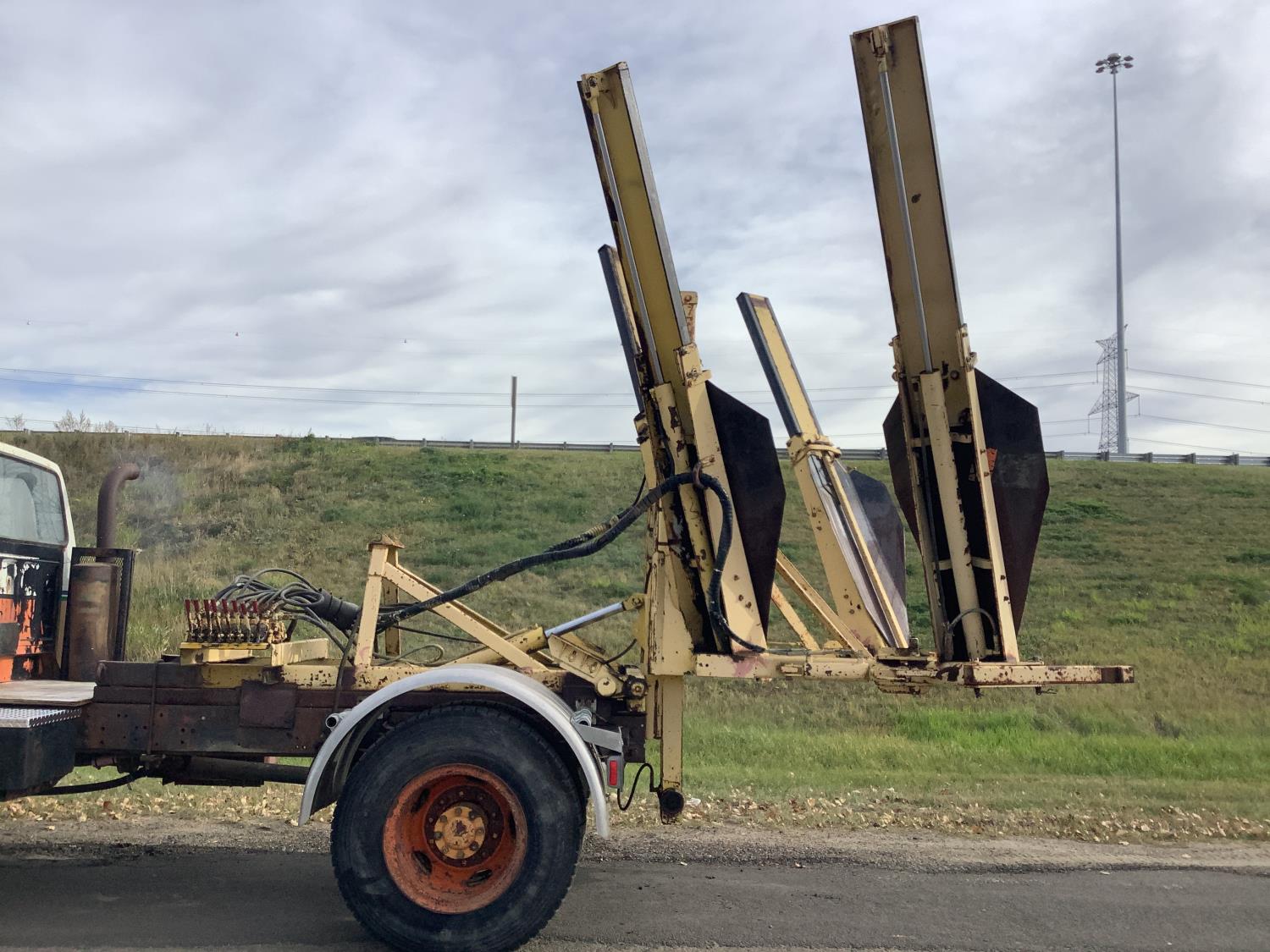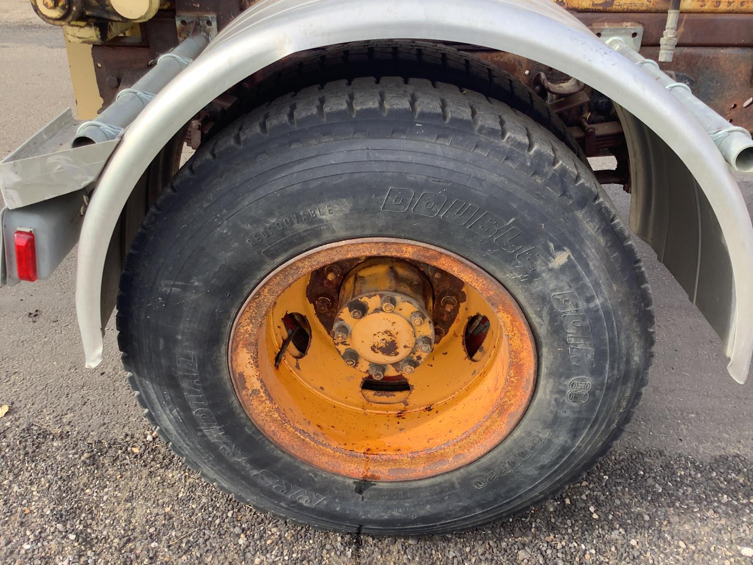 Detroit 8.2 Liter V8 engine, 5 speed transmission c/w 2 speed axle, spring ride suspension, hydraulic brakes, 10:00X20 tires, rear mount tree spade with side mount controls, hydraulic pump runs off the truck PTO