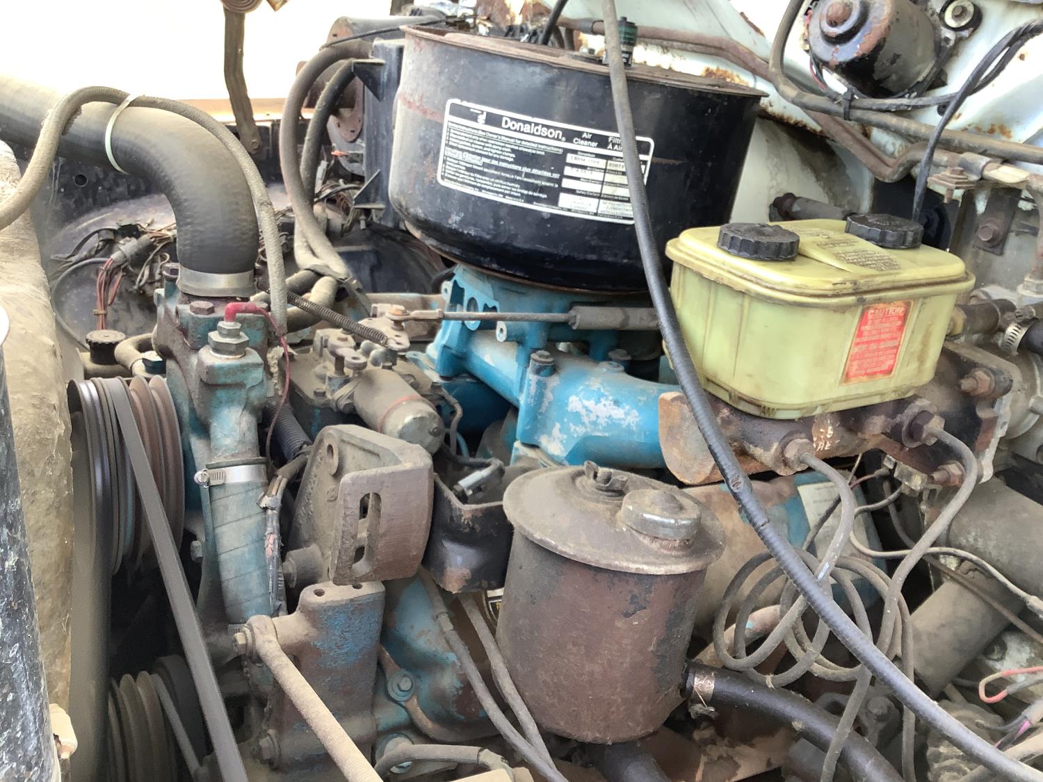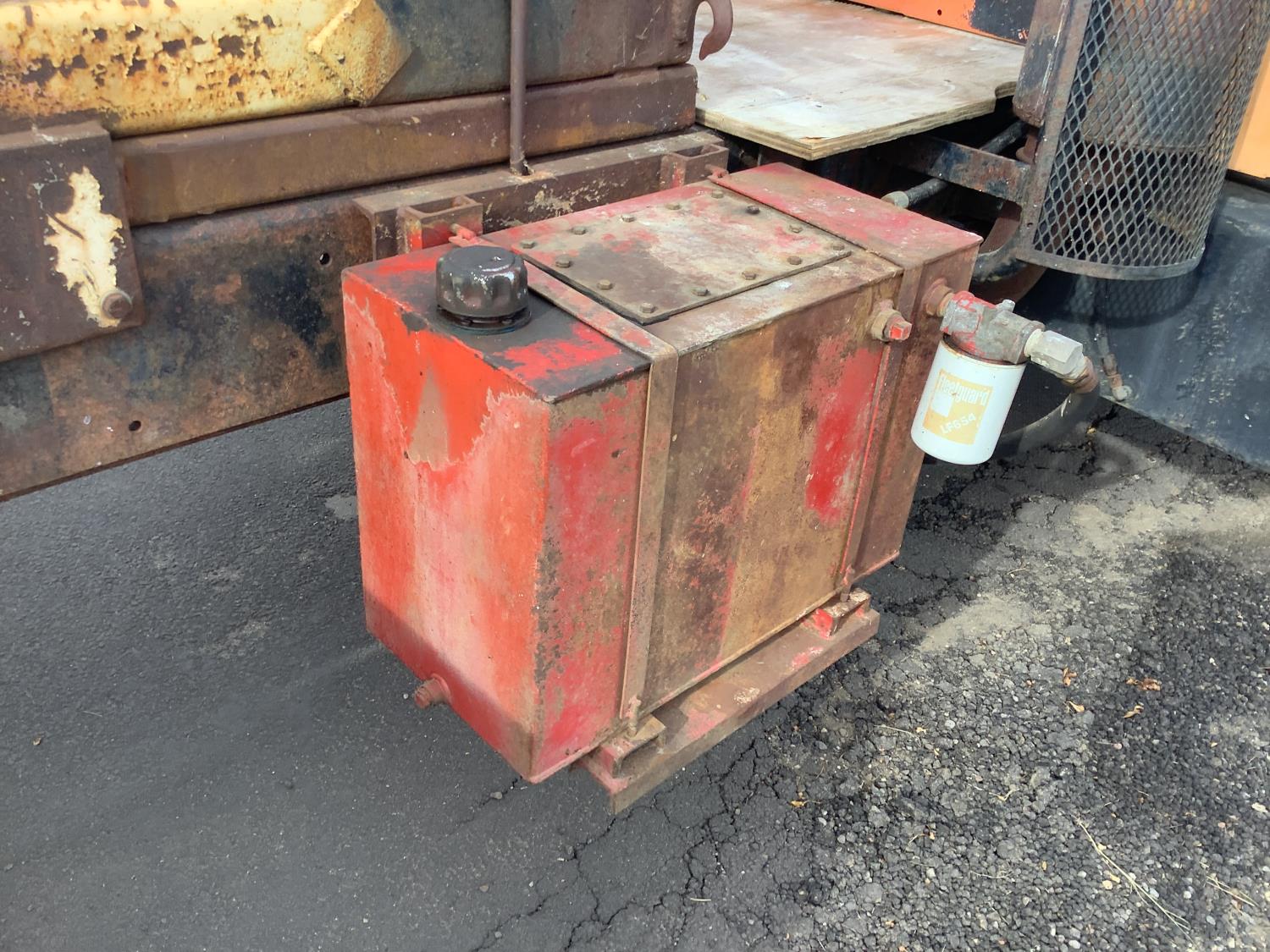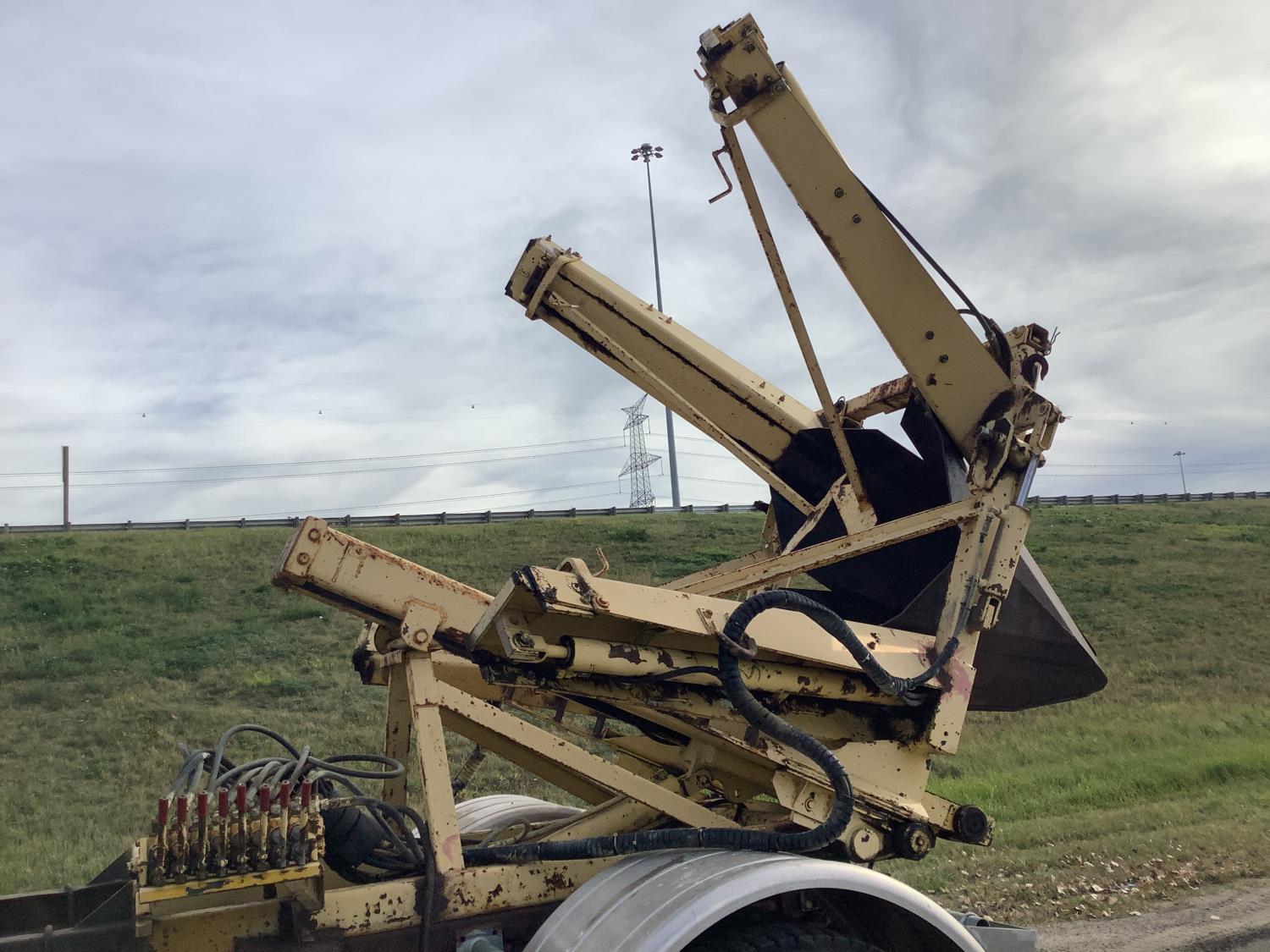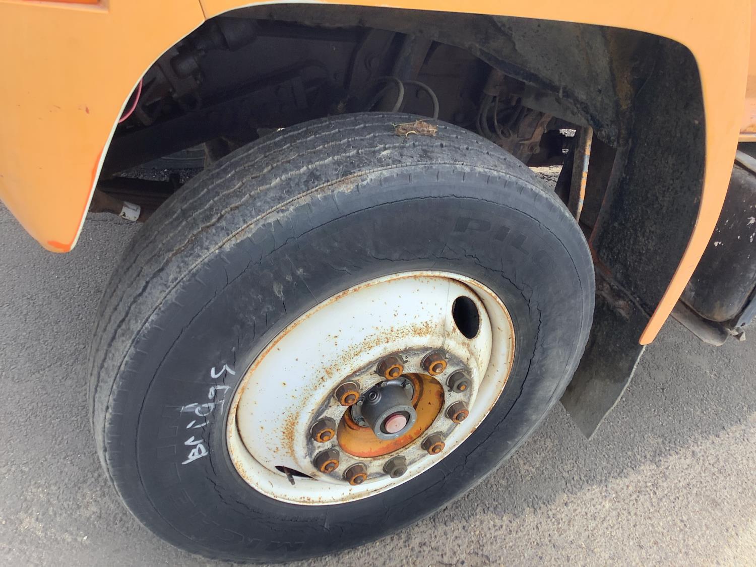 Detroit 8.2 Liter V8 engine, 5 speed transmission c/w 2 speed axle, spring ride suspension, hydraulic brakes, 10:00X20 tires, rear mount tree spade with side mount controls, hydraulic pump runs off the truck PTO
