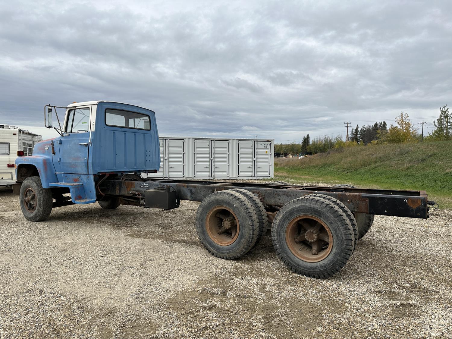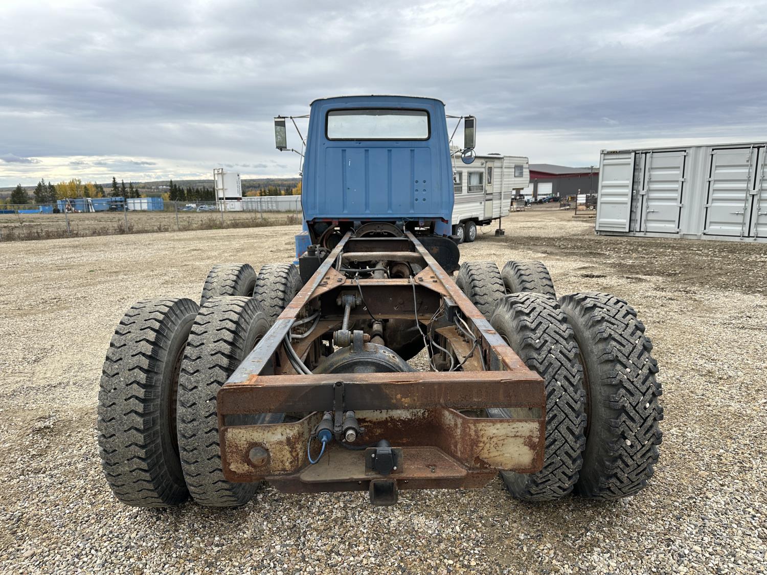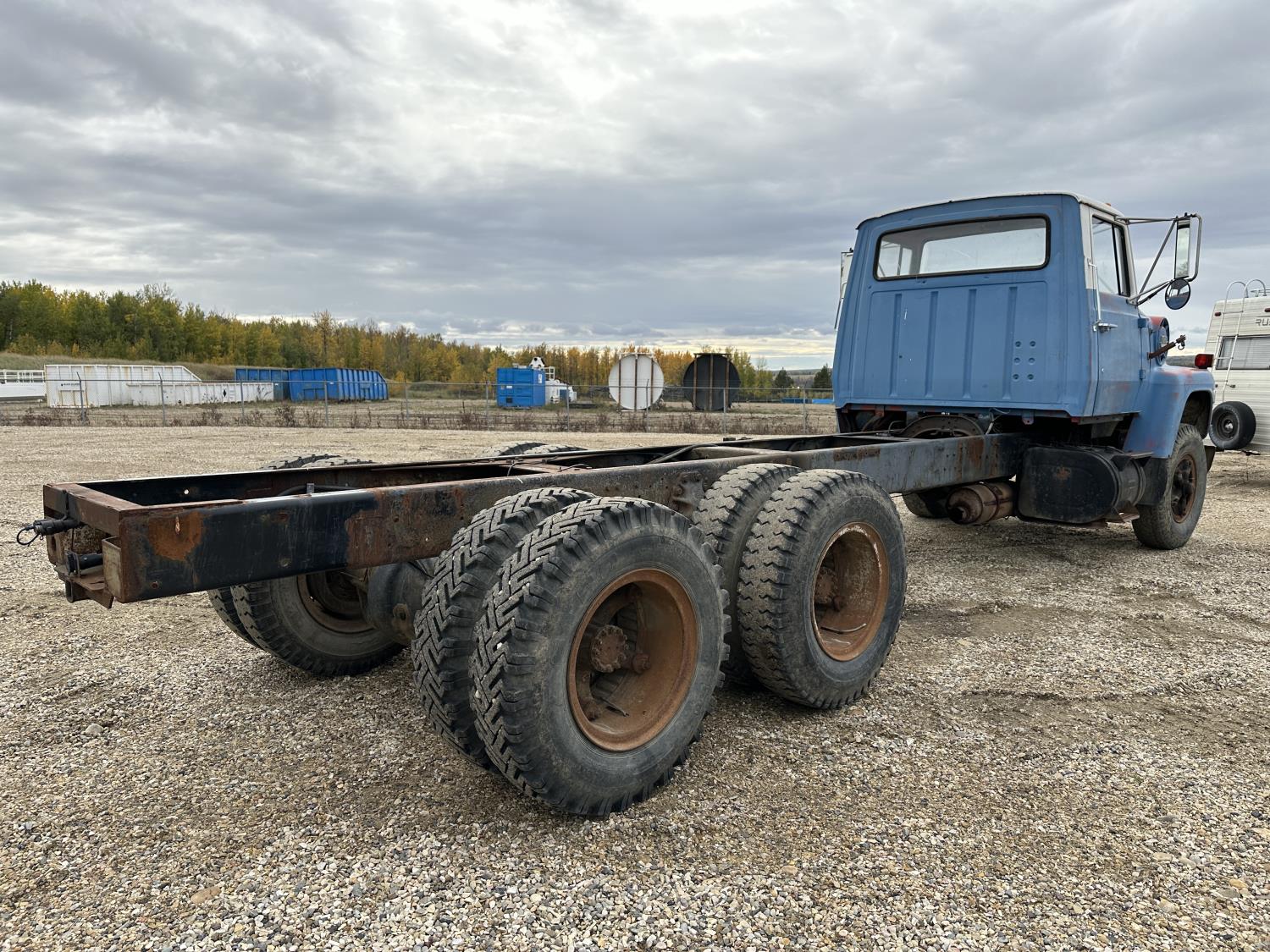 Ford 5-81 477 cu in V8 gas engine, 10 speed manual transmission, 43,000 lb rear axles, 229 inch WB, 11.00-20 front tires, 9.00-20 rear tires