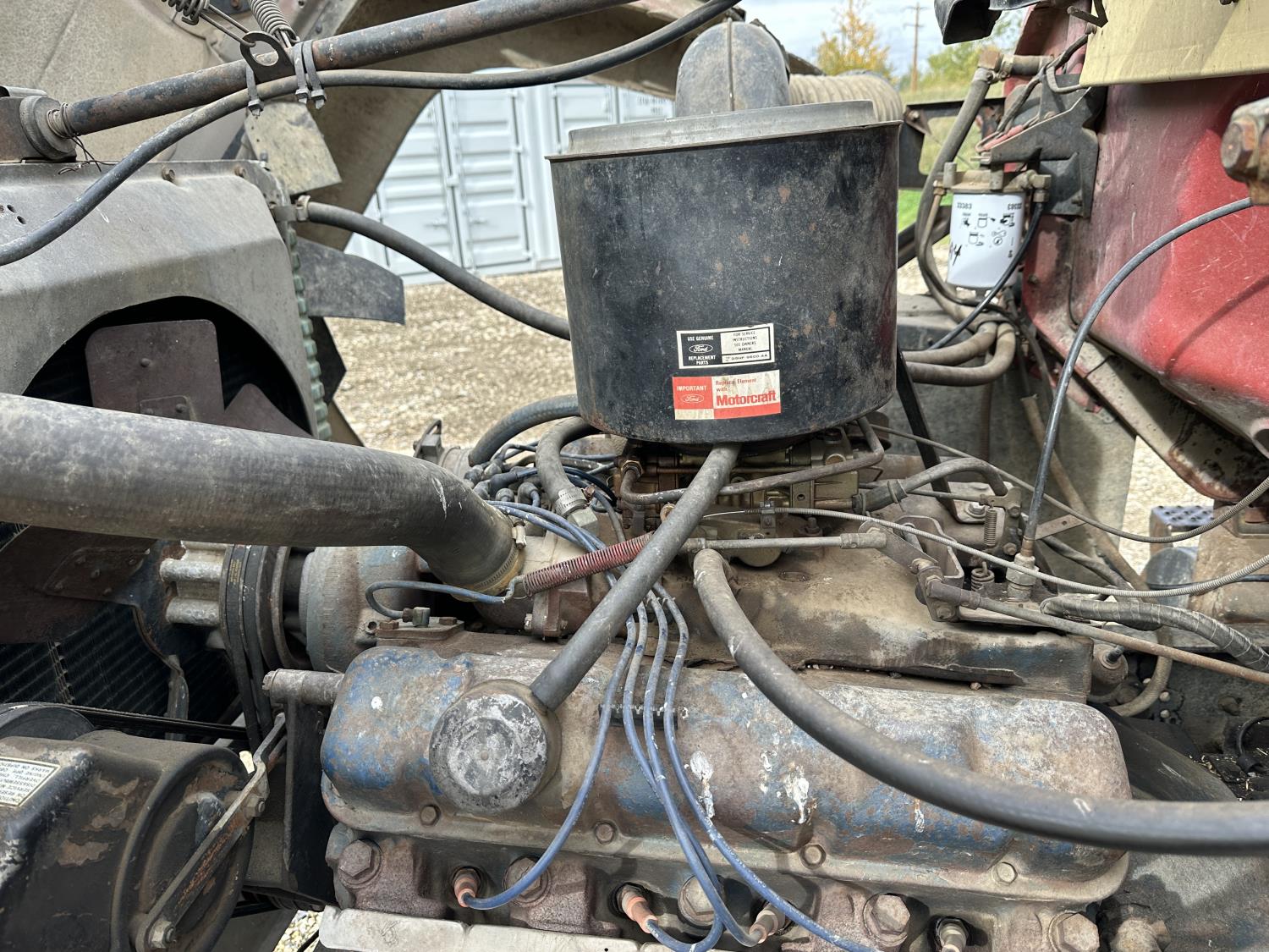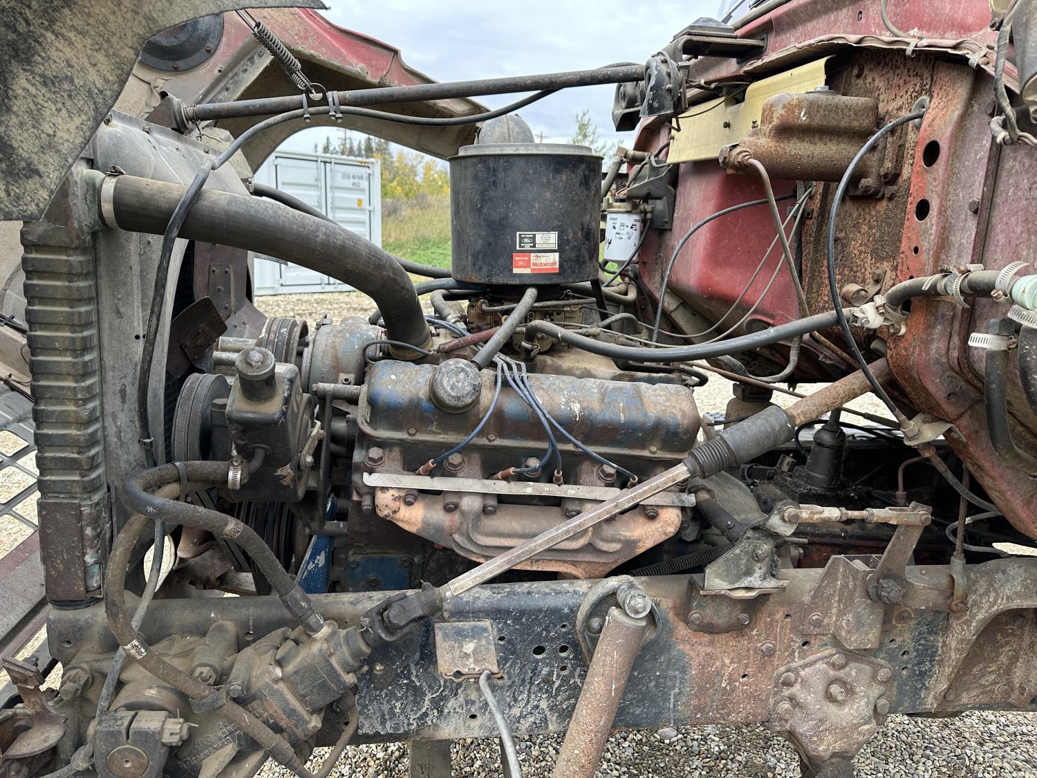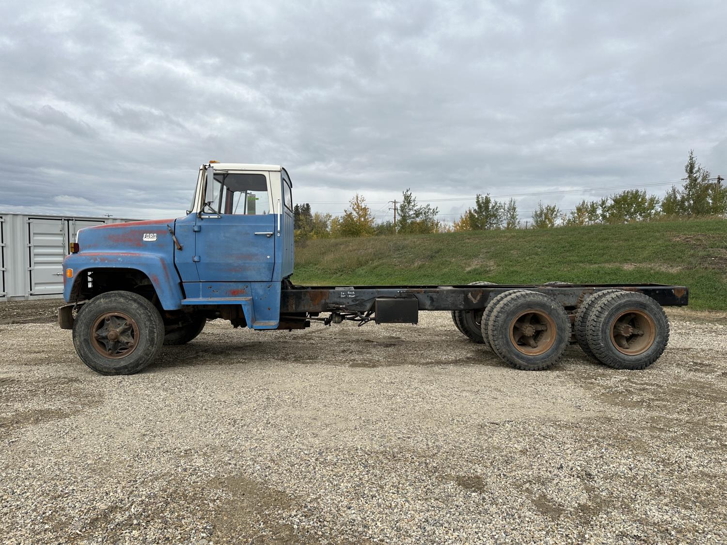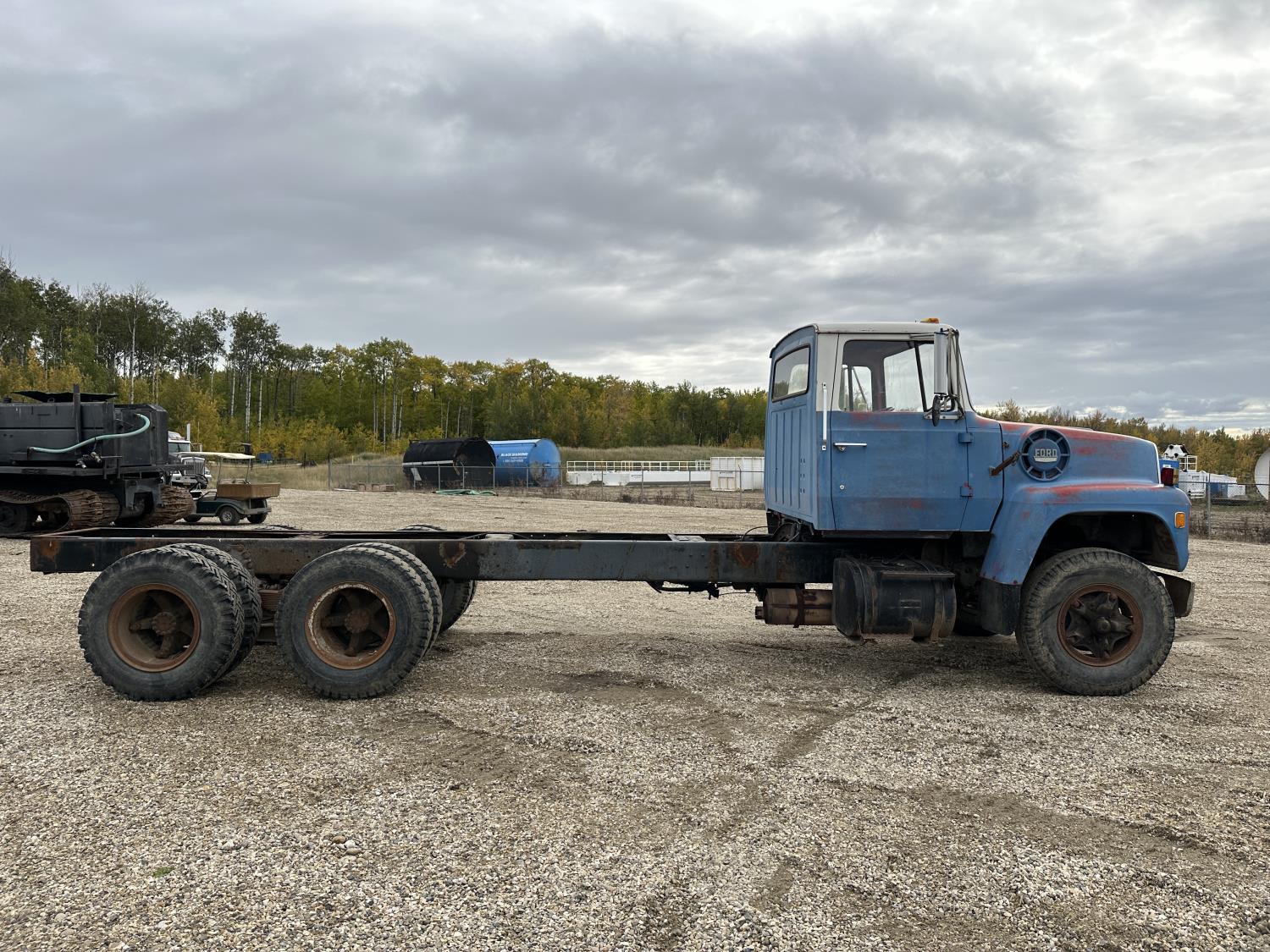 Ford 5-81 477 cu in V8 gas engine, 10 speed manual transmission, 43,000 lb rear axles, 229 inch WB, 11.00-20 front tires, 9.00-20 rear tires