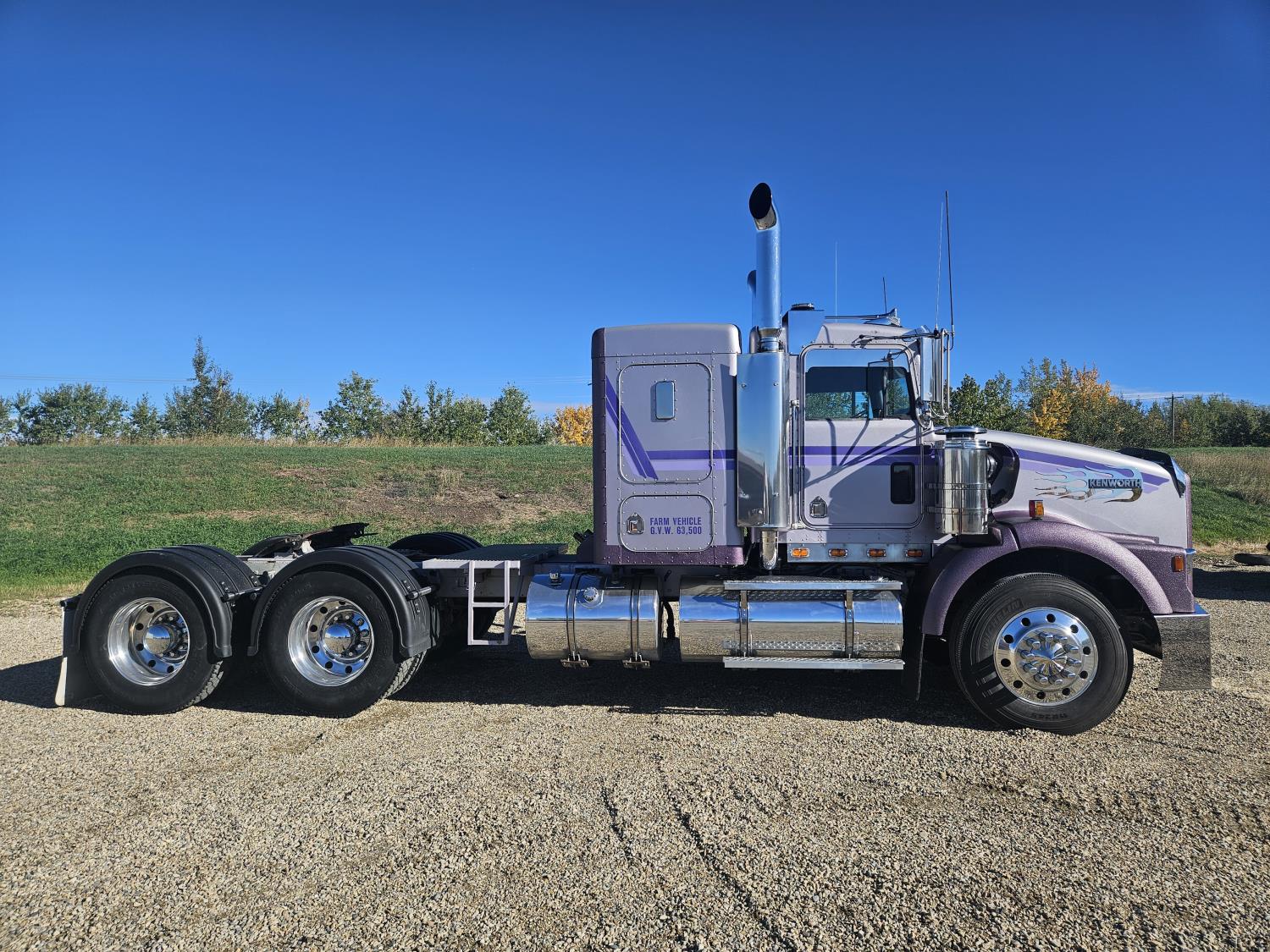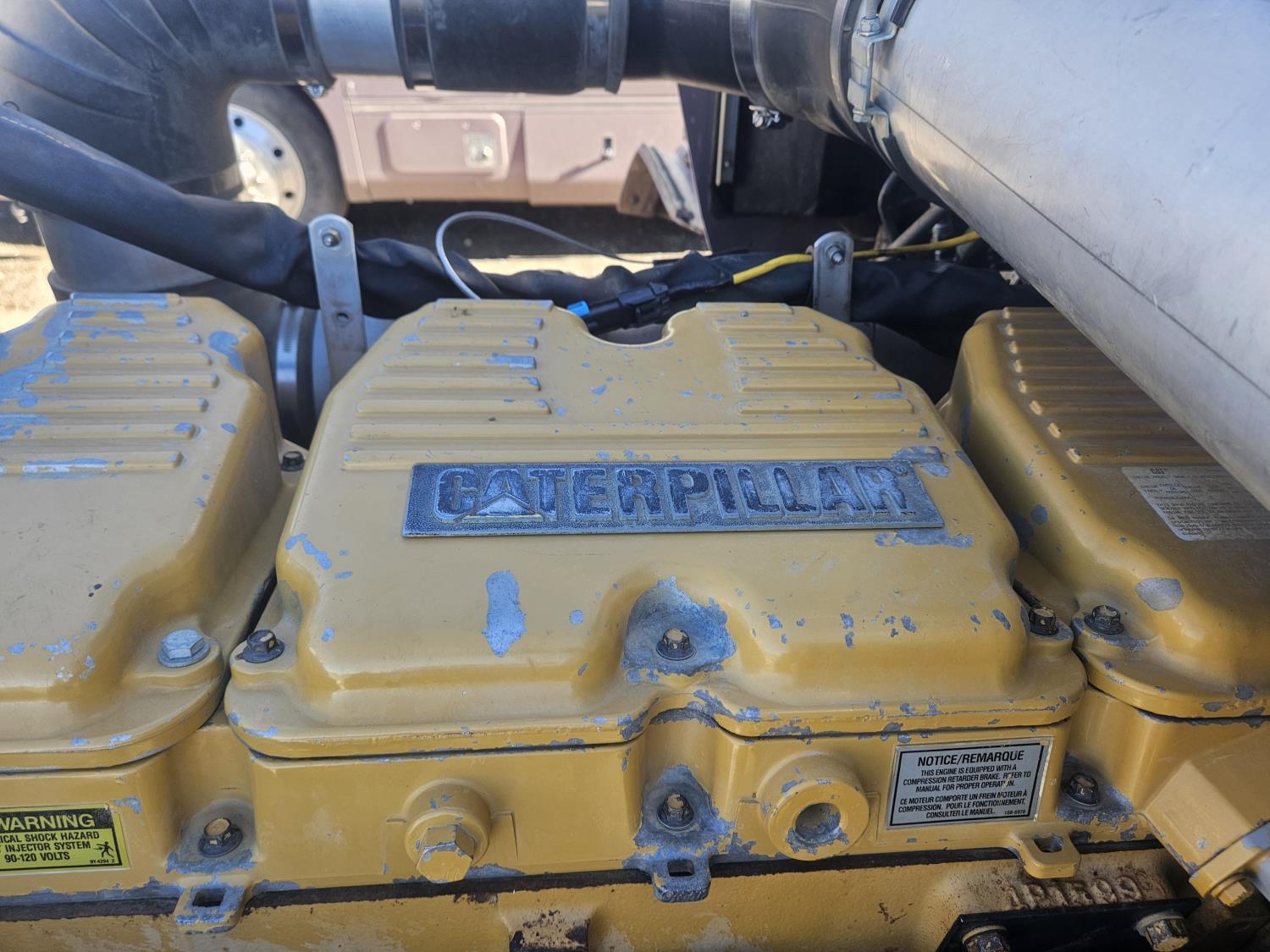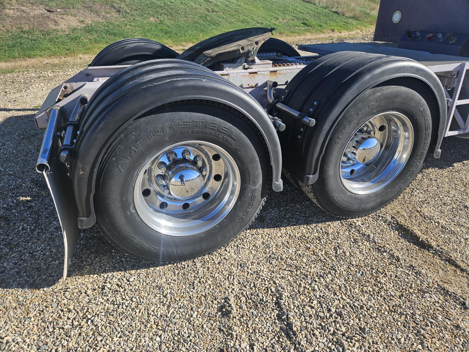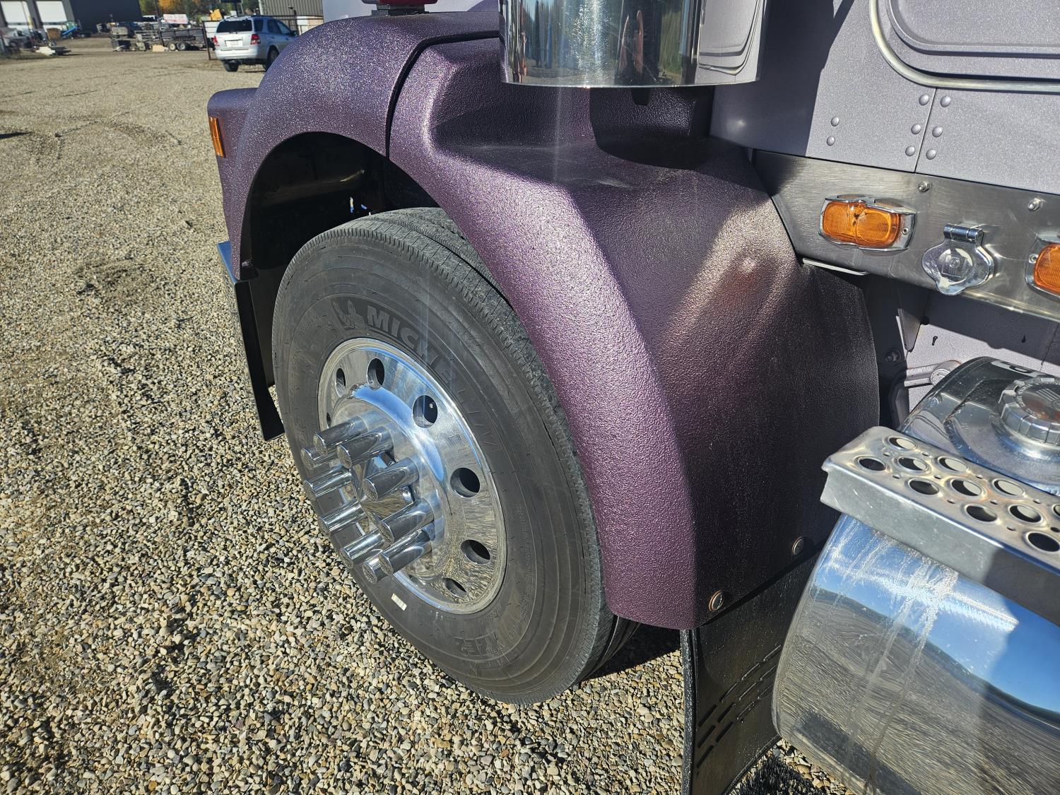 Caterpillar C-15 3406 single turbo 435 HP engine, 18 speed manual transmission, 2-way hyd system, beacon lights, rear moon fenders, engine brake , flat top 48 inch removeable, sleeper, A/C, leather interior, air ride seats, air ride suspension, 13,000 lb front axle, 46,000 lb rear axles, 3 way diff locks, all aluminum wheels, 11R24 tires