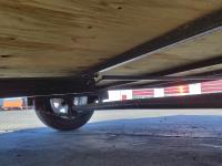 72 inch wide deck, wood deck, spring suspension, ball hitch, stake pockets, 2998 lb axles, 205/75R15 tires
