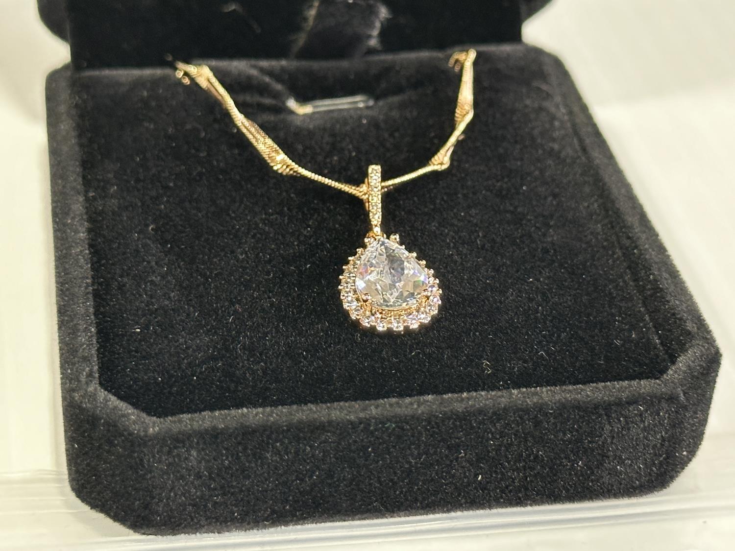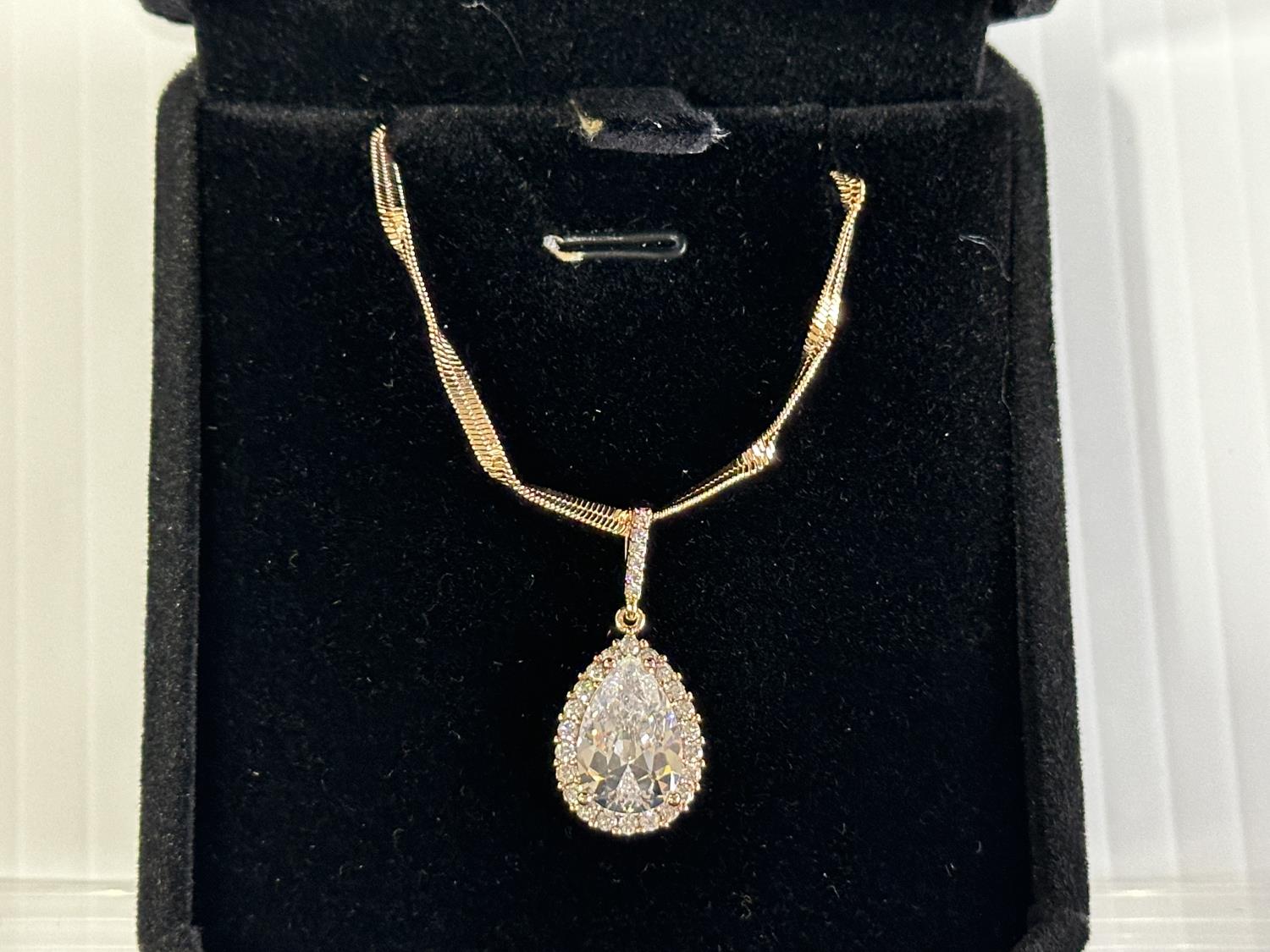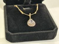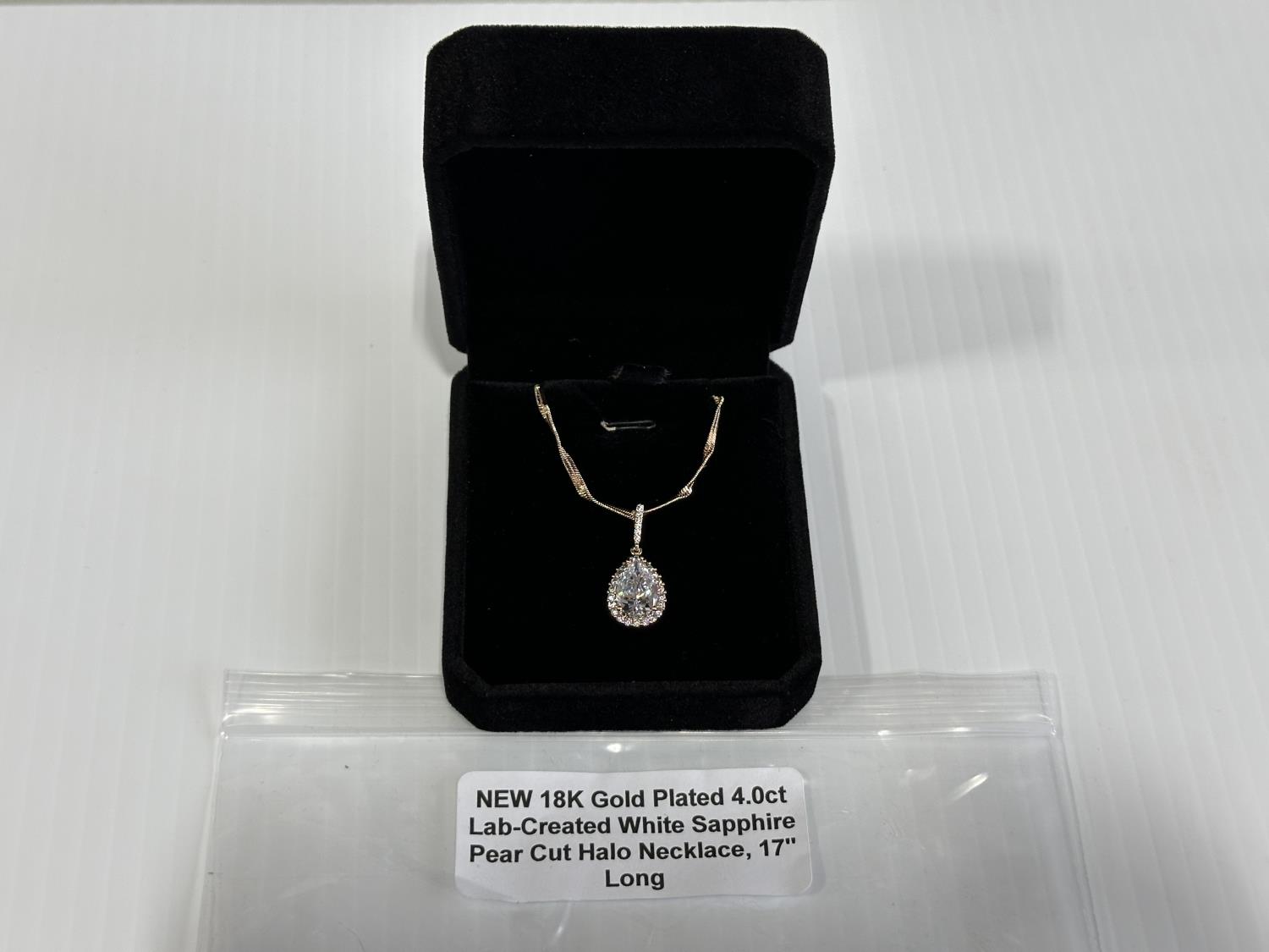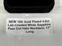 2109 18K Gold Plated 4.0Ct. Lab Created White Sapphire Pear Cut Halo Necklace (Unused)