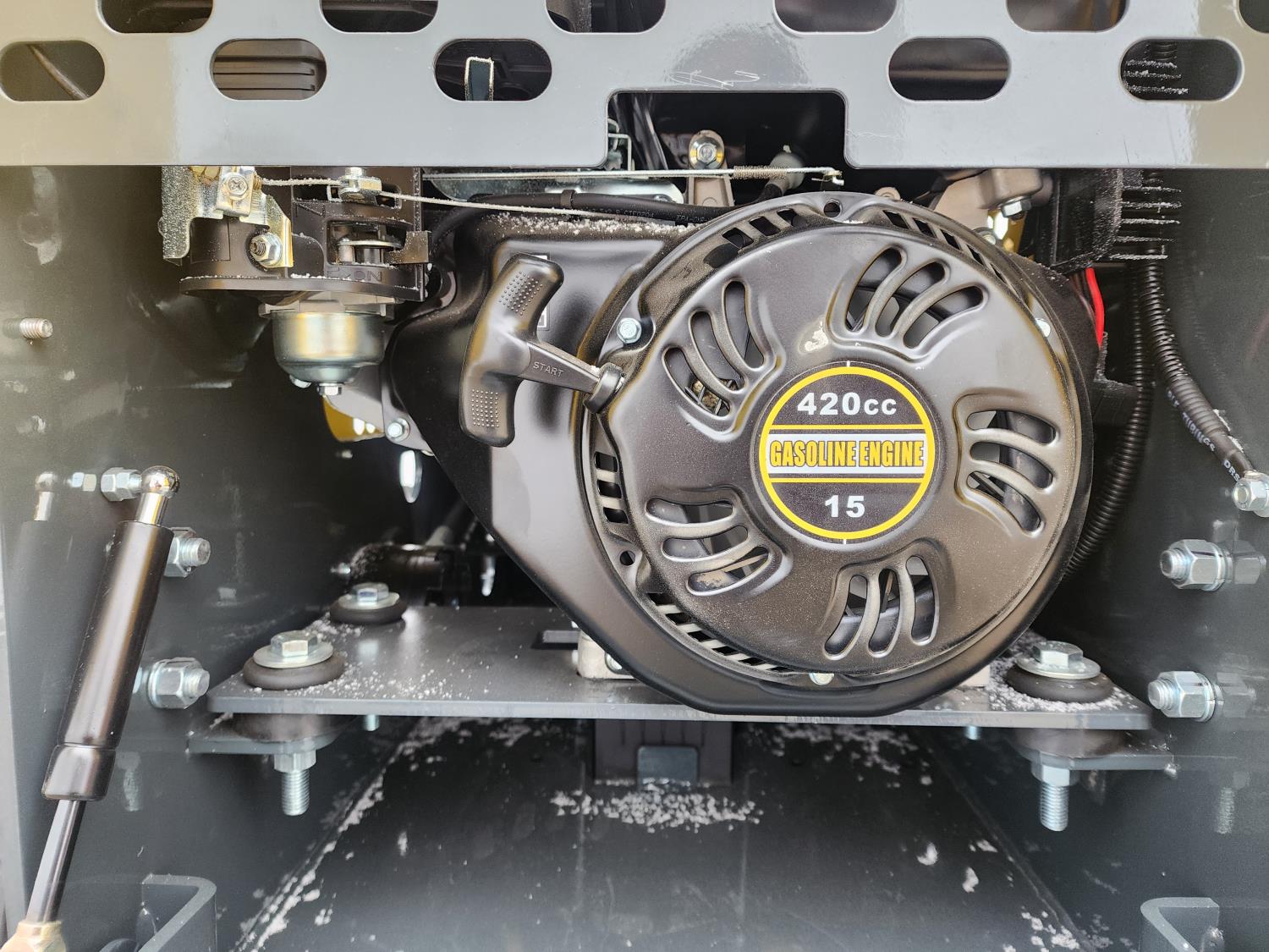 Open station, 420CC gas engine, 38 inch smooth bucket, manual coupler, 1 auxiliary hydraulics, 6 inch rubber tracks