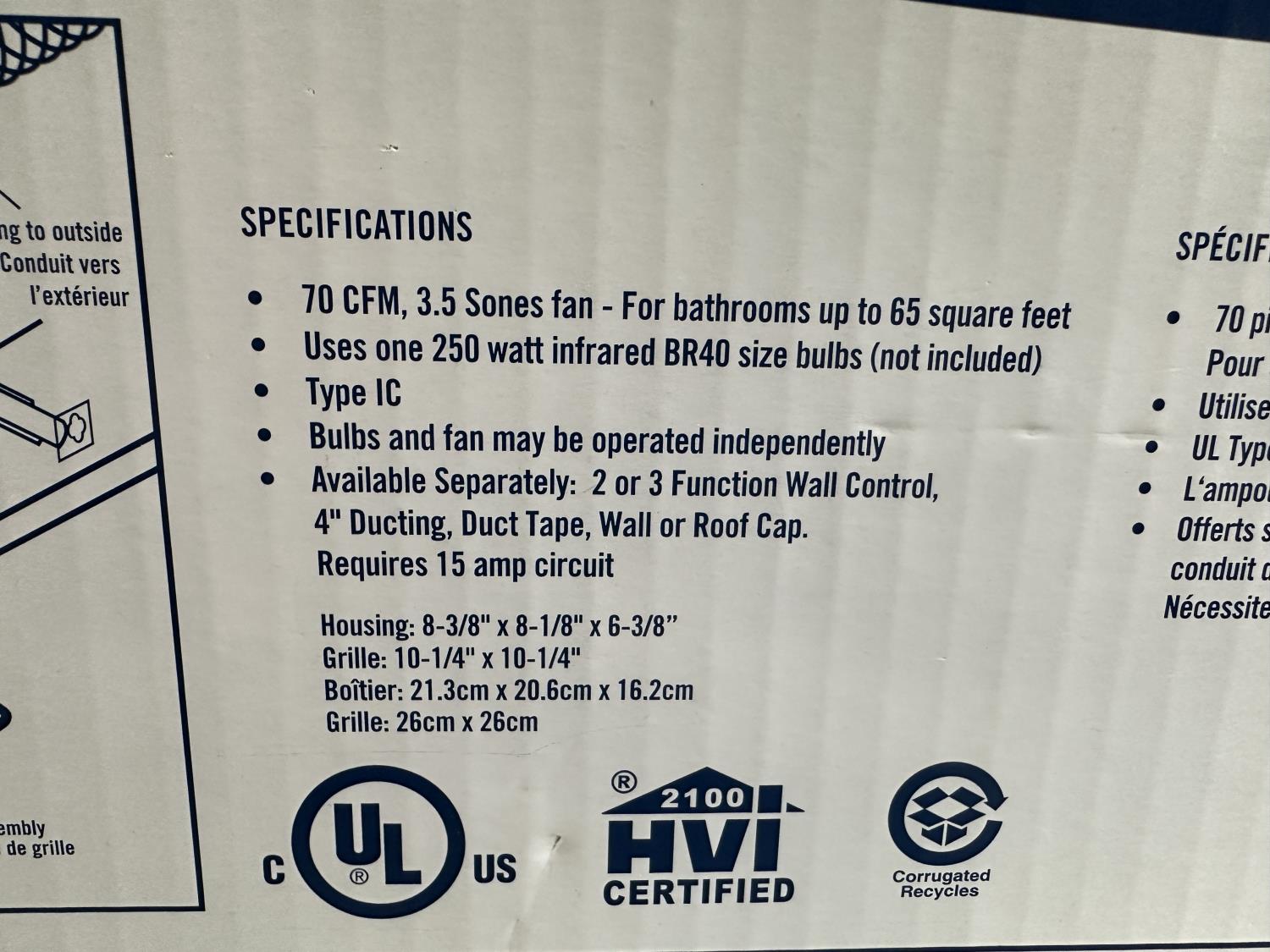 1108 Broan Ventilation Fan with Bulb Heater (Unused)