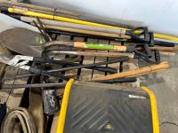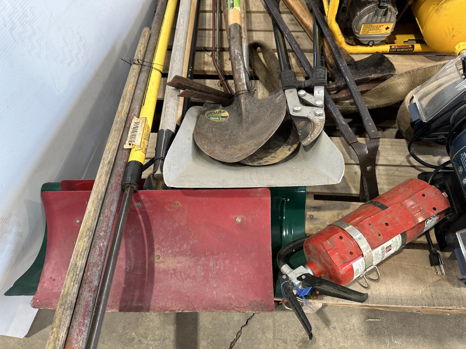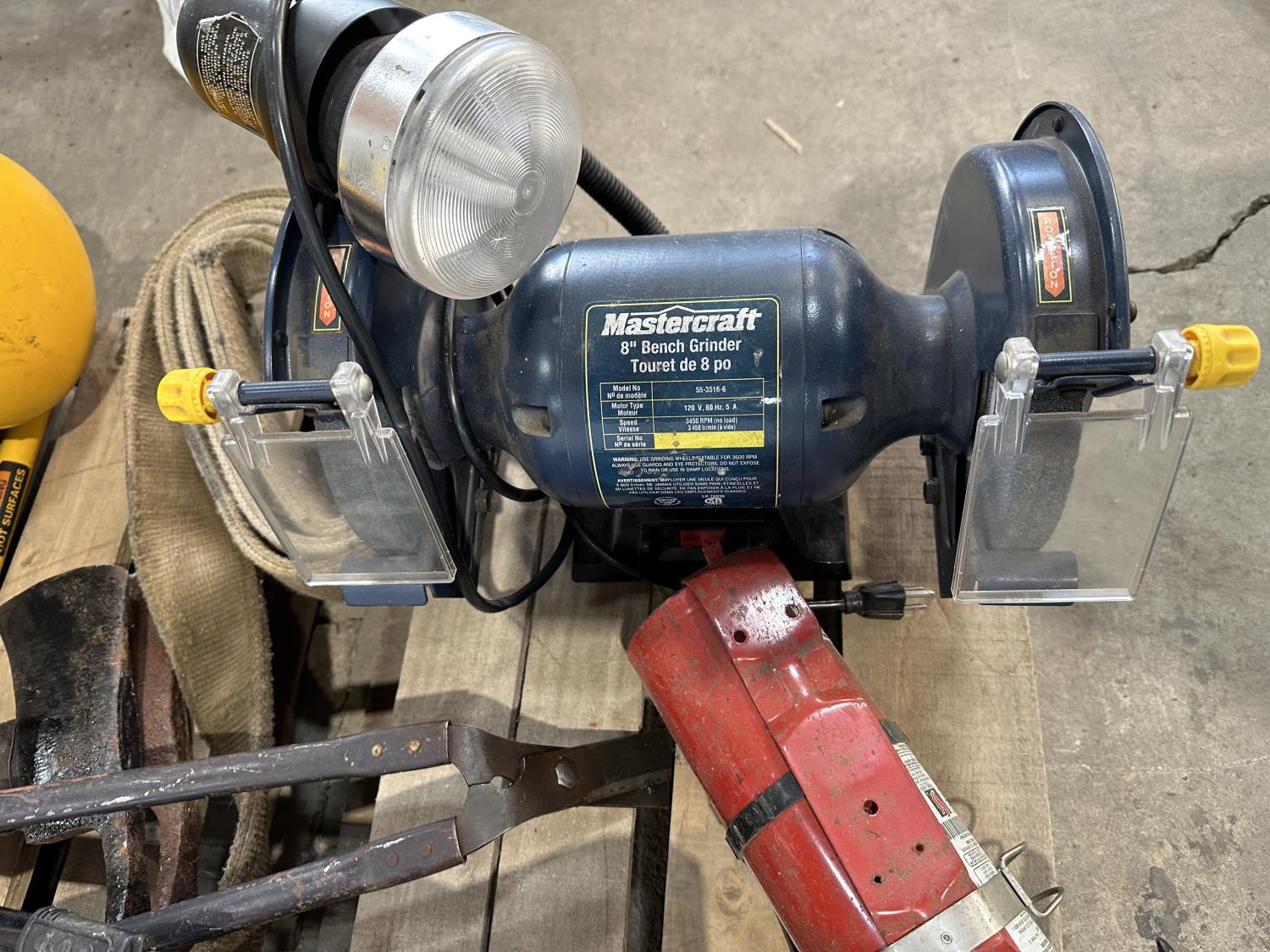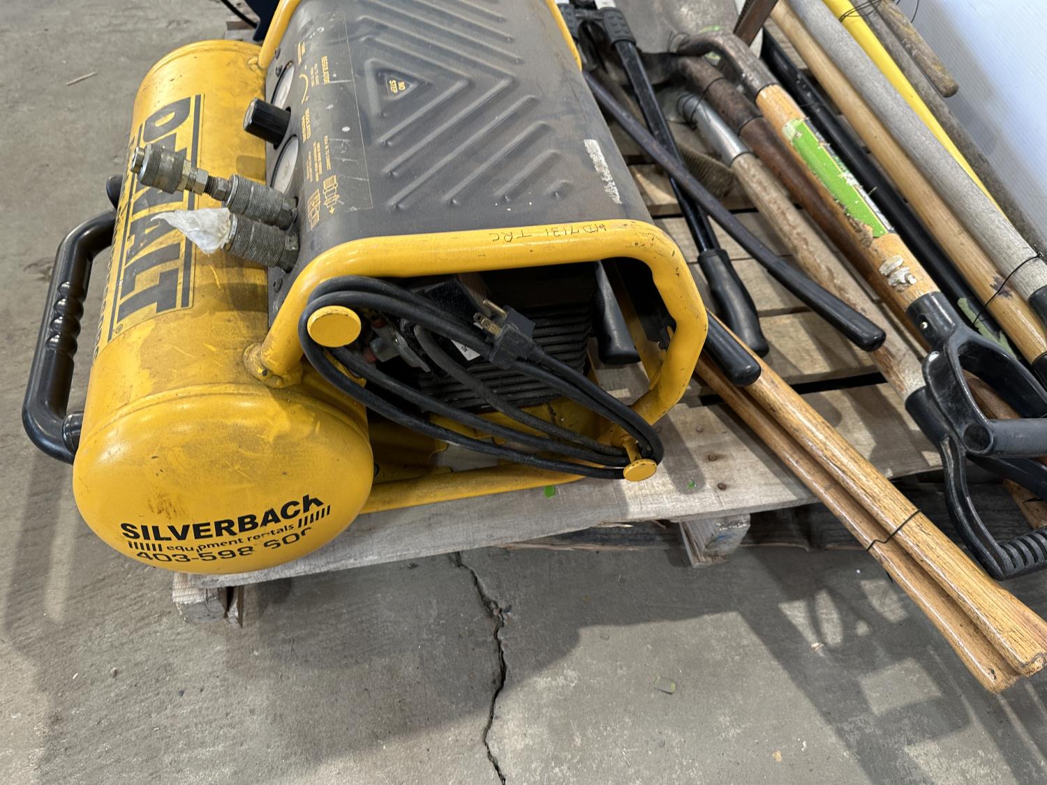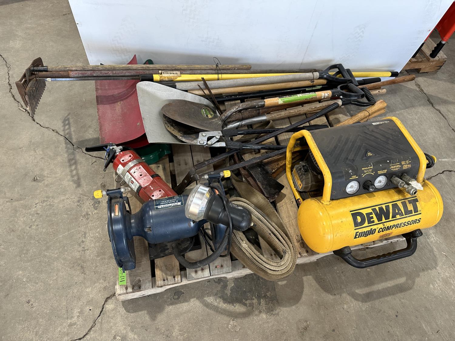 1343 DeWalt Air Compressor, Mastercraft 8 Inch Bench Grinder, Qty of Garden Tools and Sling