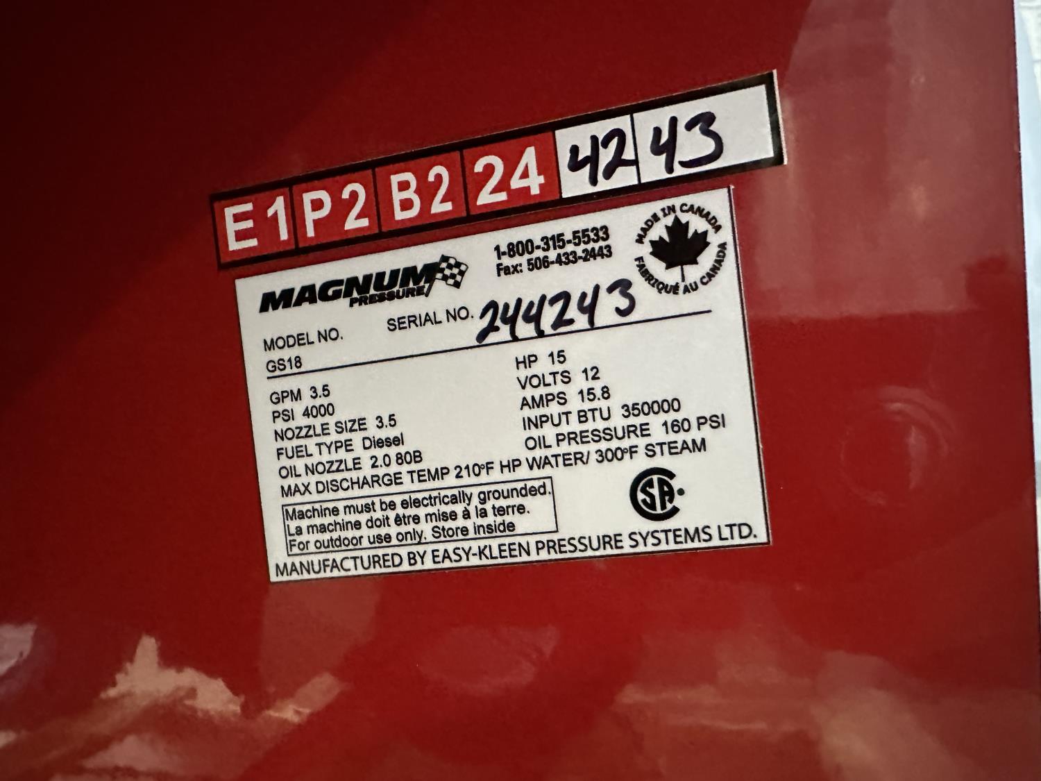 3.5 GPM at 4000 PSI, 15 HP, gasoline engine, electric start, 12 volt burner, oil/diesel fired burned/thermostat, schedule 80 coil with stainless steel housing, fully welded, powder coated frame, 10 gallon poly fuel tank
