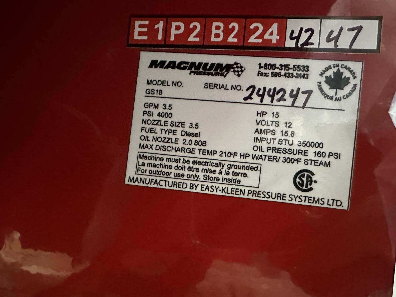 3.5 GPM at 4000 PSI, 15 HP, gasoline engine, electric start, 12 volt burner, oil/diesel fired burned/thermostat, schedule 80 coil with stainless steel housing, fully welded, powder coated frame, 10 gallon poly fuel tank