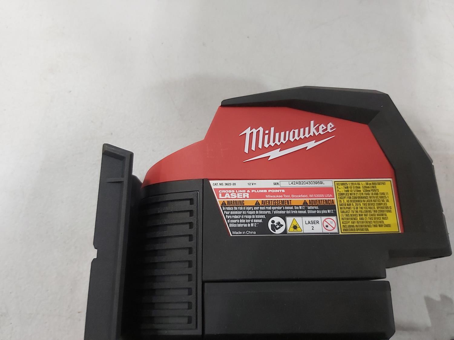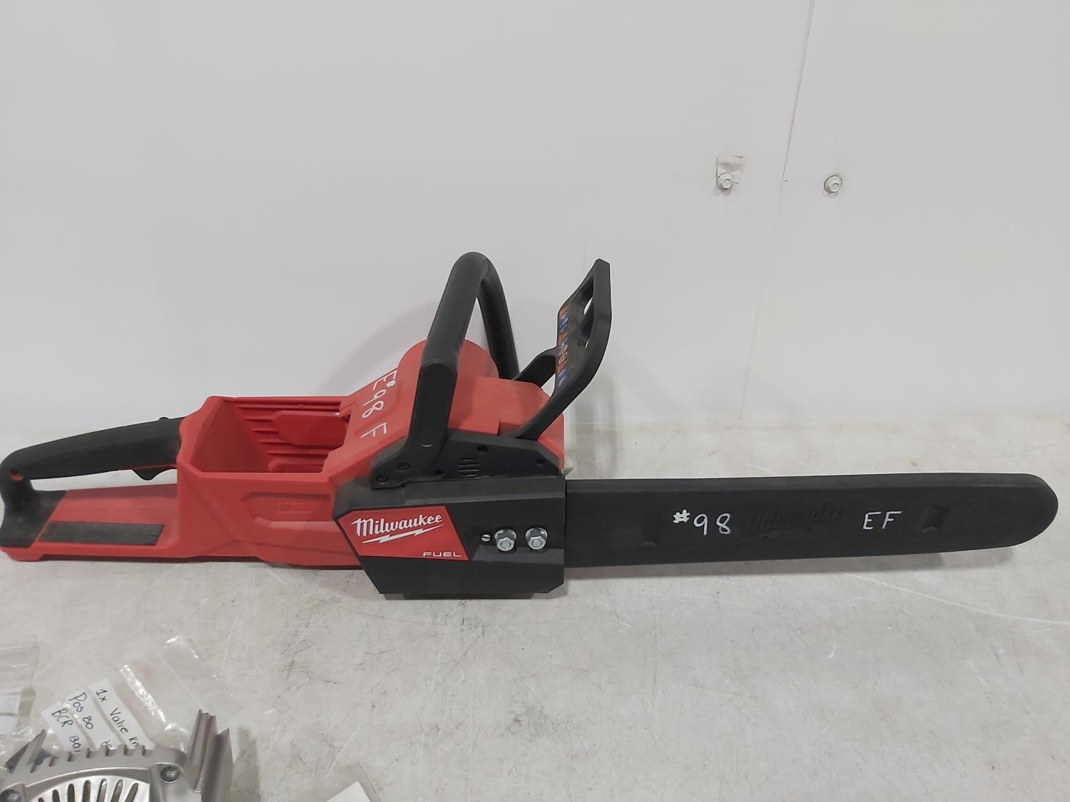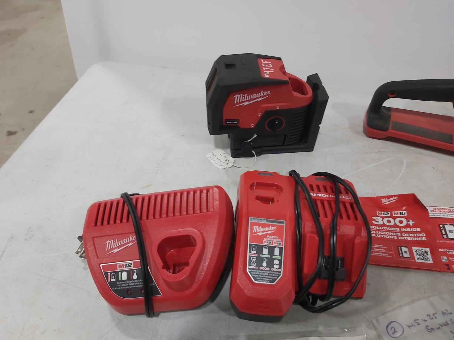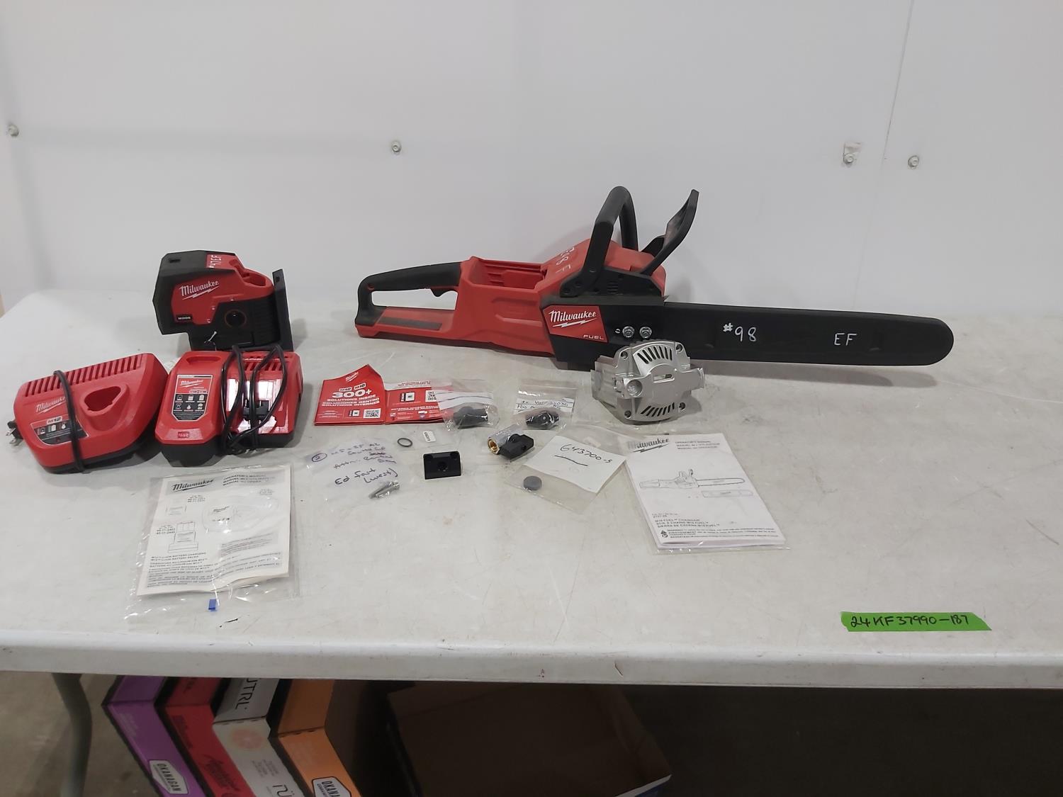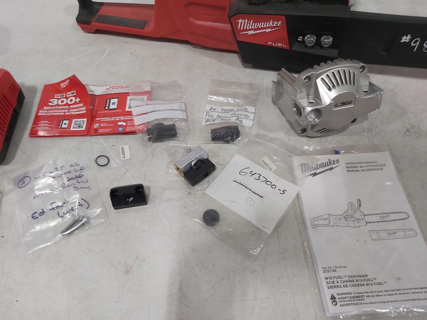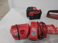 1473 Milwaukee M18 Cordless Chainsaw, (2) Battery Chargers, M12 Laser, Misc Parts (Unused)