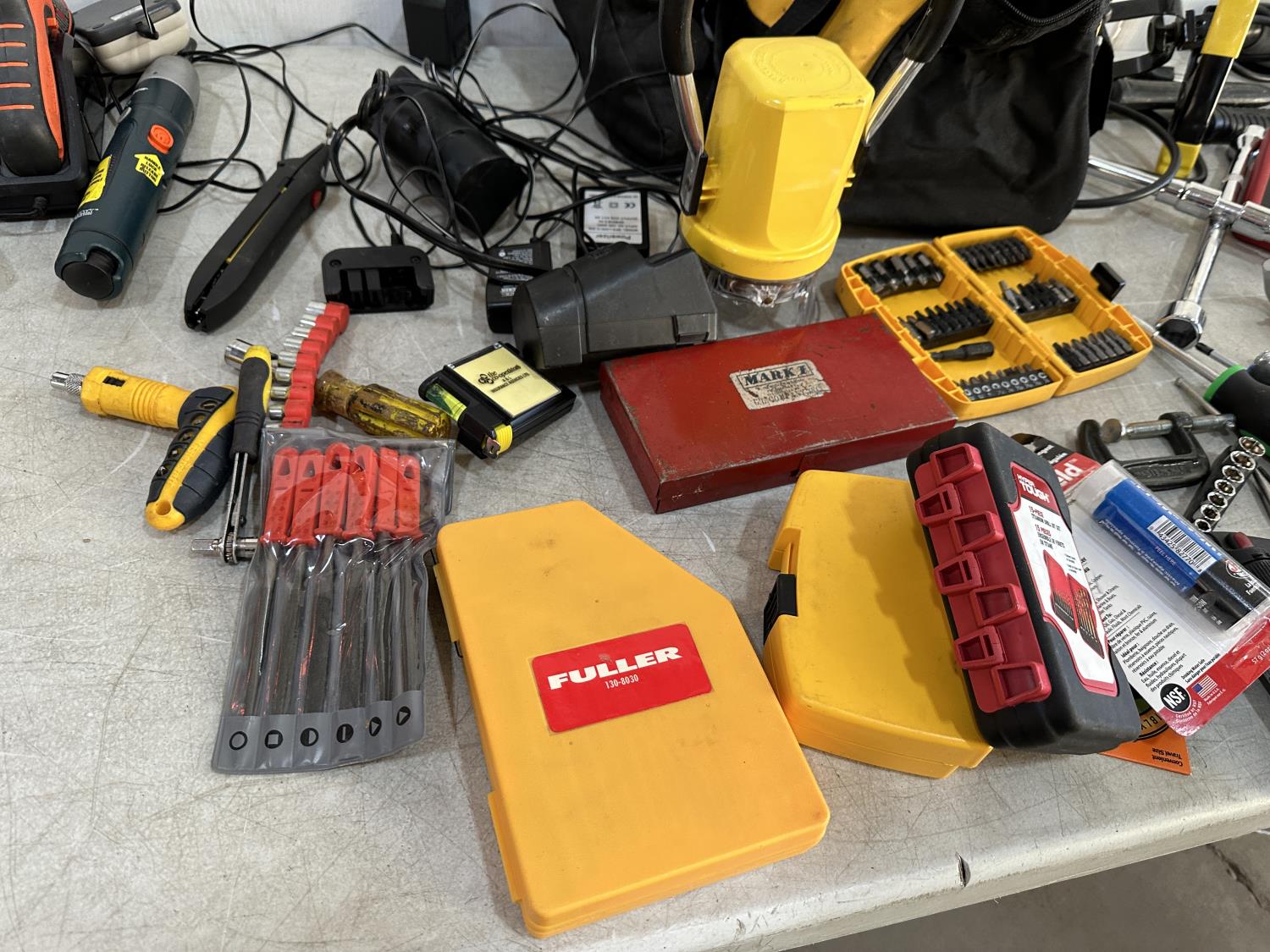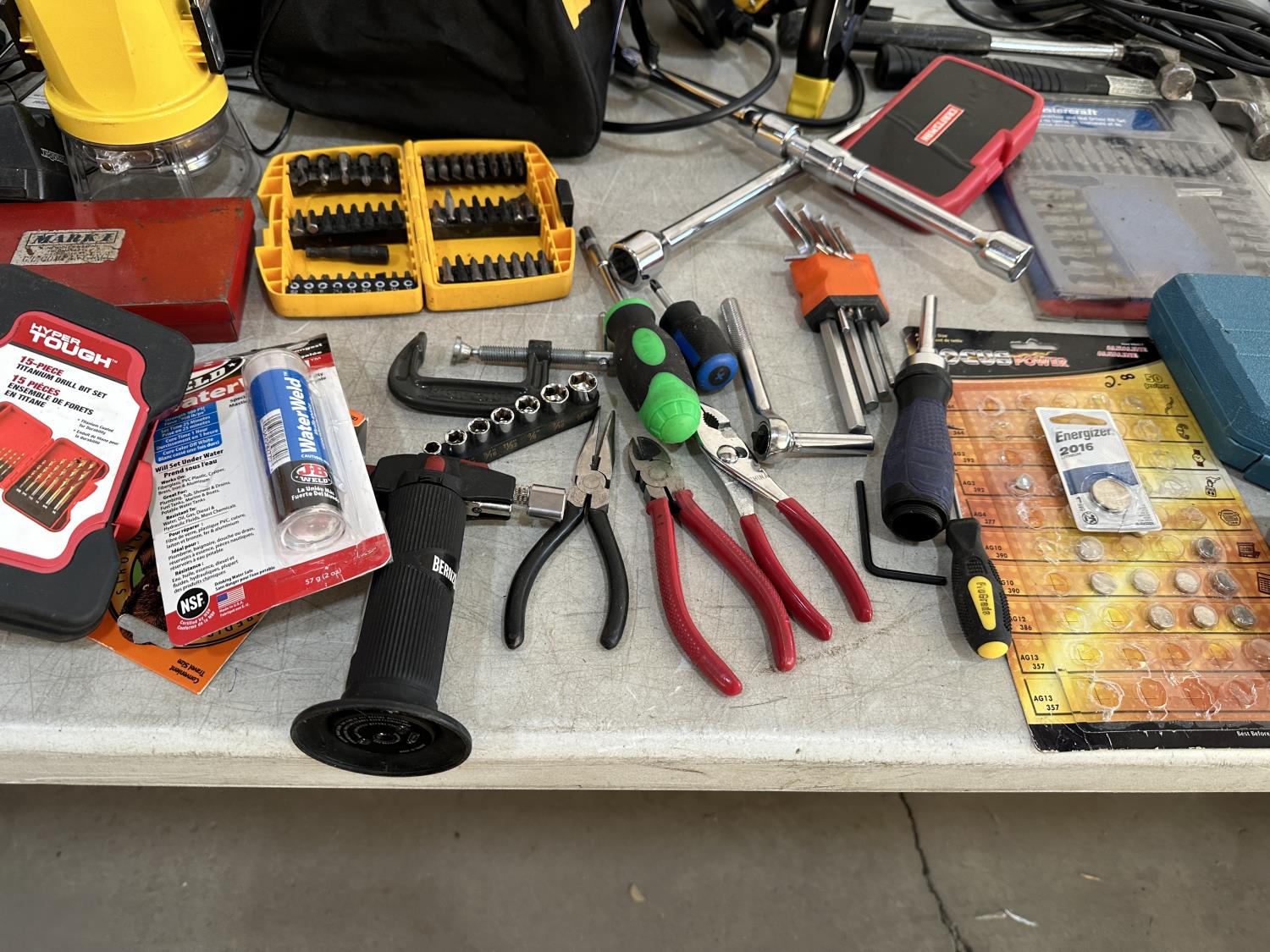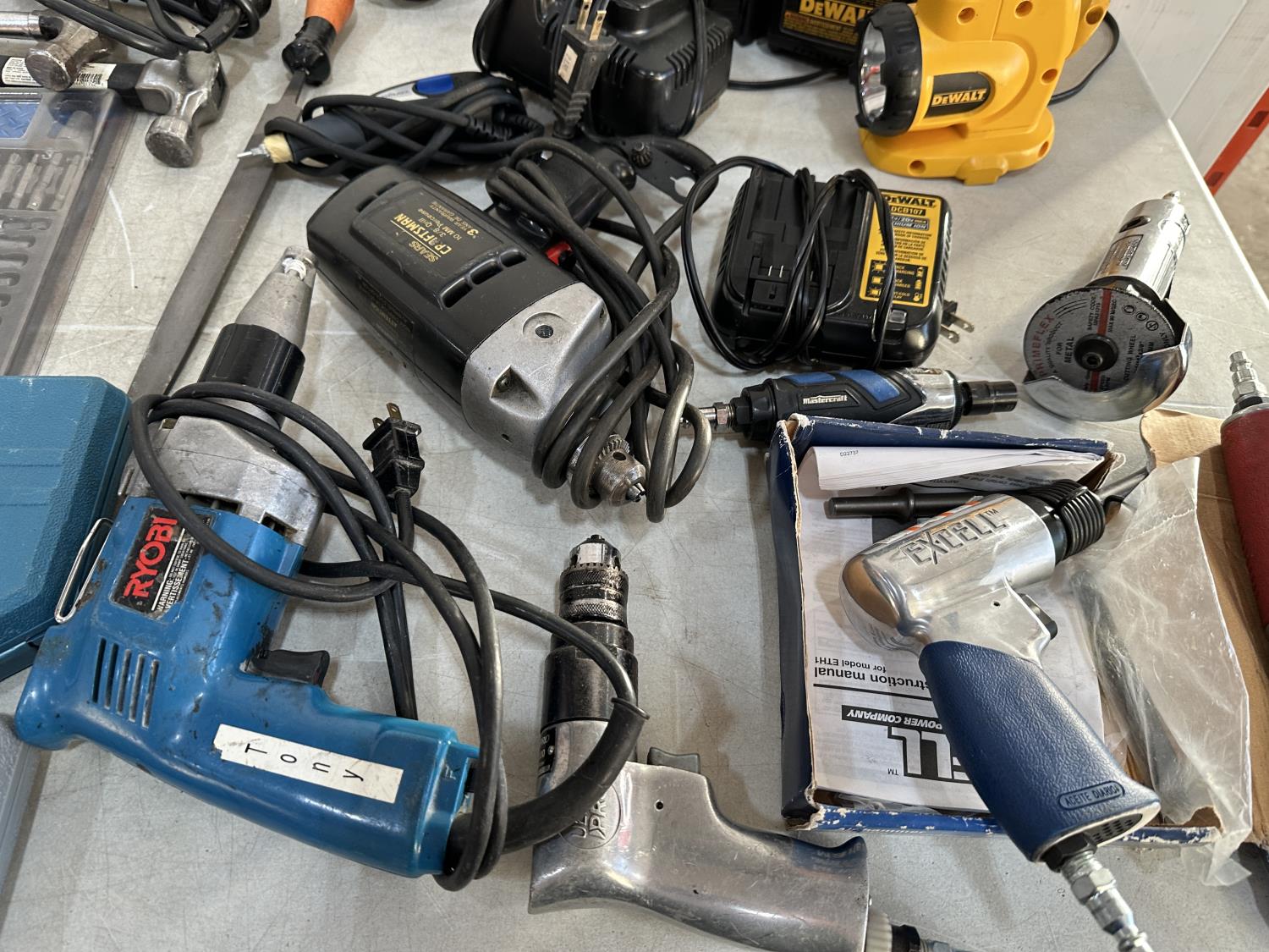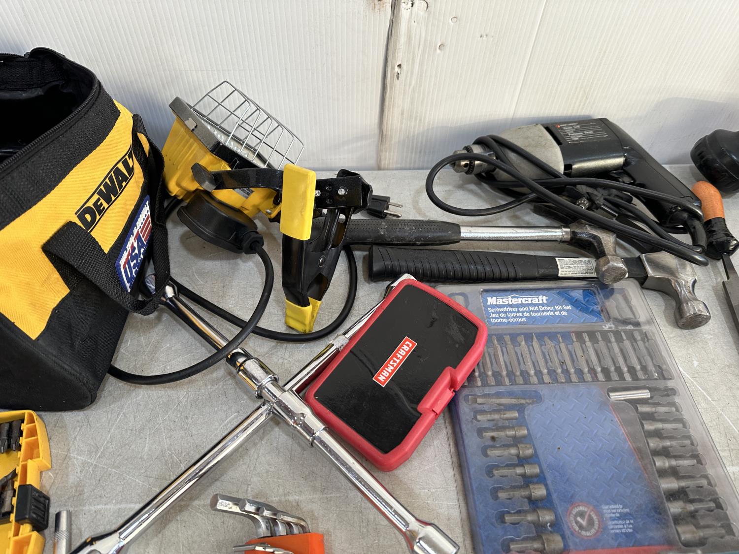 Hand tools, power tools, torch, screwdrivers, drill, work light, air tools