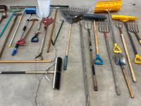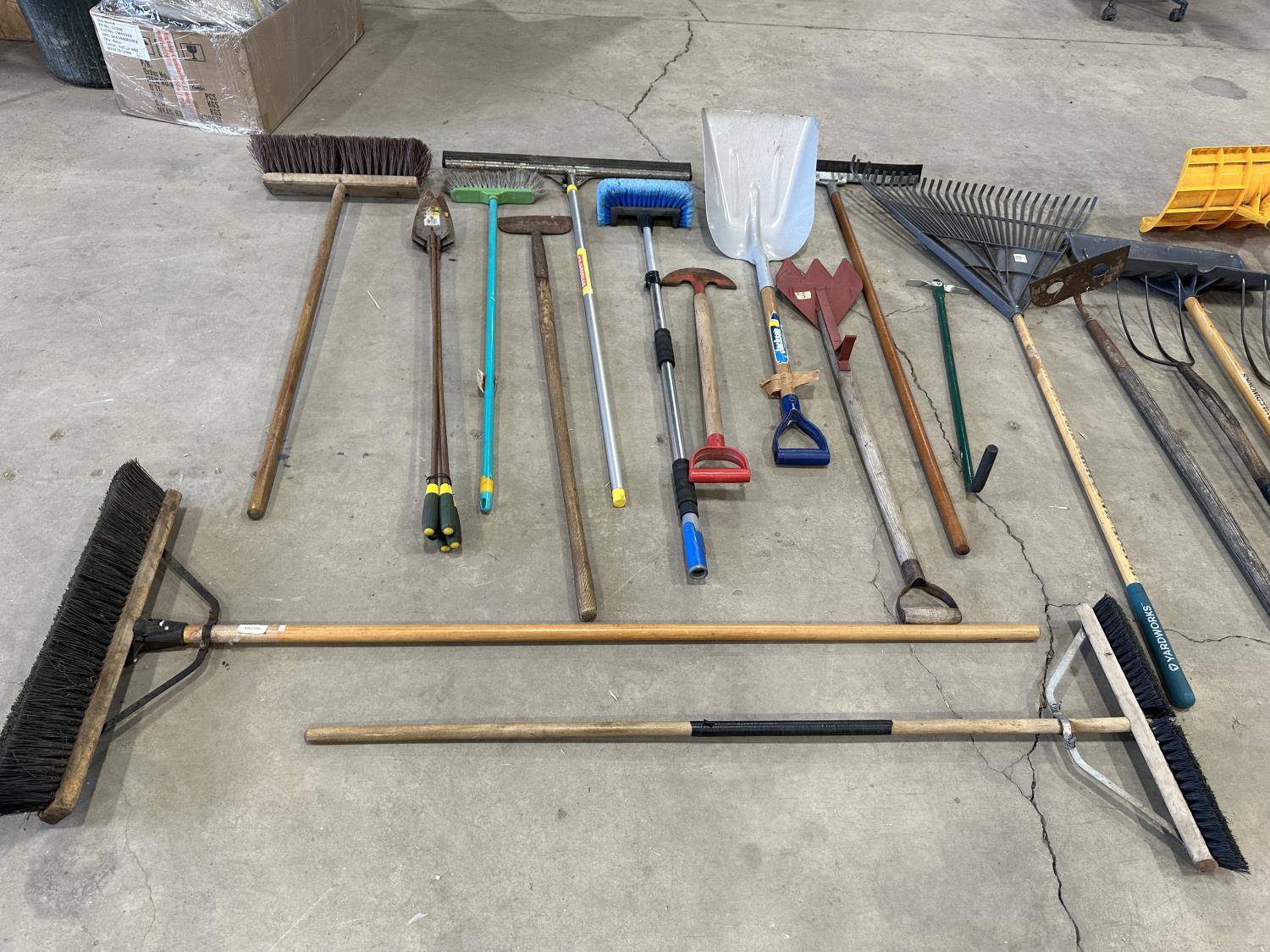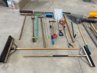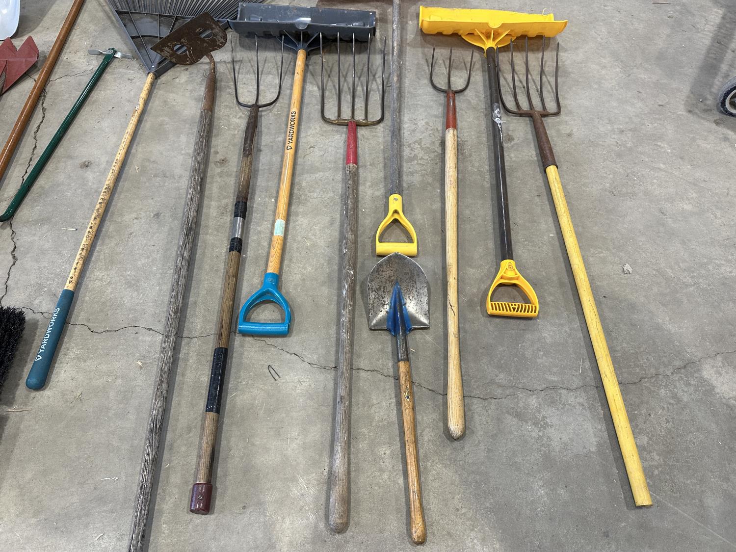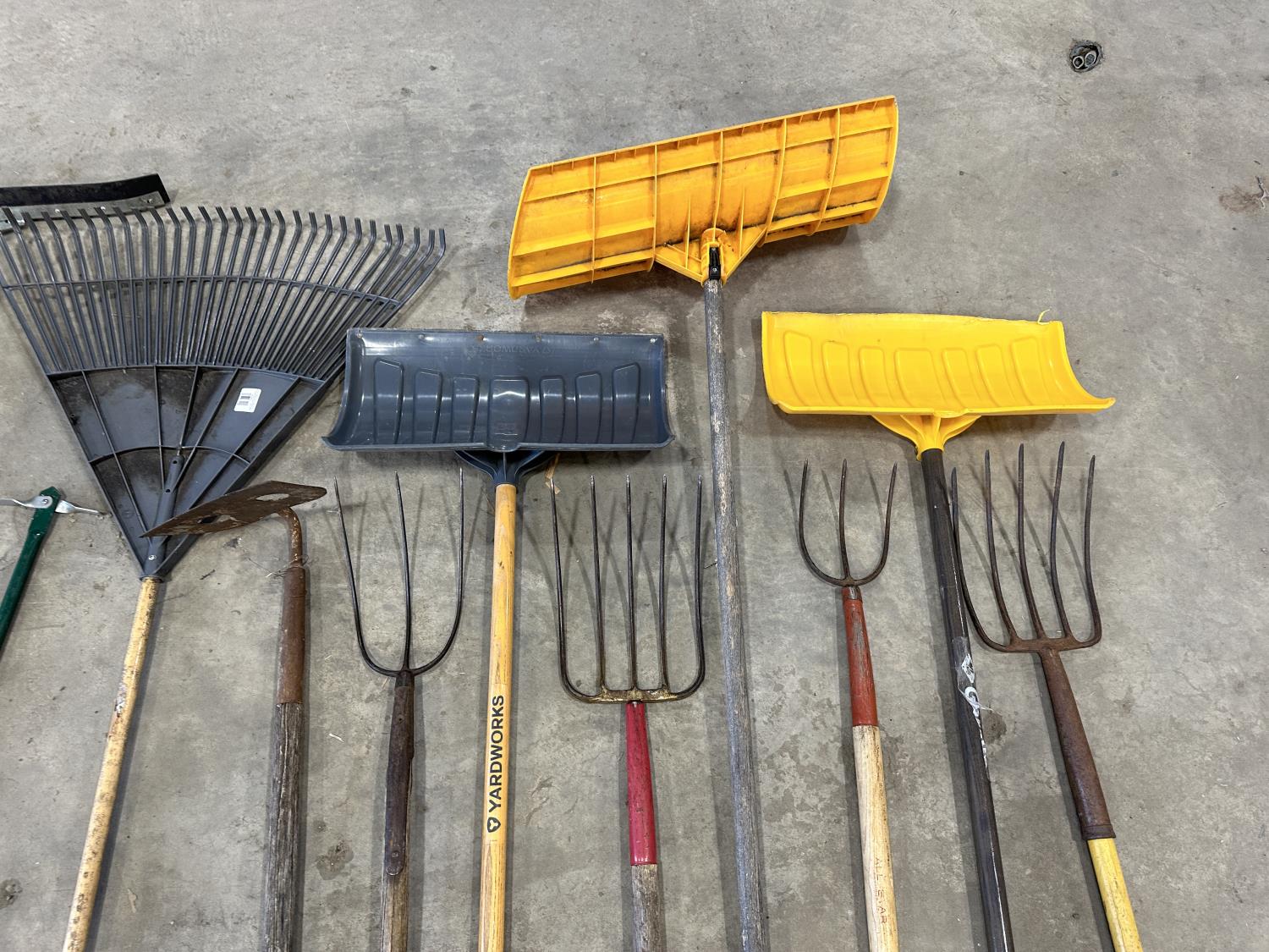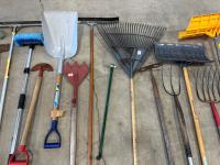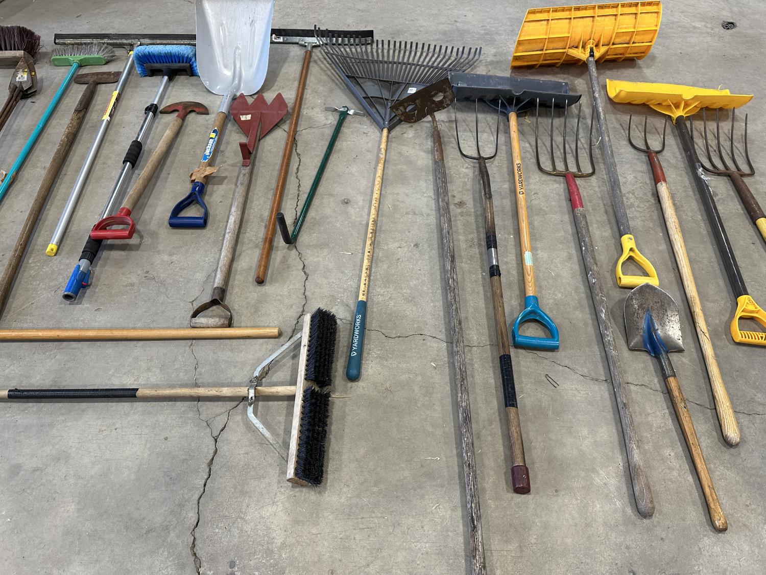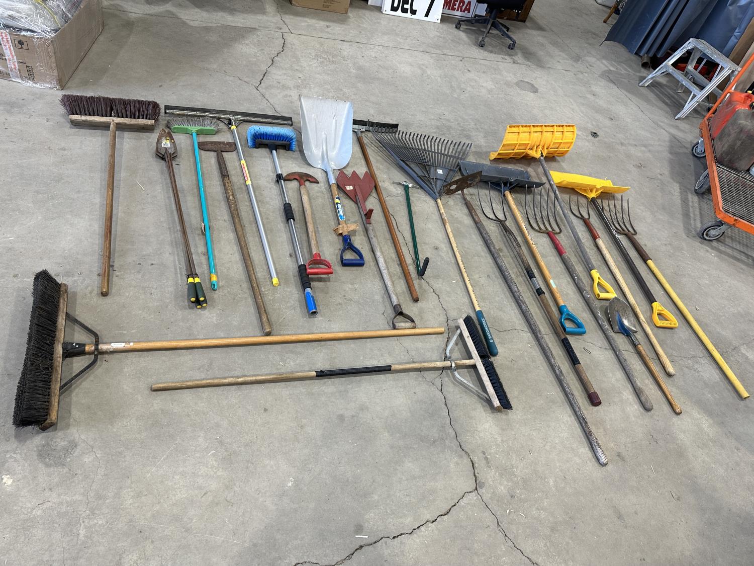 (3) snow shovels, (4) pitch forks, (4) brooms, (2) squeegees, grain shovel