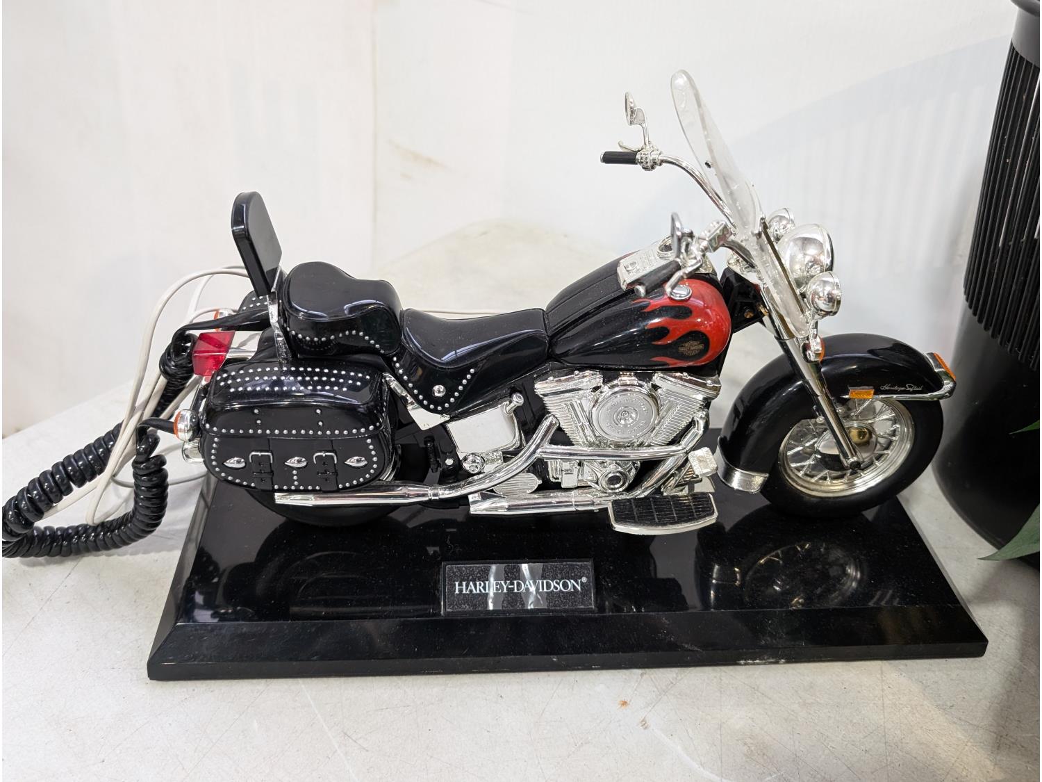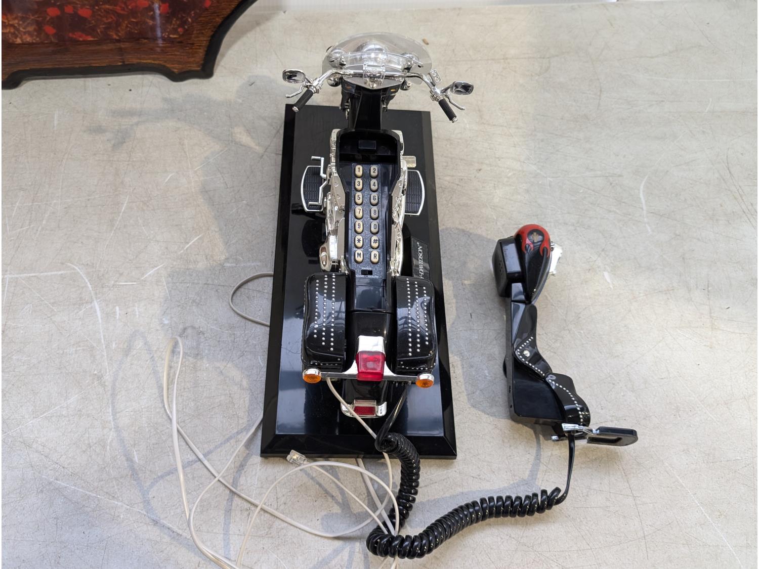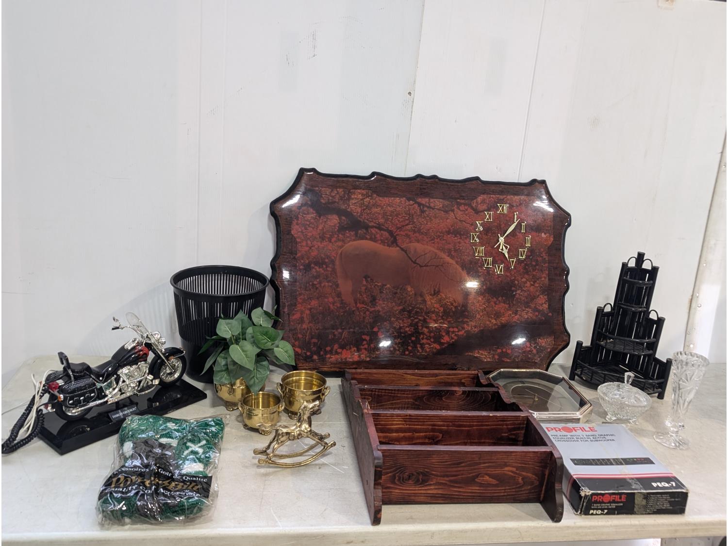 Clocks, shelves, brass ornaments, Harley-Davidson phone