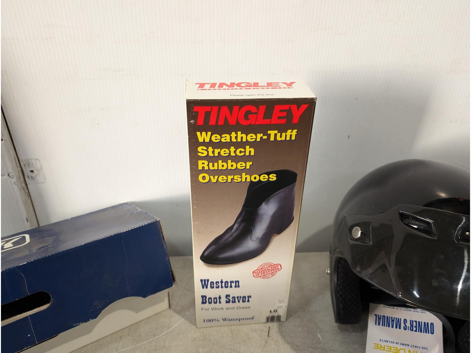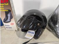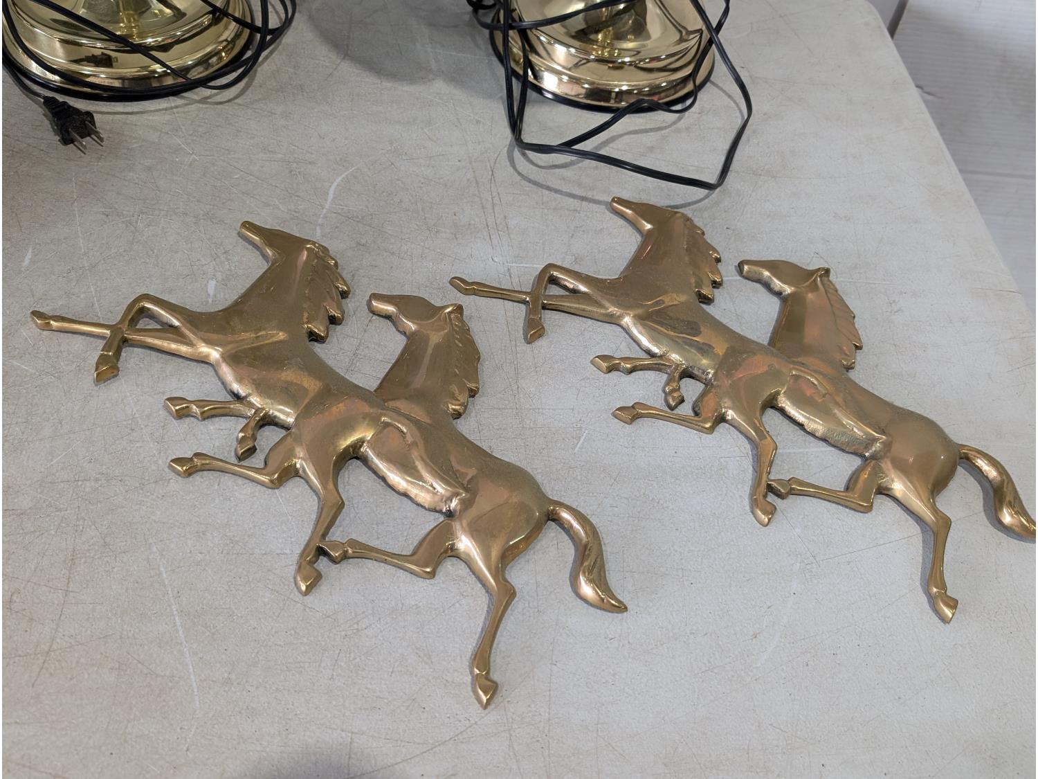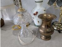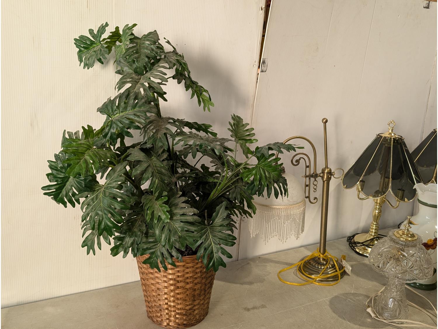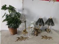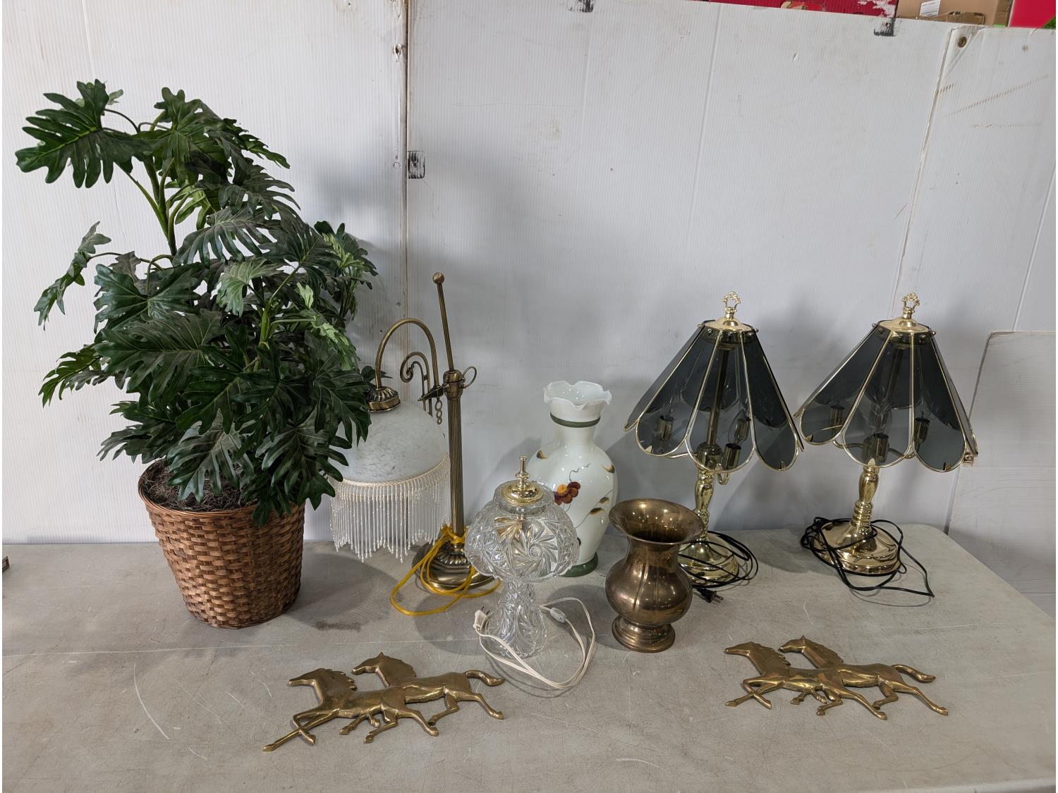 Artificial plant, (4) lamps, vase, (2) horse brass wall hangings, shoe covers, helmet, overshoes, ice cleats