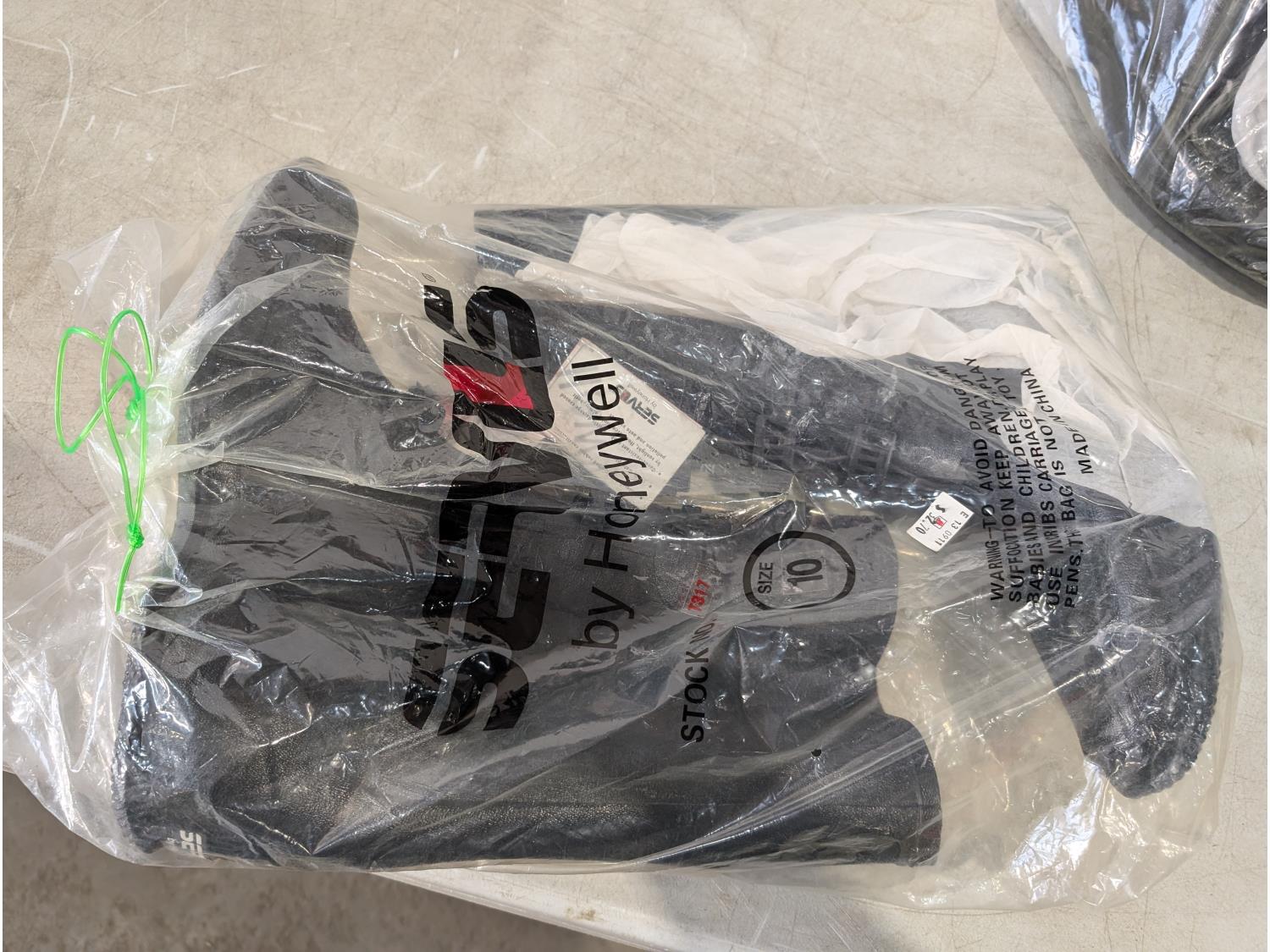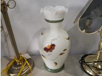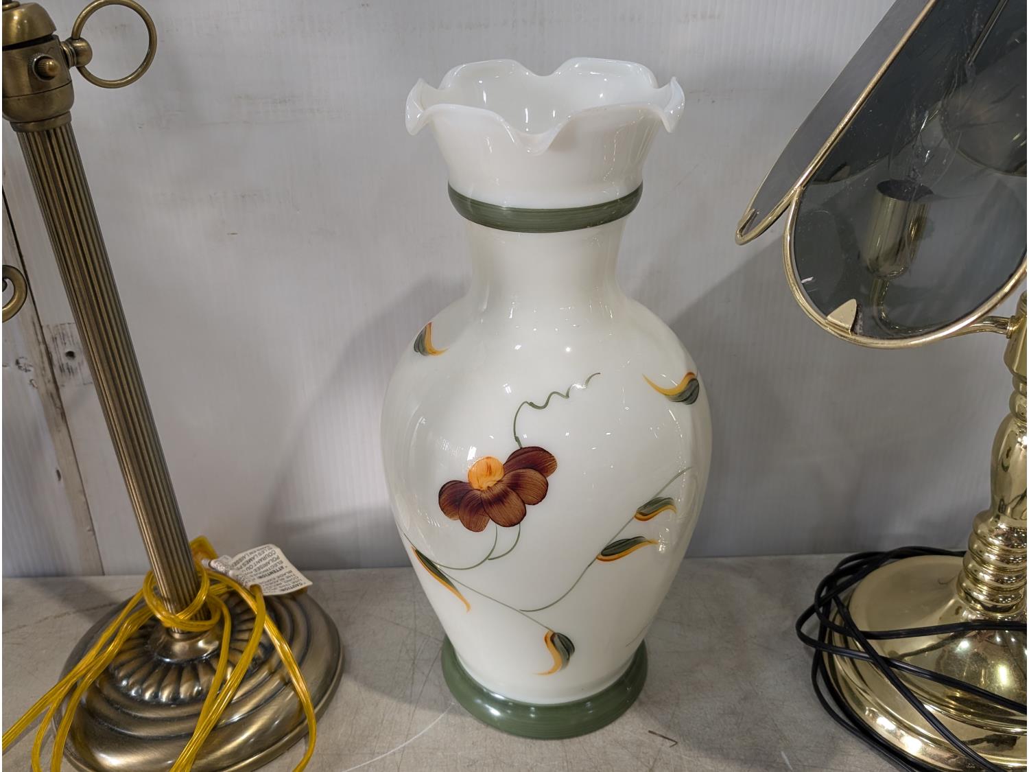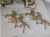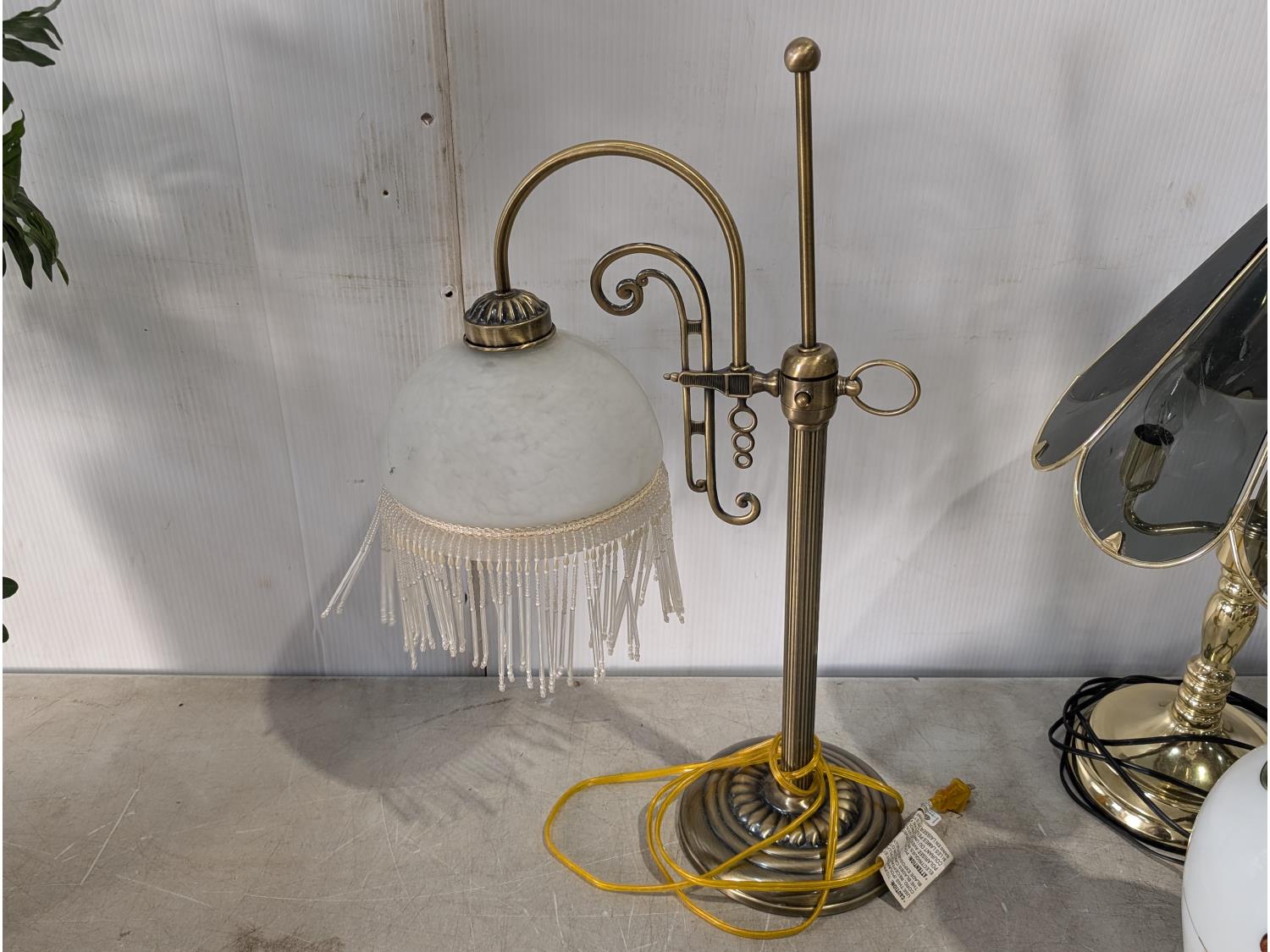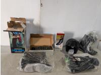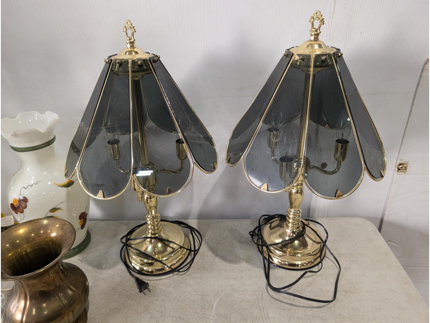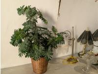 Artificial plant, (4) lamps, vase, (2) horse brass wall hangings, shoe covers, helmet, overshoes, ice cleats