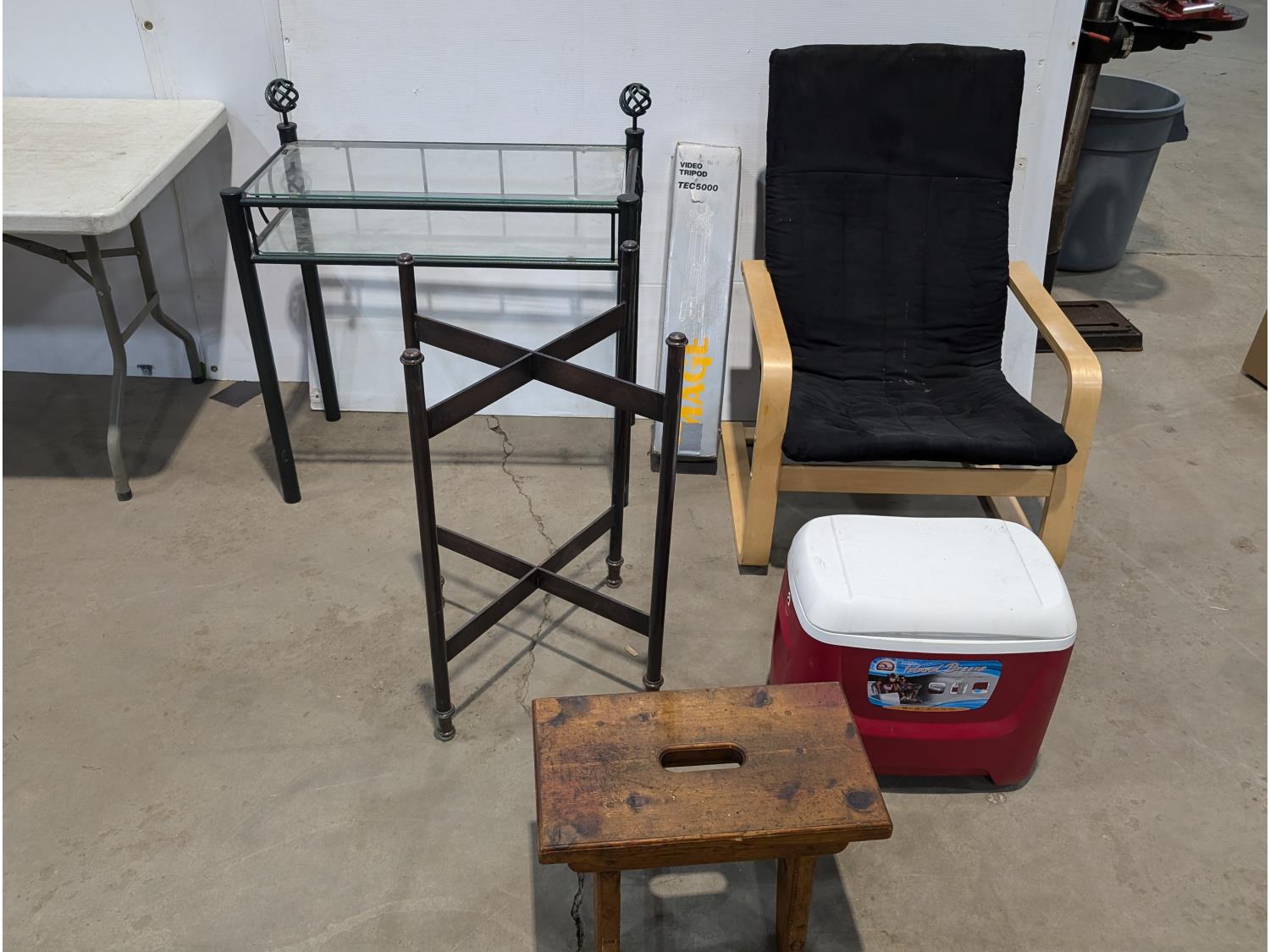 Glass end table, chair, cooler, stool, video tripod, end table stand (no top)