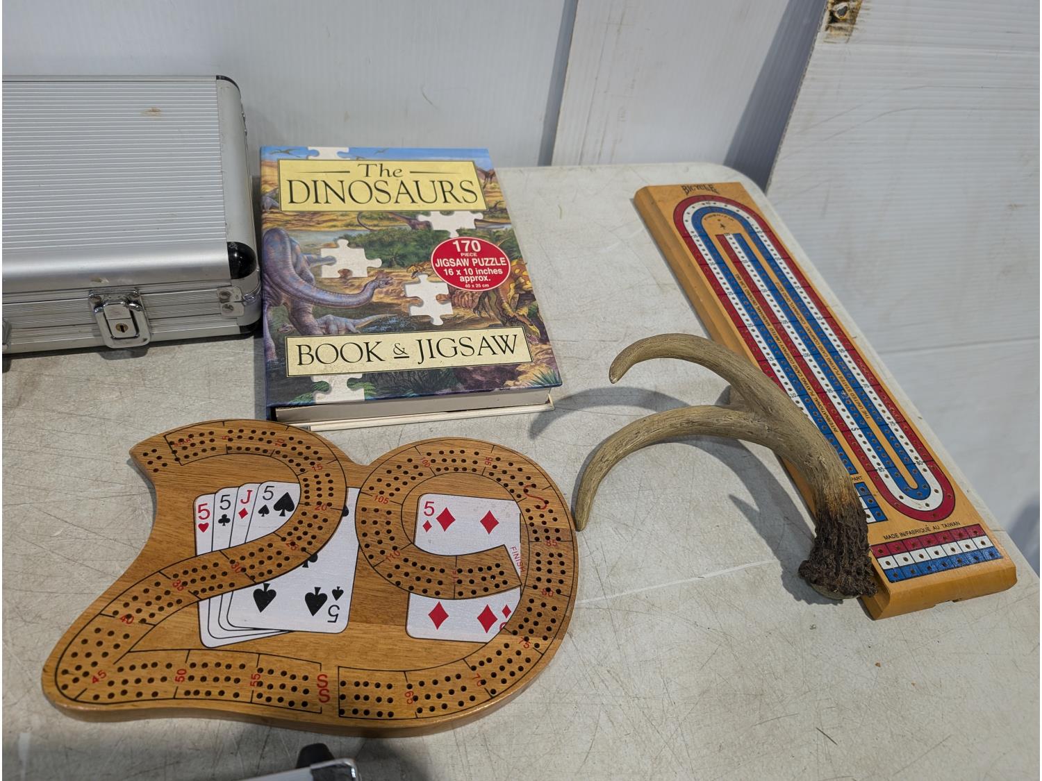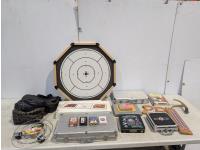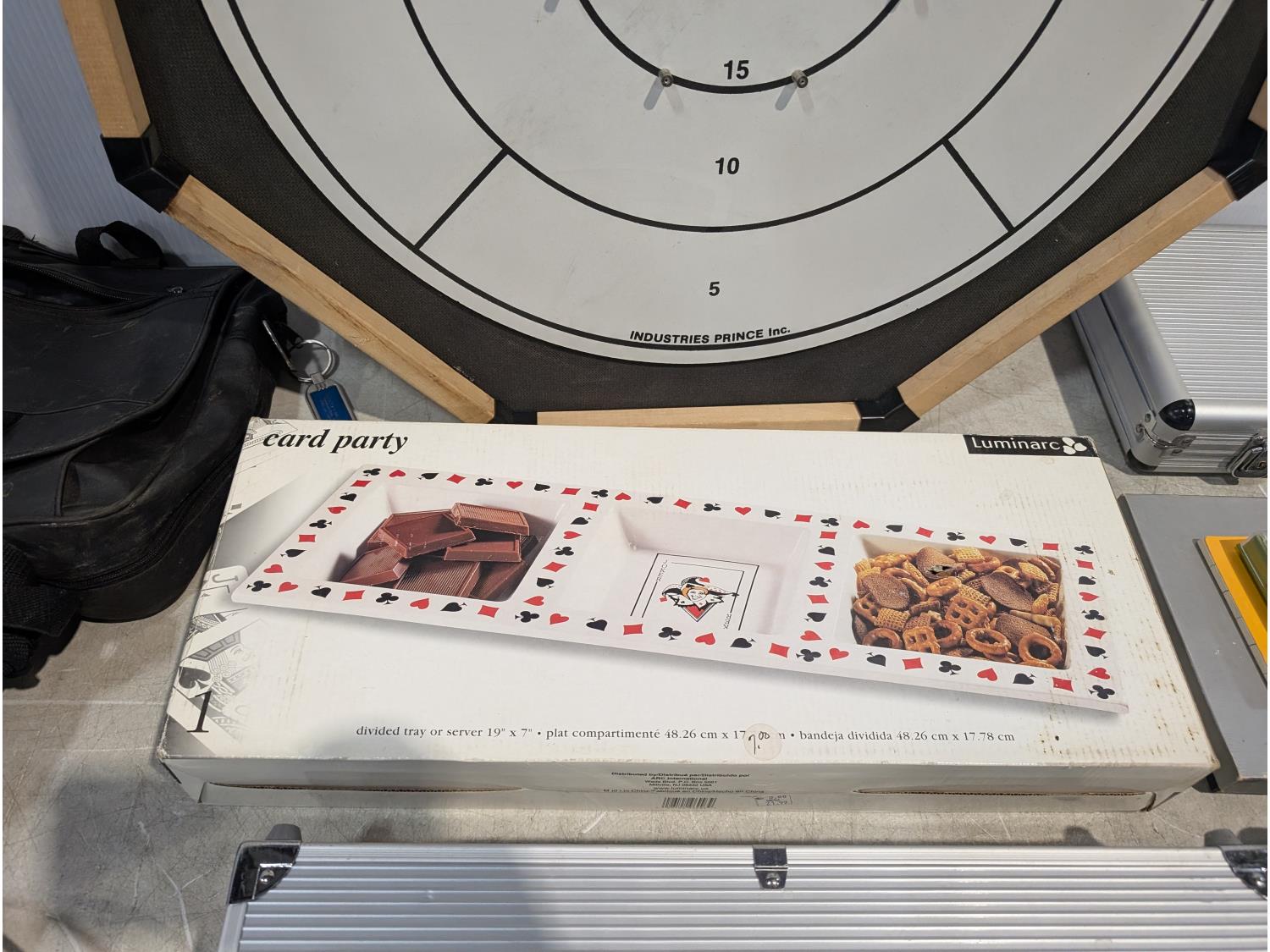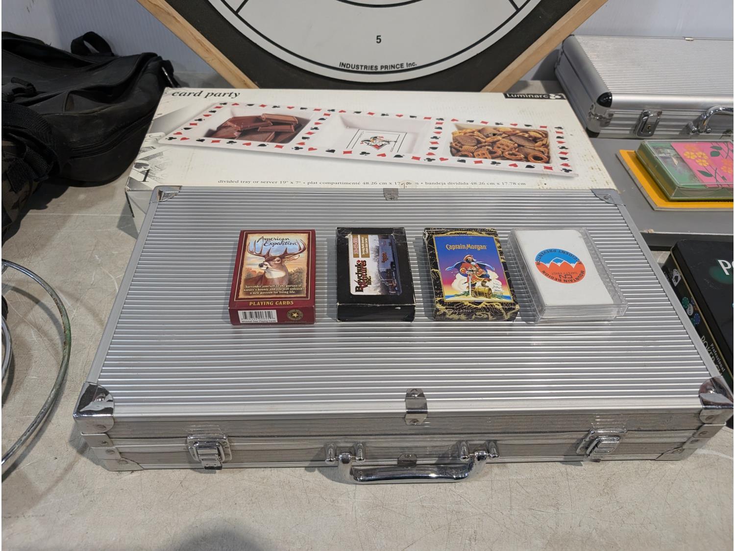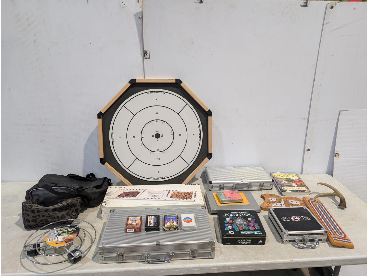 Sony CD player, Samsung DVD player, crokinole board, cribbage boards, poker chips, cards