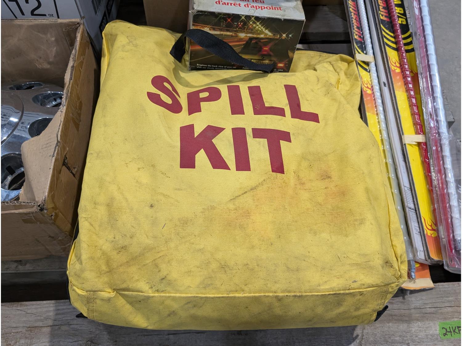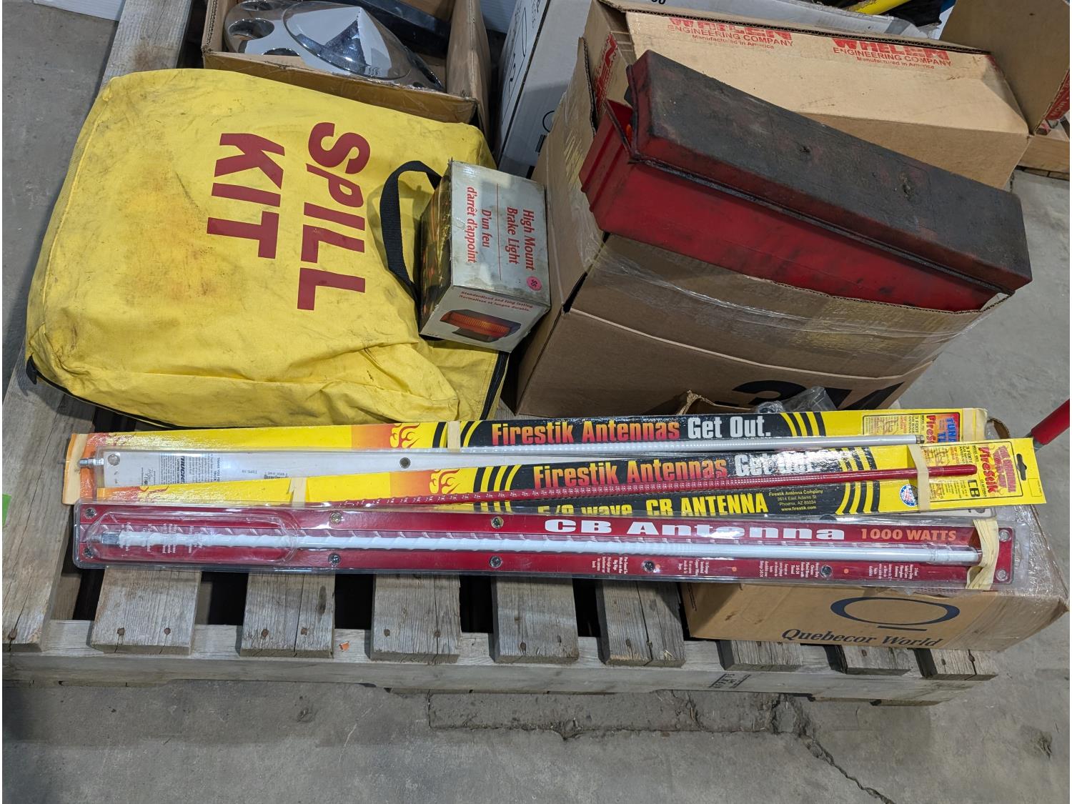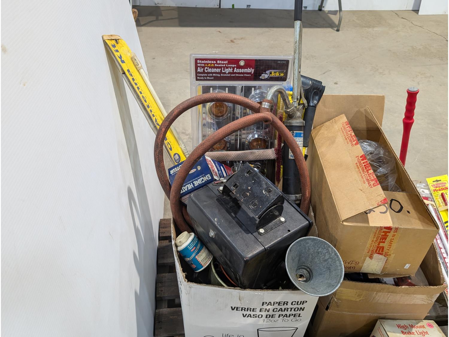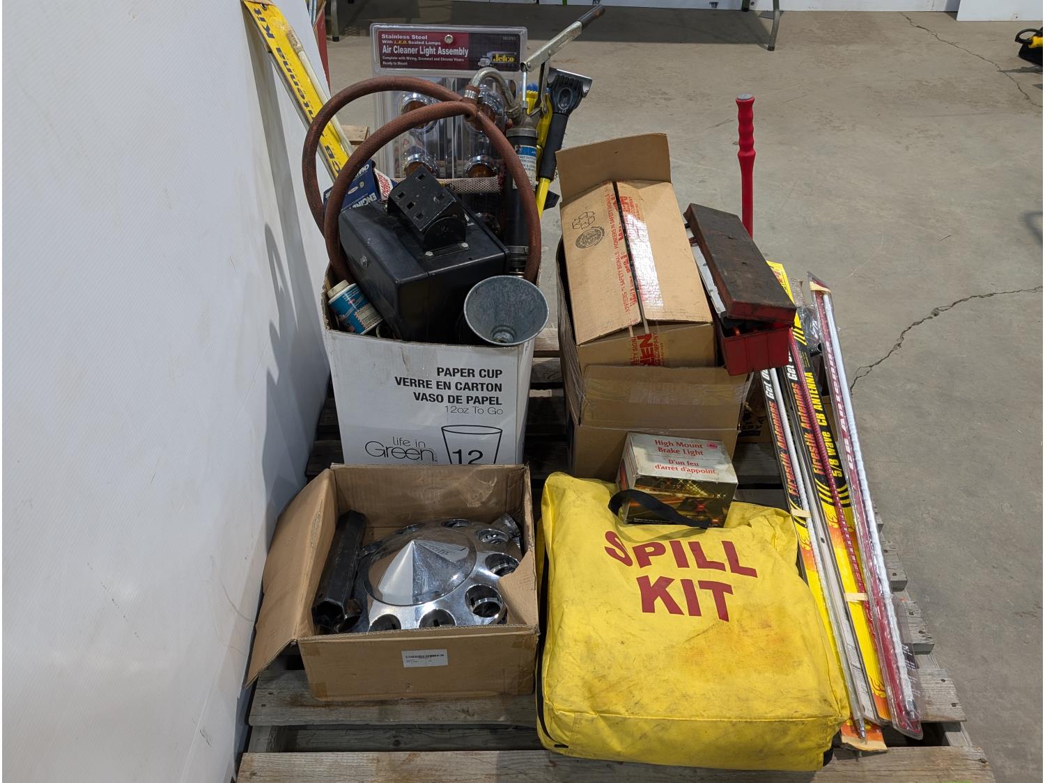 Spill kit, high mount brake light, CB antennae, squeegees, warning triangle, battery tester, headlamps, funnels, air cleaner light assembly