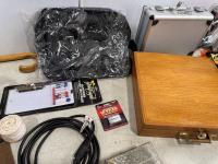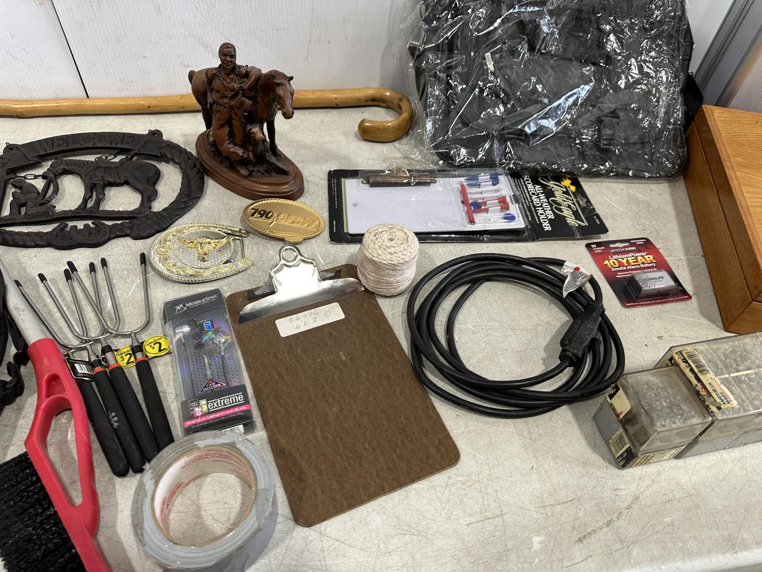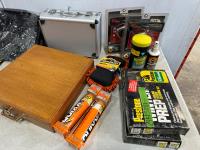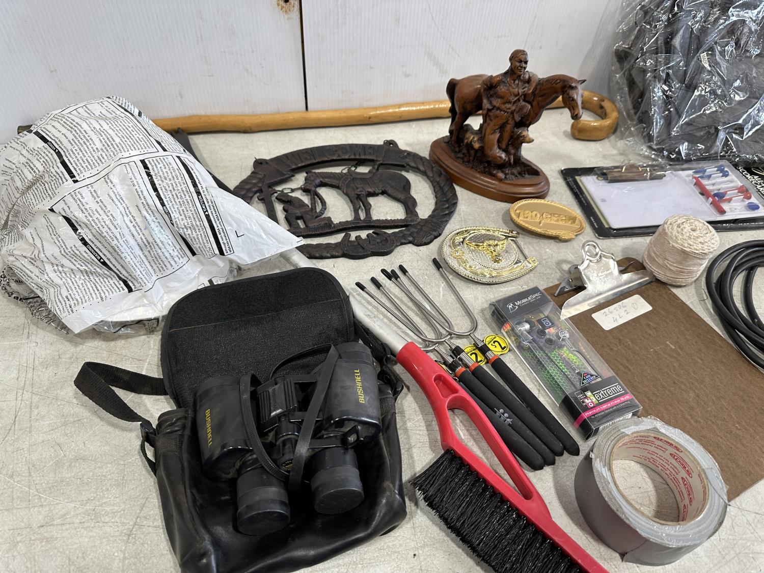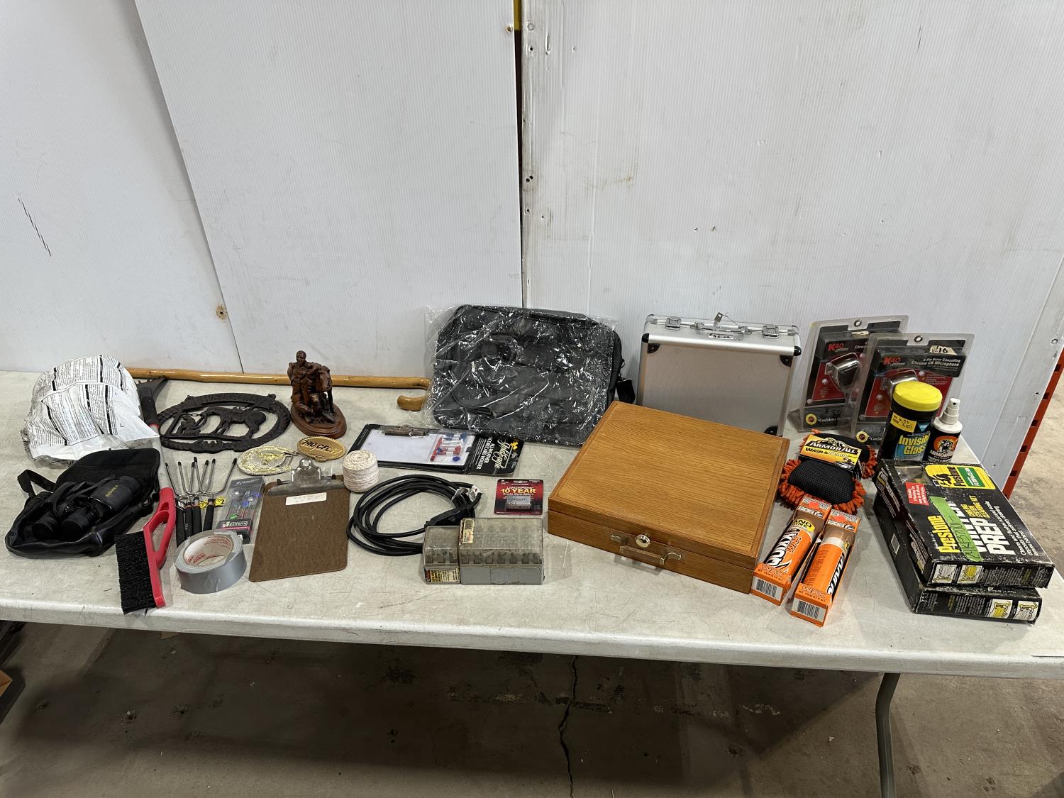 Binoculars, snow brush, belt buckles, decor items, Prestone radiator flush kit, wax, vehicle cleaning supplies, (2) CB microphones