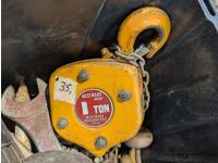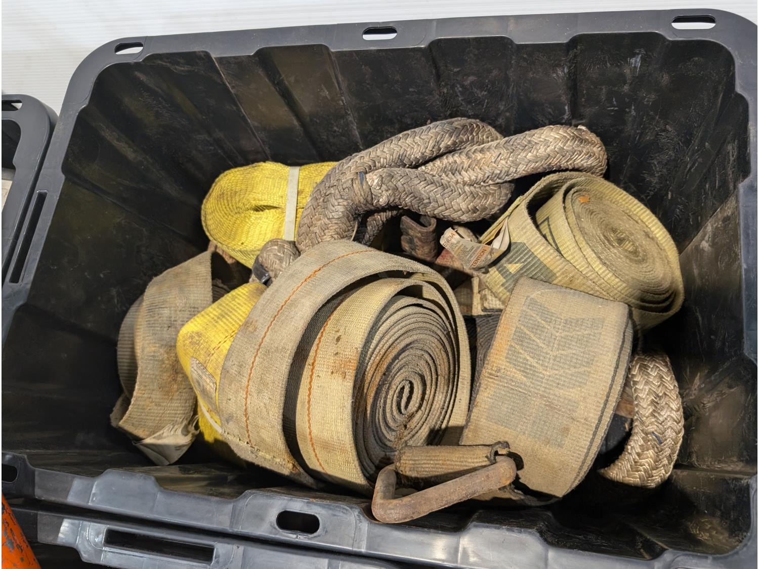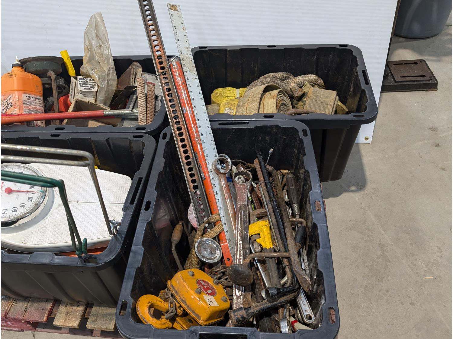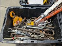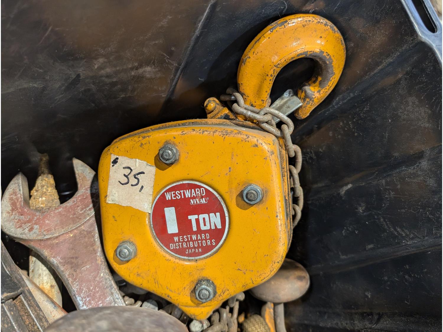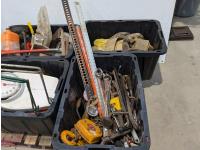 Slings, tie down straps, hand tools, Westward 1 ton chain vise, jack-all, squeegees, hardware