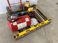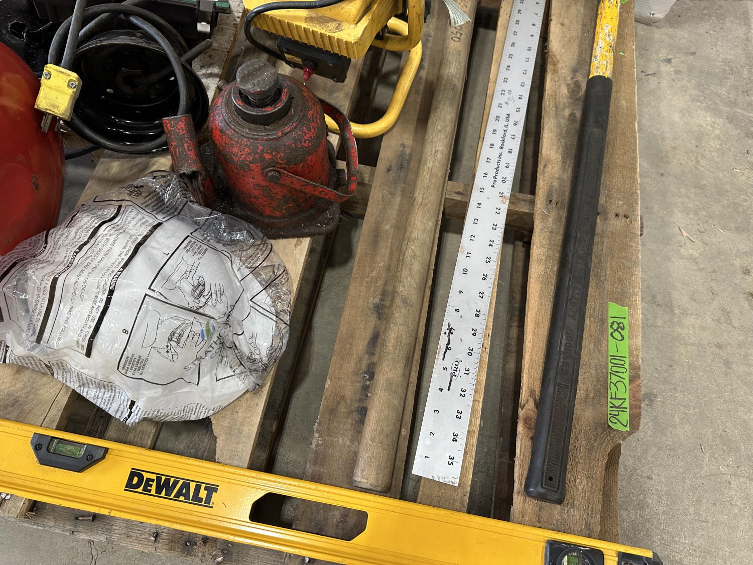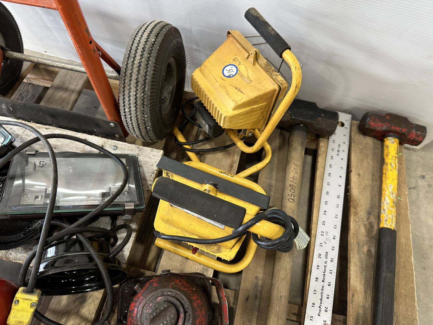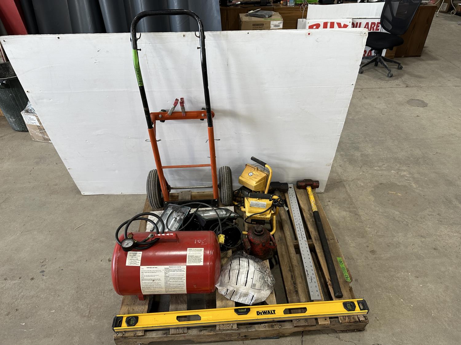 Dolly, Motomaster air tank, DeWalt 4 ft level, 36 inch straight edge, (2) sledge hammers, (4) work lights (untested), bottle jack, hard hat (unused)