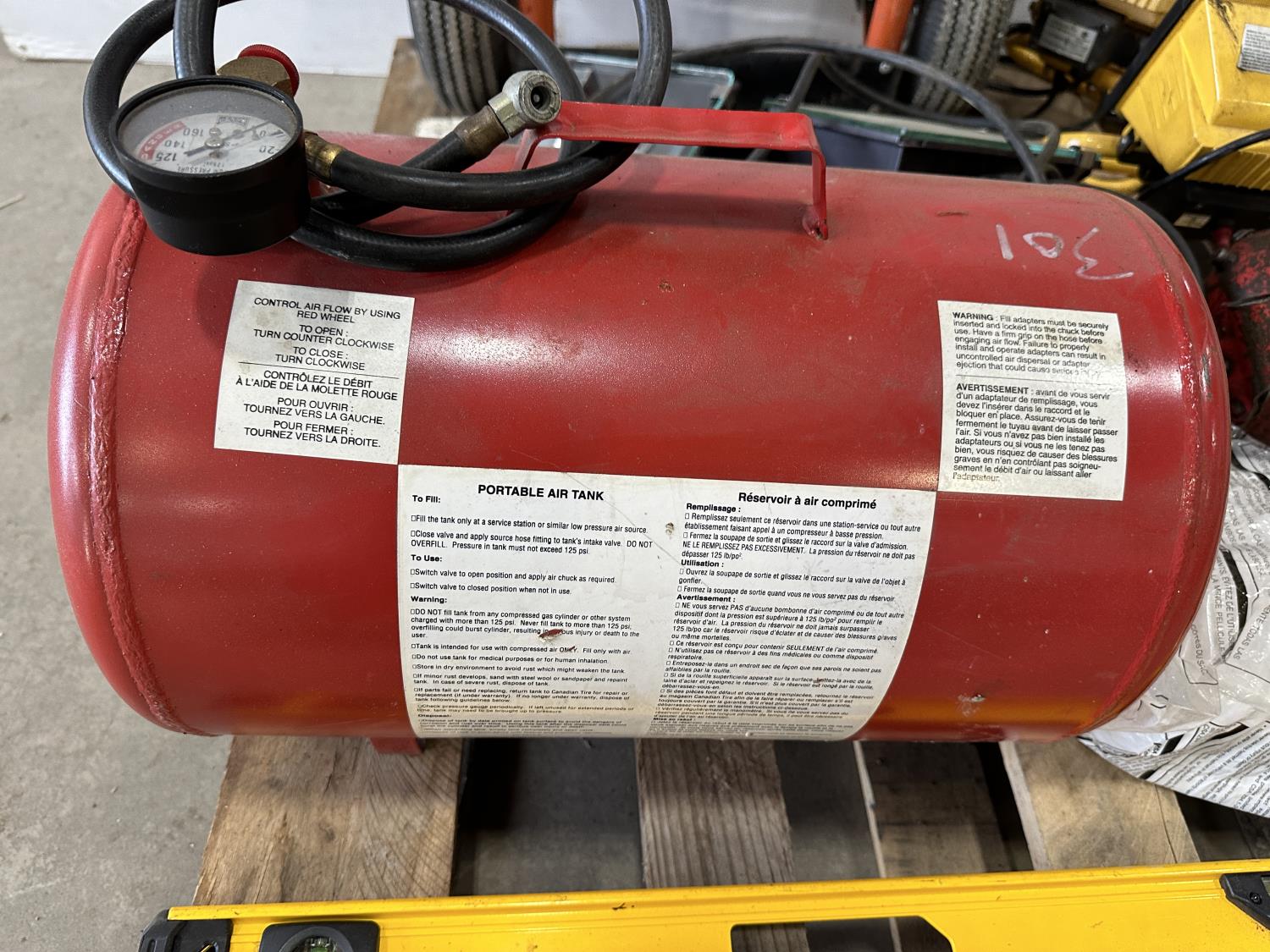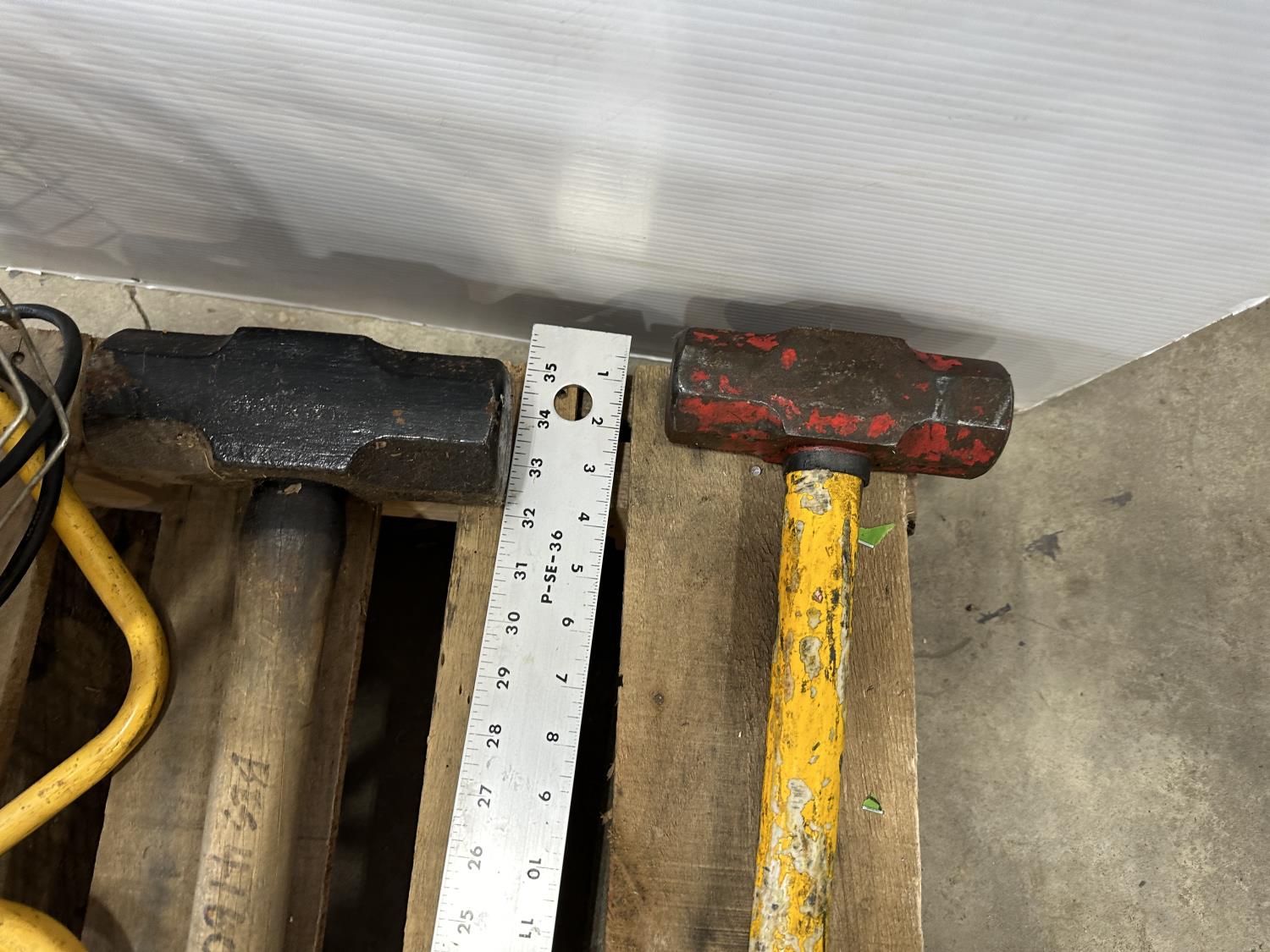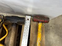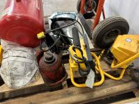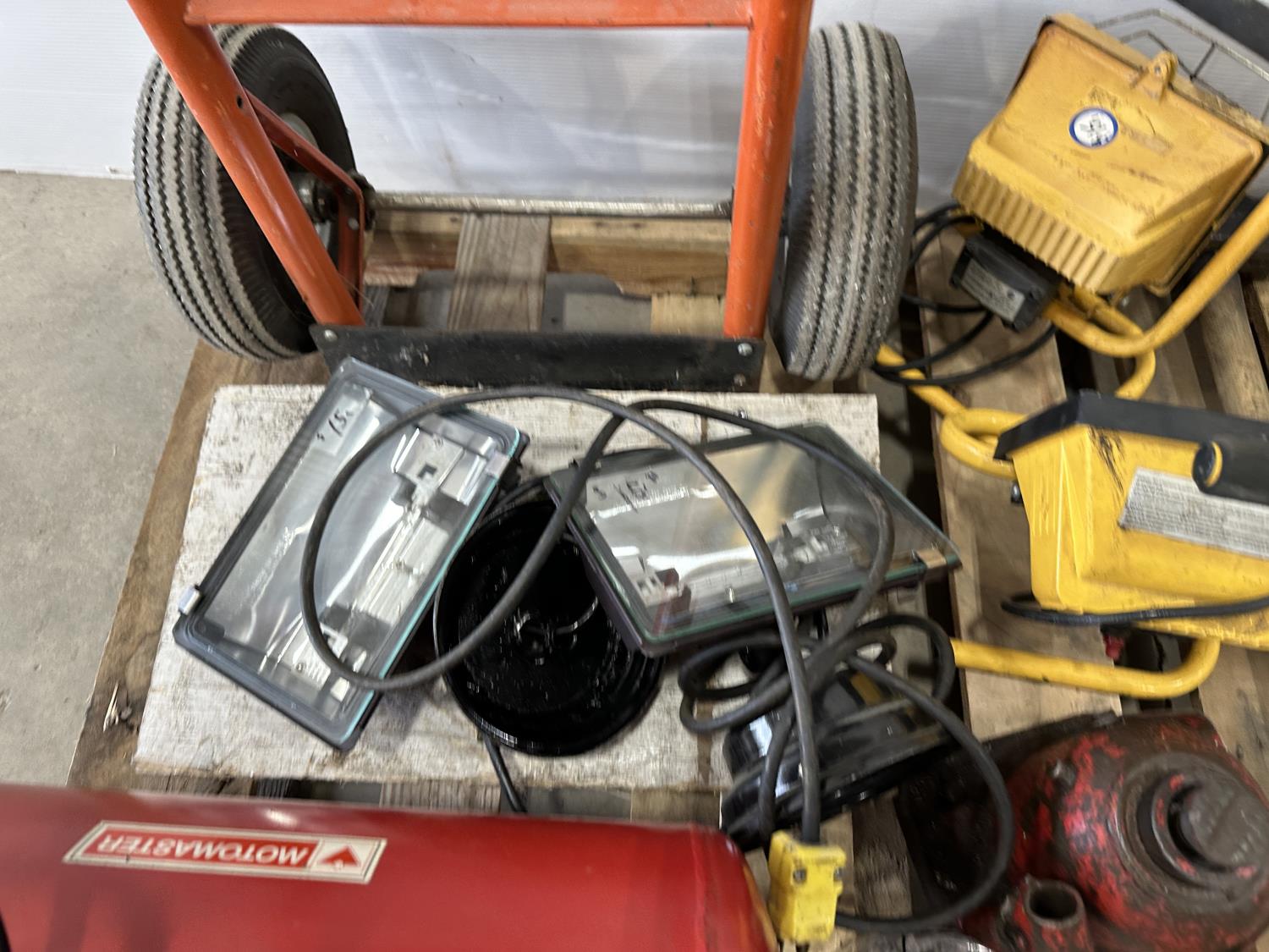 Dolly, Motomaster air tank, DeWalt 4 ft level, 36 inch straight edge, (2) sledge hammers, (4) work lights (untested), bottle jack, hard hat (unused)