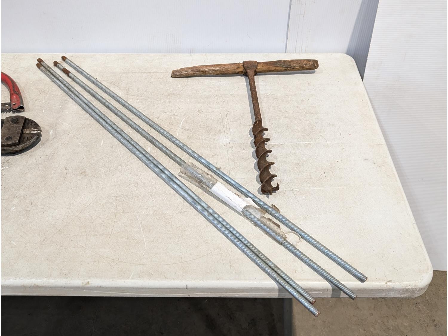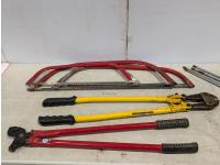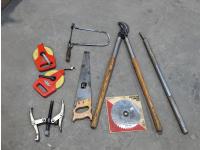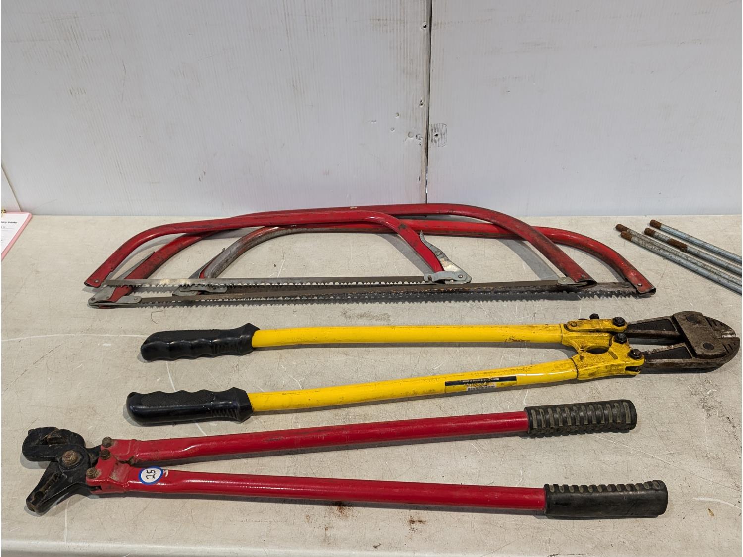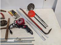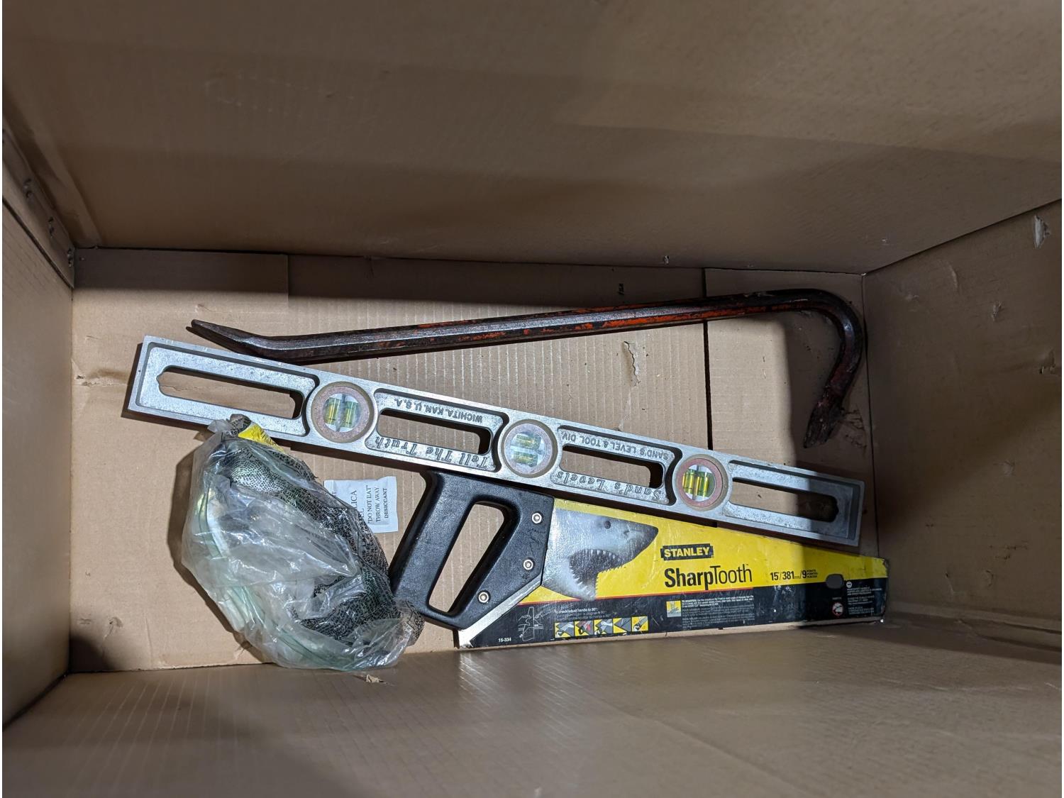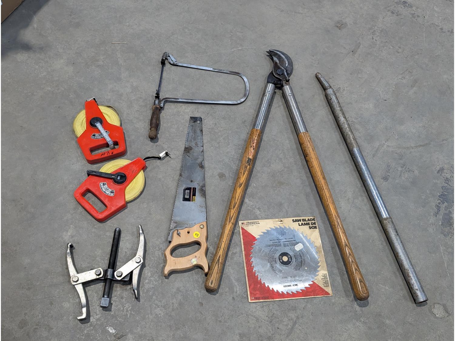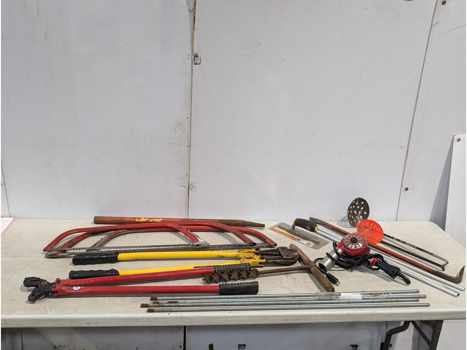 (3) bow saws, (2) ice fishing scoops, level, pry bars, coping saw, heat gun, bolt cutters