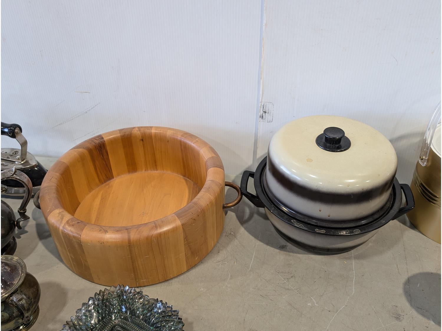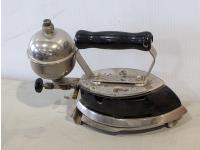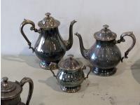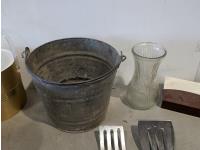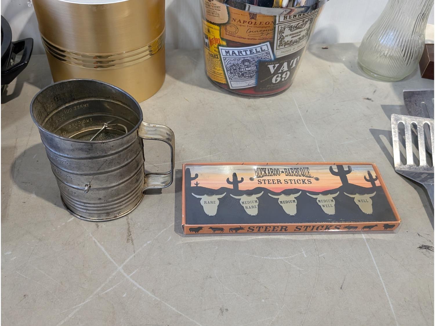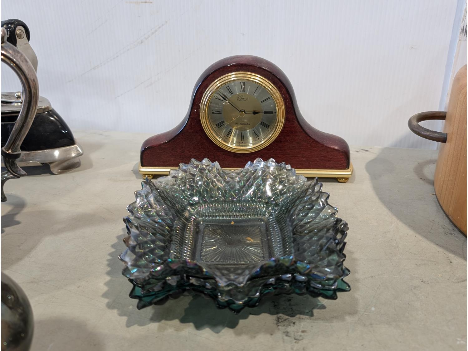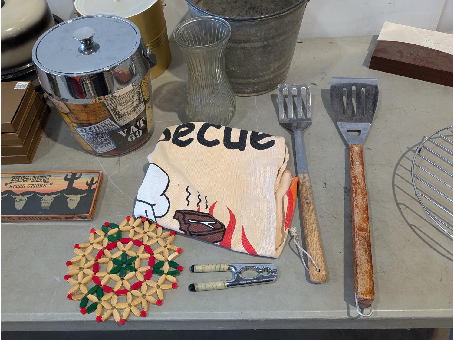 Barbeque utensils, ice buckets, flour sifter, mantle clock, vintage iron, silver plate tea and coffee services, utensils
