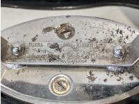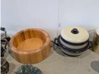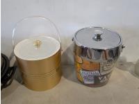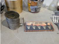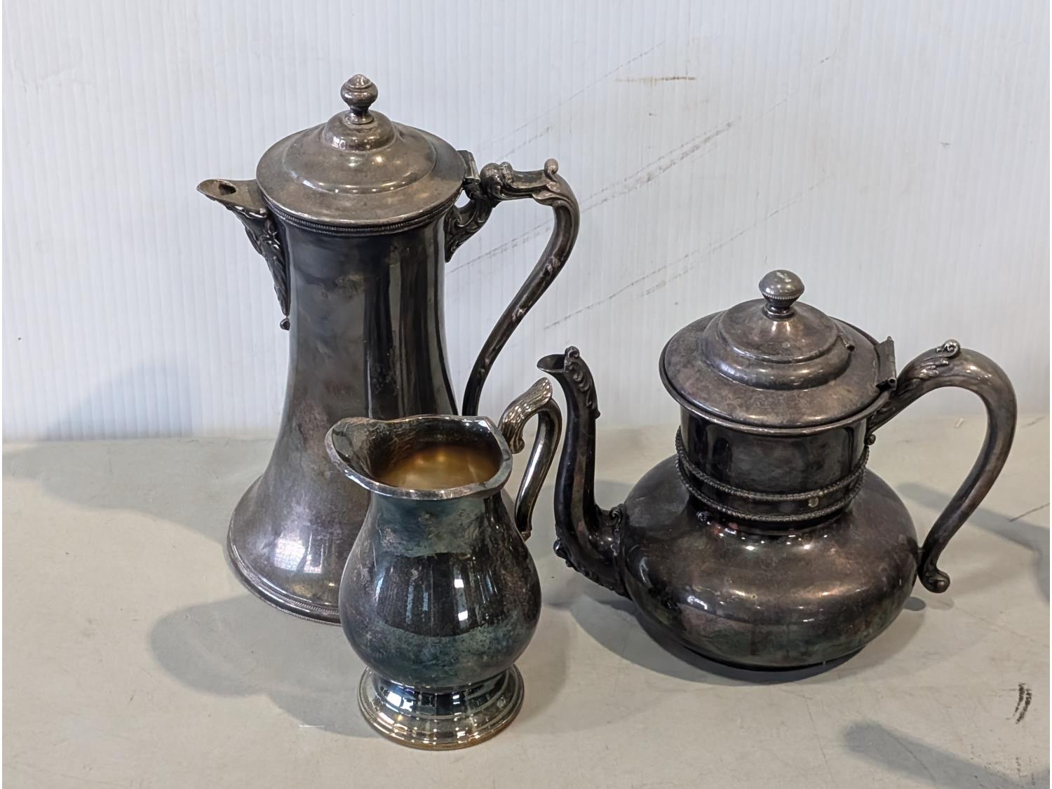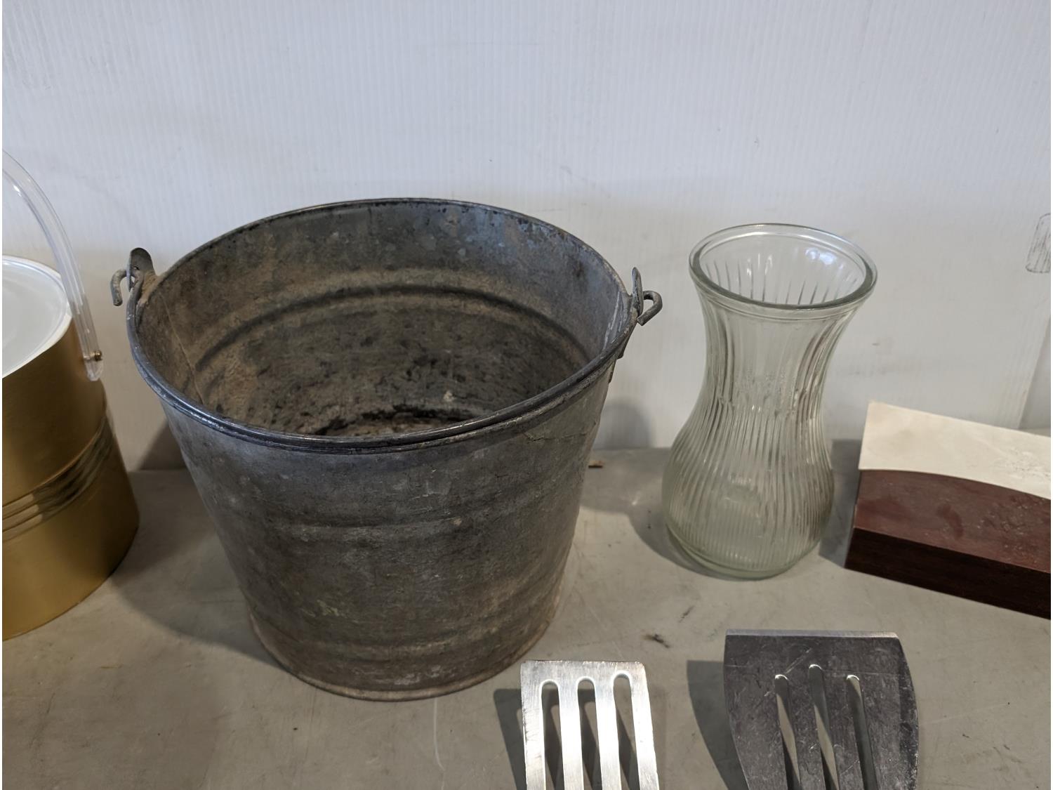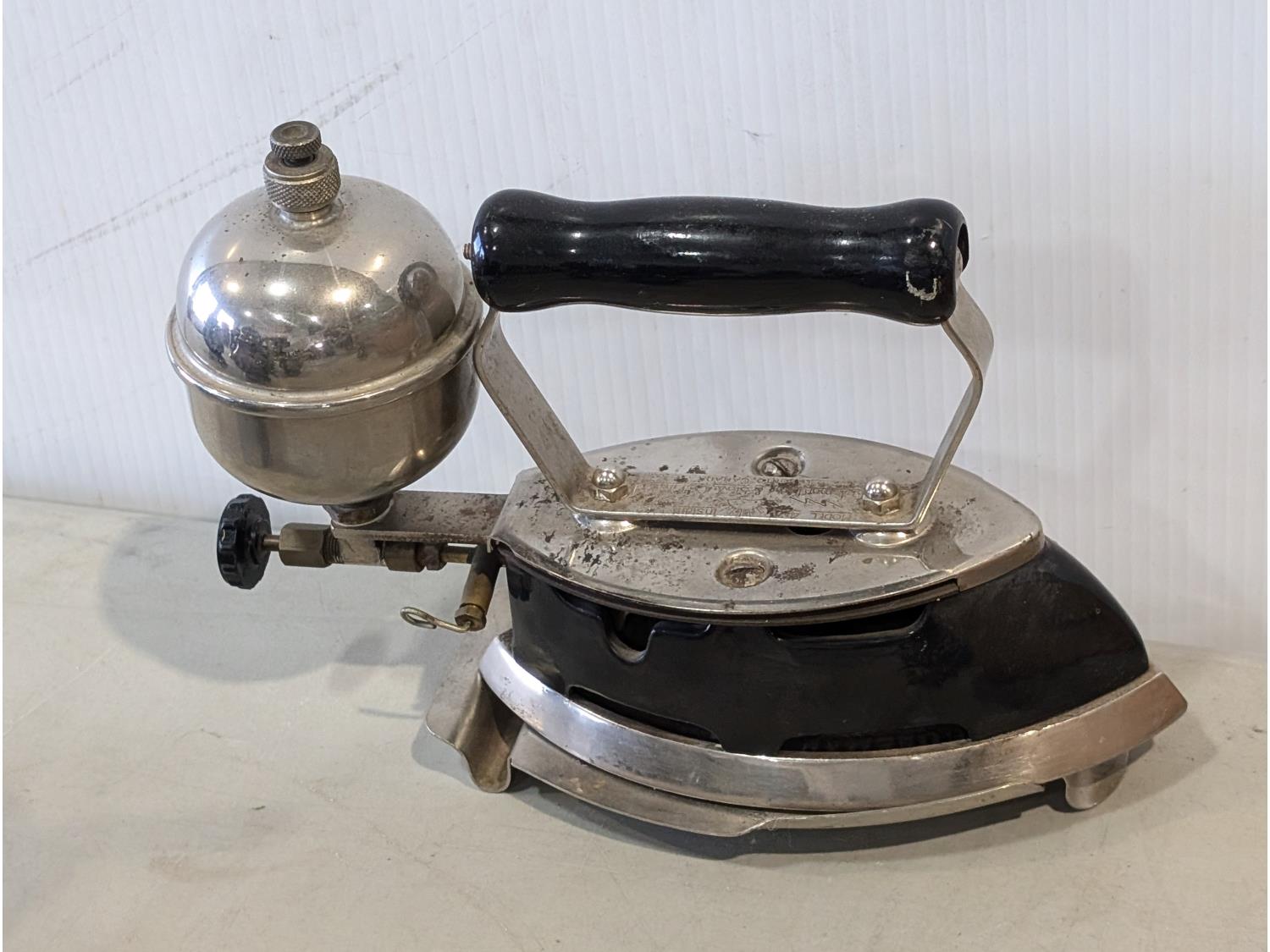 Barbeque utensils, ice buckets, flour sifter, mantle clock, vintage iron, silver plate tea and coffee services, utensils