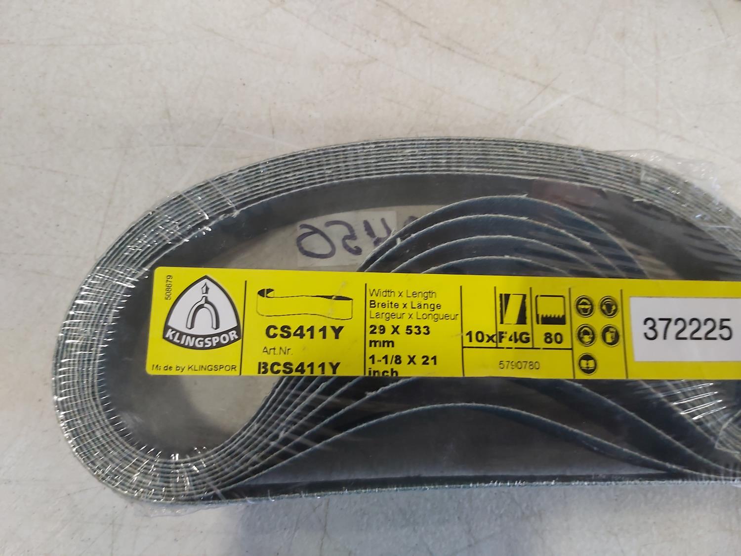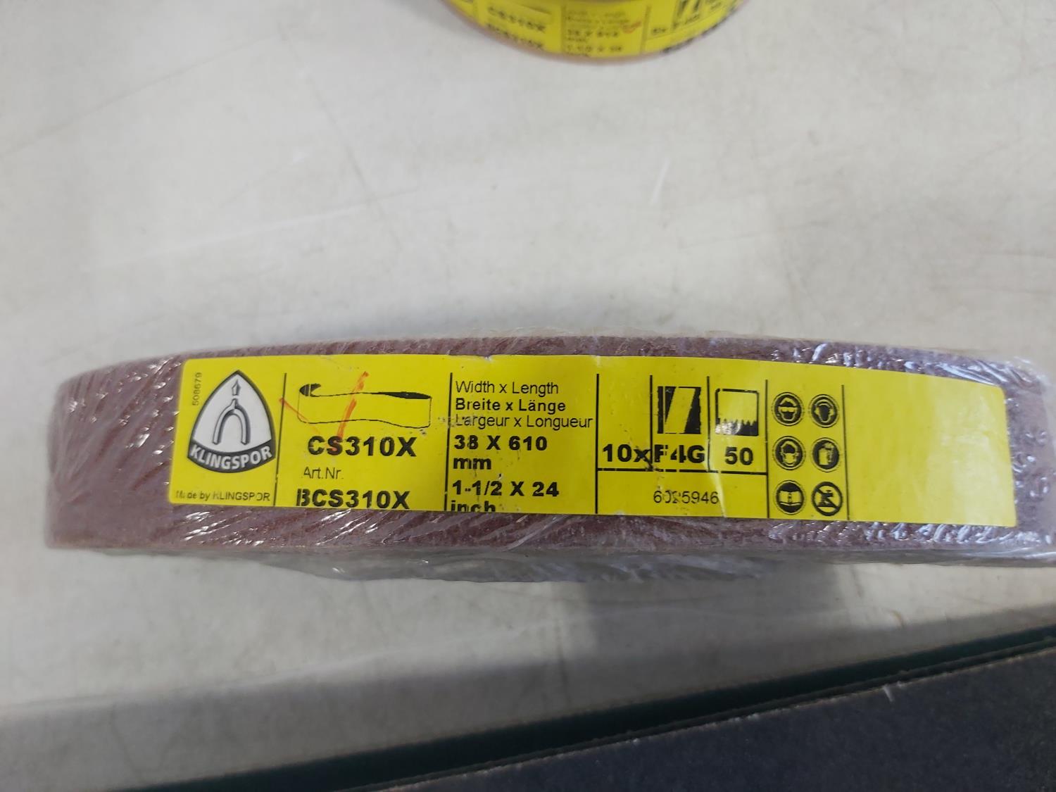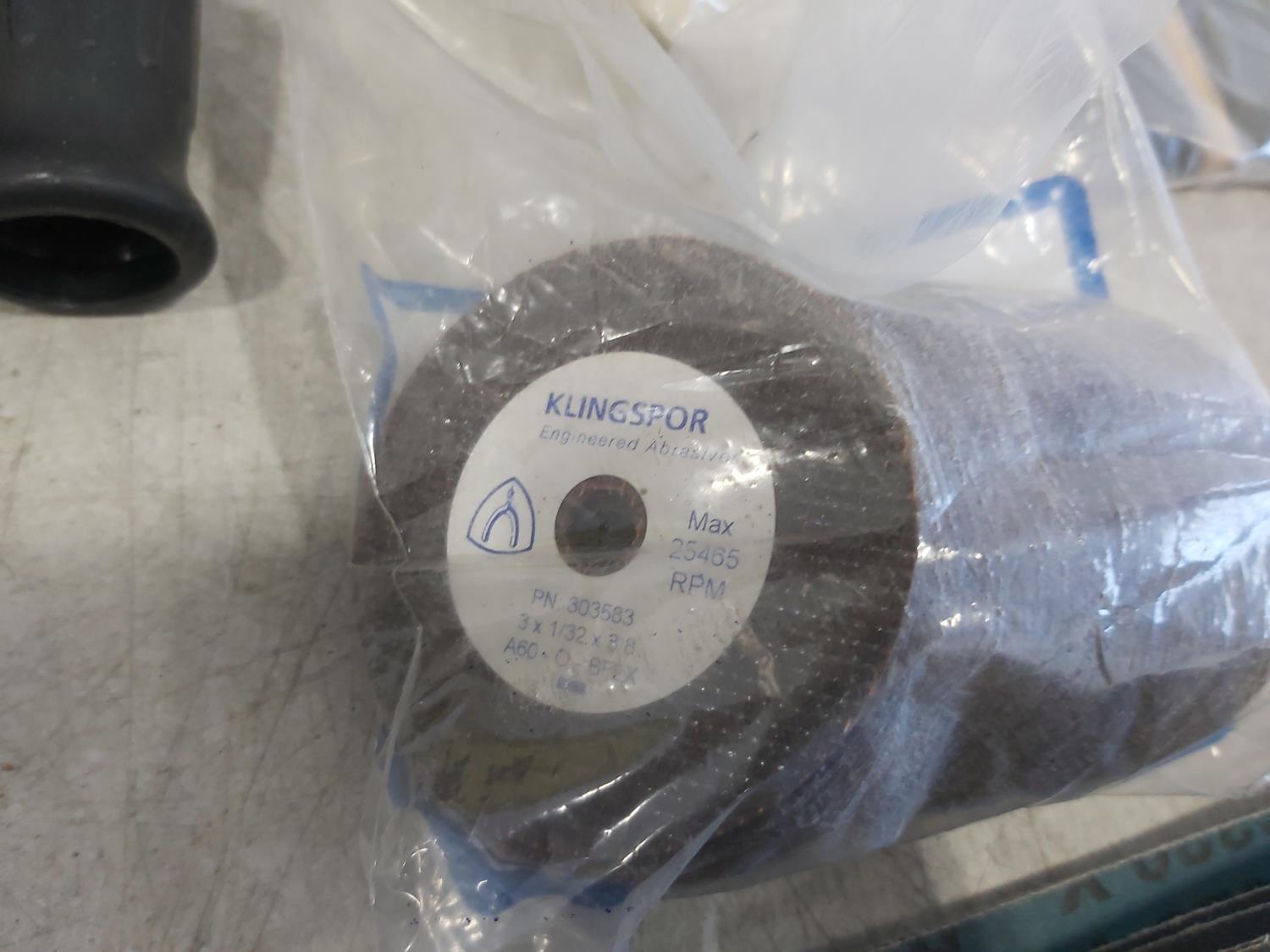 (8) 4 inch x 50 inch P80 Sanding Belts, (100) 150 mm P1000 polishing discs, (10) 1-1/2 inch x 24 inch sanding belts P50, (10) 1-1/2 inch x 36 inch sanding belts P36, (10) 1-1/8 inch x 21 inch sanding belts P80, (53) 3 inch x 1/32 inch x 3/8 inch cut off discs, (12) 3 inch Buffing pads