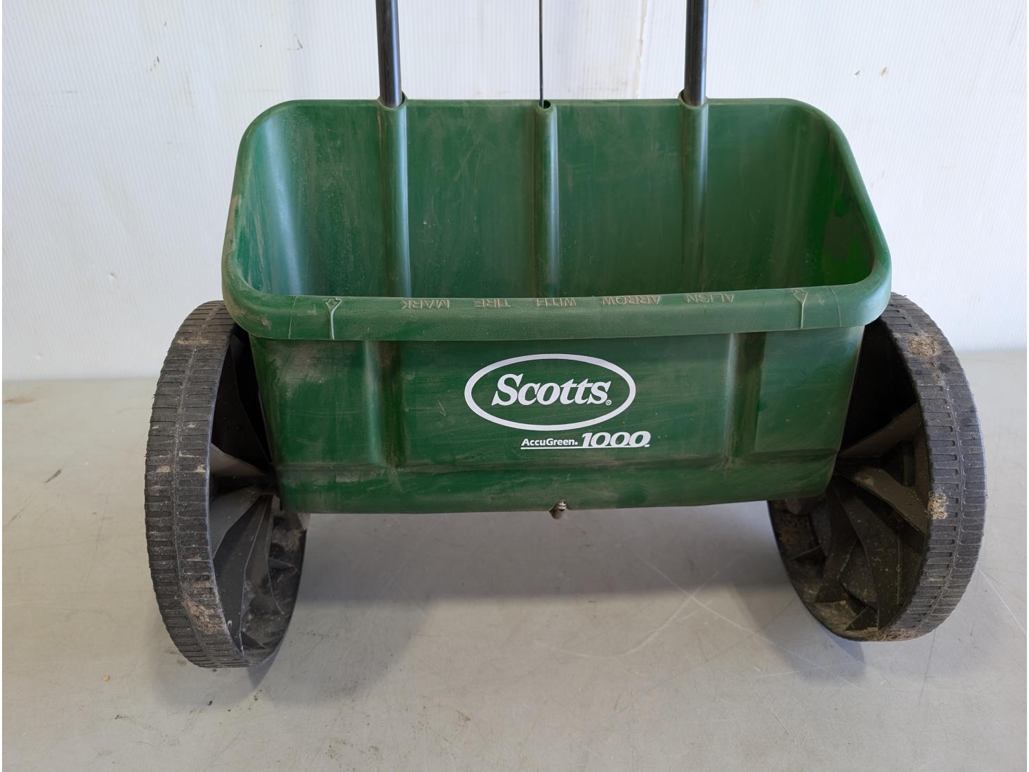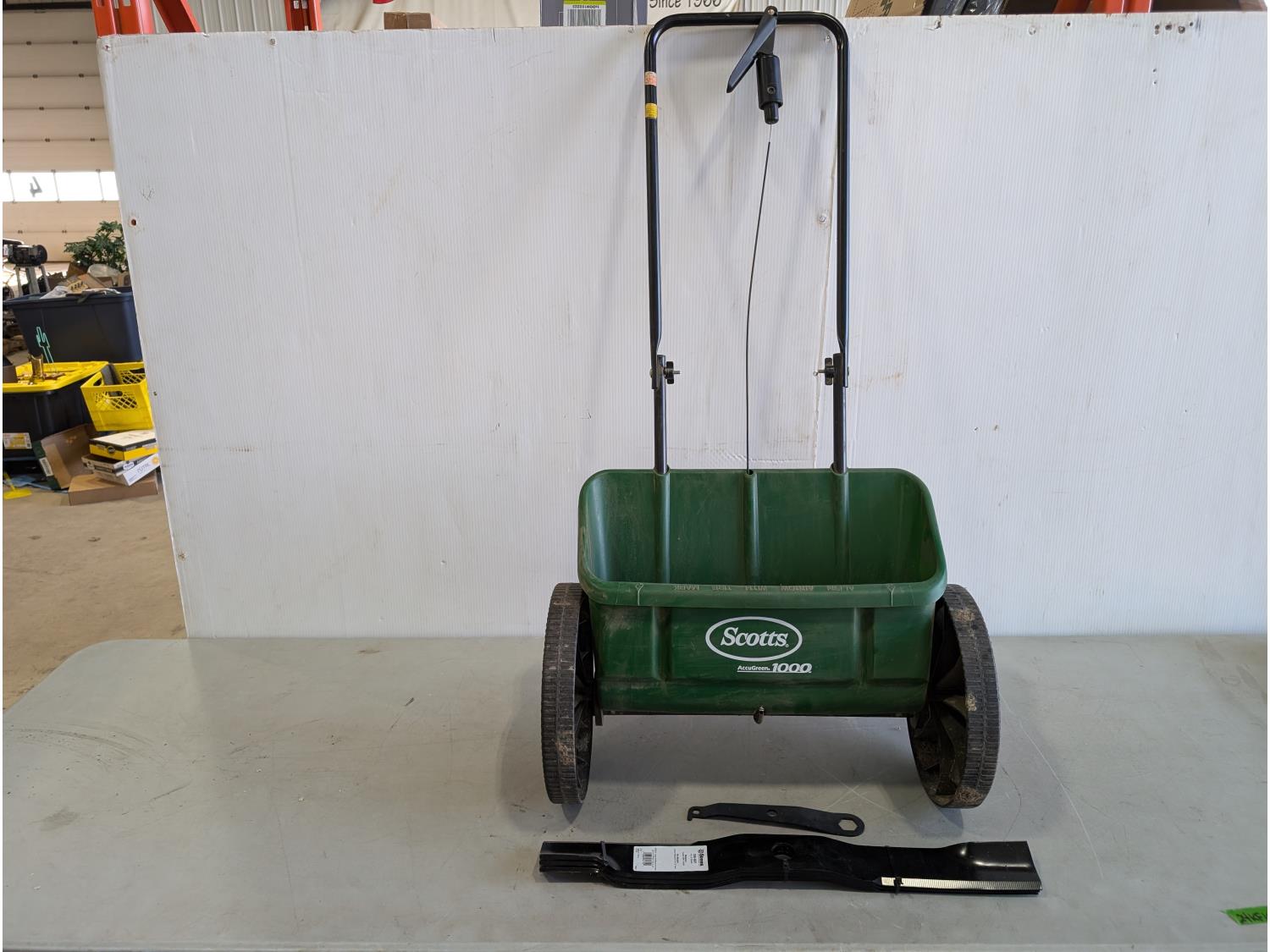 1017 Scotts Accugreen 1000 Broadcast Spreader and (3) Stens Hi-Lift Lawnmower Blades