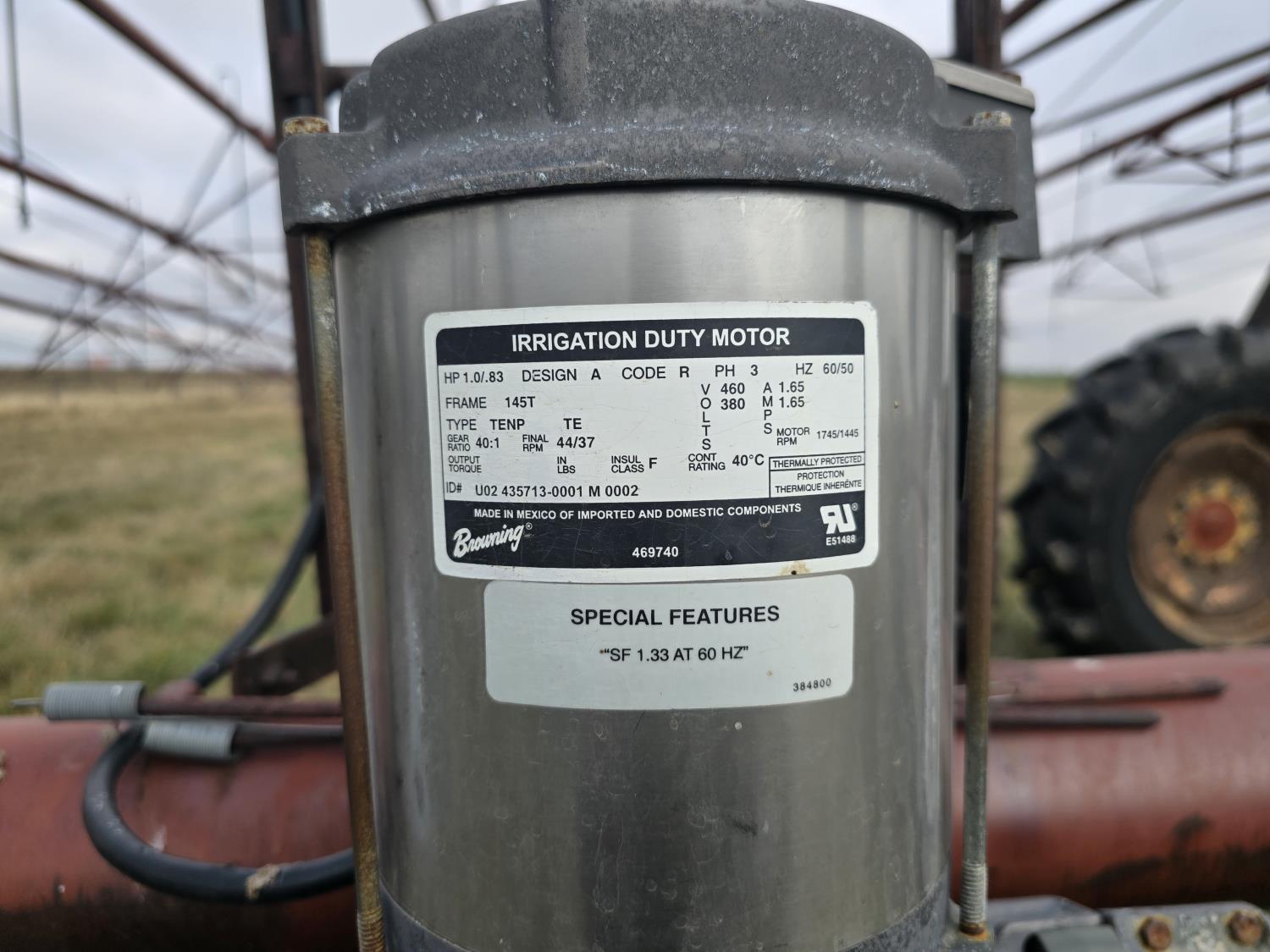 10 x 155 ft tower sections. 1710 operational feet, 1250 GPM. 8 inch main inlet. 6 inch tower outlet. 3 Phase irrigation motors max 460 volts. 12 ft to top of sprinklers, 88 inch drop sprinkler kit, 11.2-24 bias ply tires