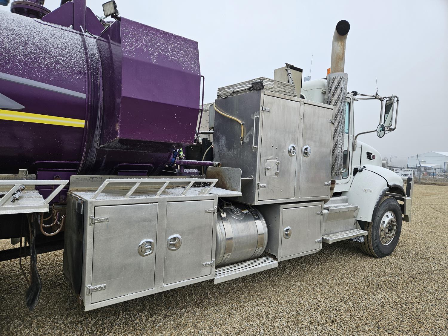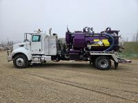 Paccar PX-8 8.3 L 6 cylinder 240 HP diesel engine, DEF required, engine brake, engine block heater, positive air shutoff, Allison 6 speed automatic transmission, A/C, cruise control, air ride driver seat, radio, hydraulic wet kit, aluminum moose bumper, tool boxes, chain holders, Cat pump, 4777 liter 2 compartment tank, TDG regulated, 2.5 cube fresh water, 4 cube debris, Robuschi RB 45 blower, air ride suspension, 12,000 lb front axle, 23,000 lb rear axles, diff lock, 5.57 ratio, all aluminum wheels, 315/80R22.5 tires