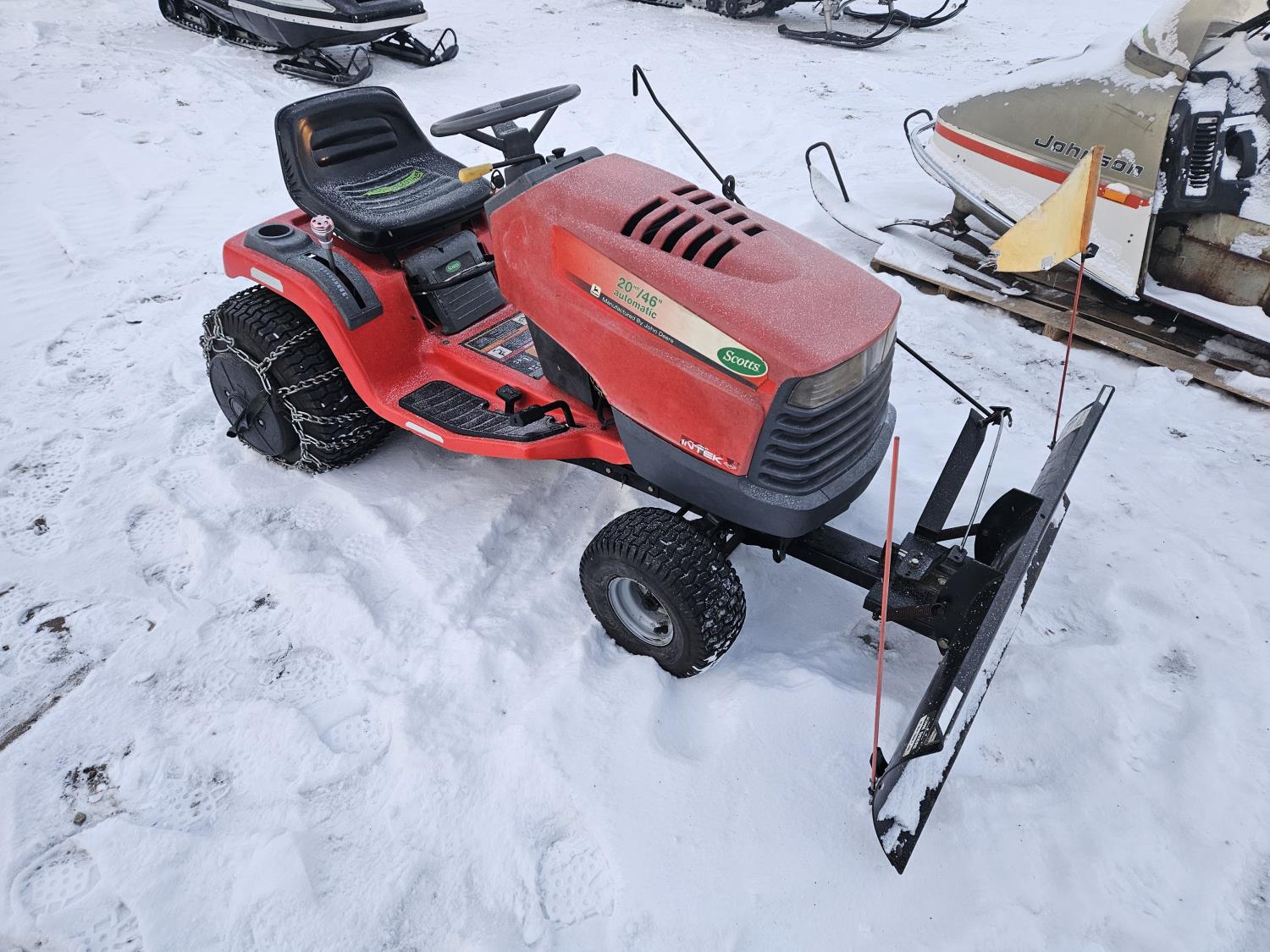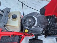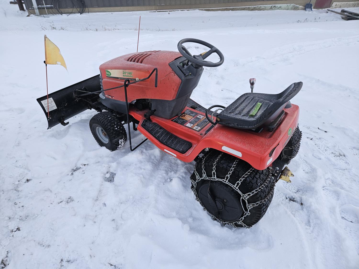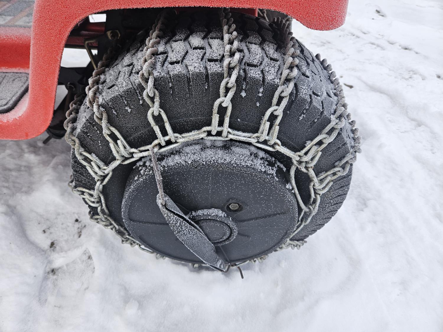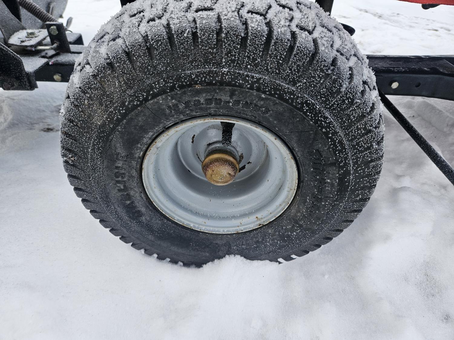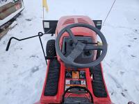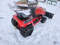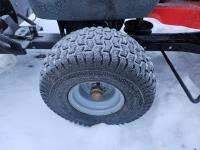 Briggs & Stratton 20 HP gas engine, hydrostatic transmission, 46 inch front mount blade, rear tire chains, rear wheel weights, no mower deck