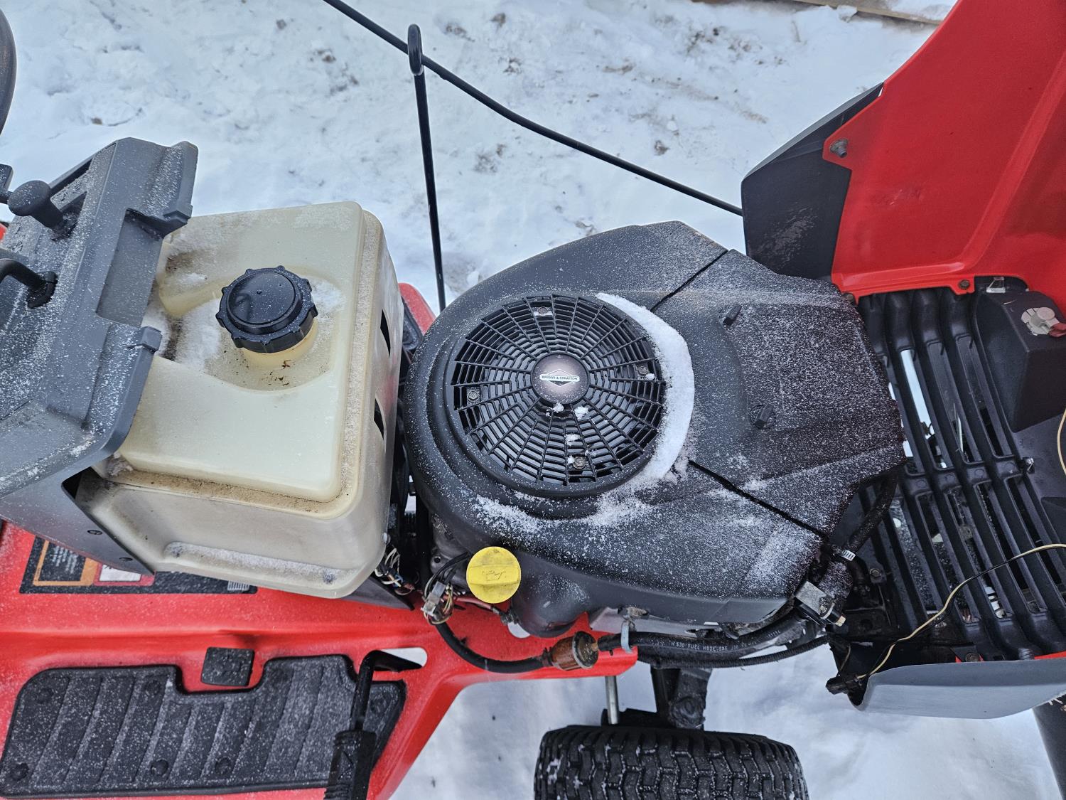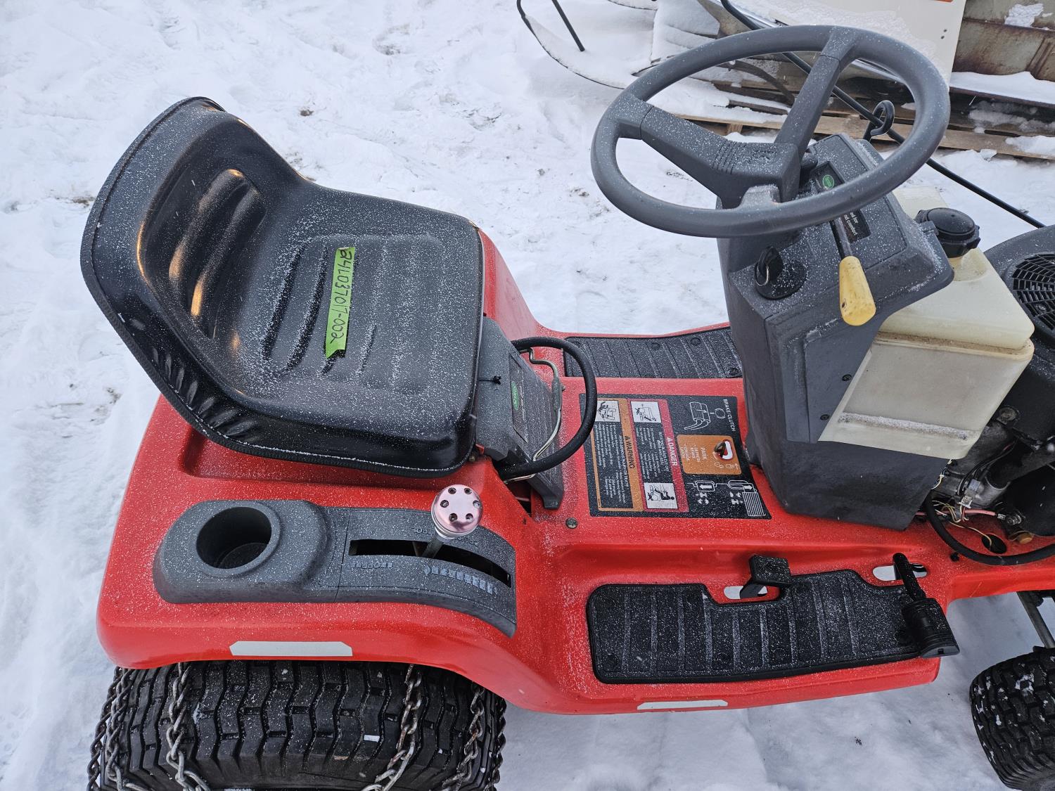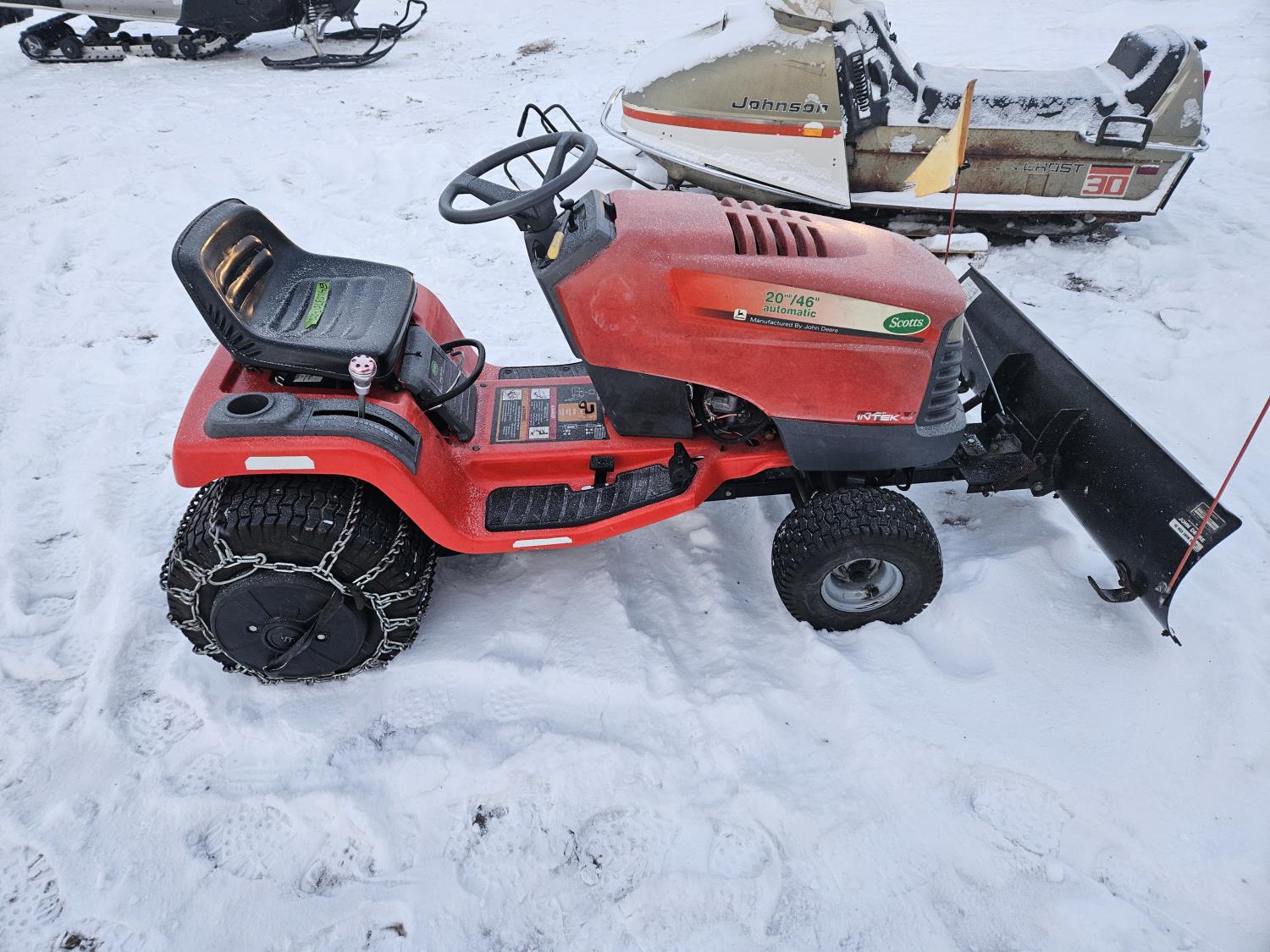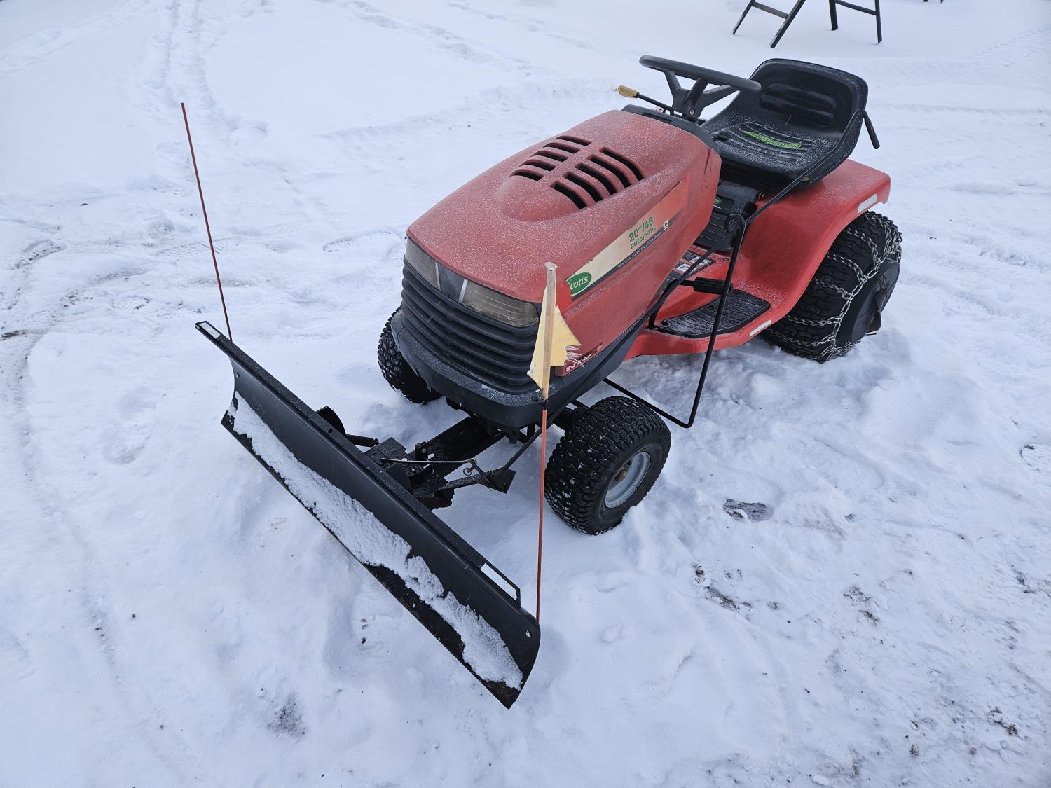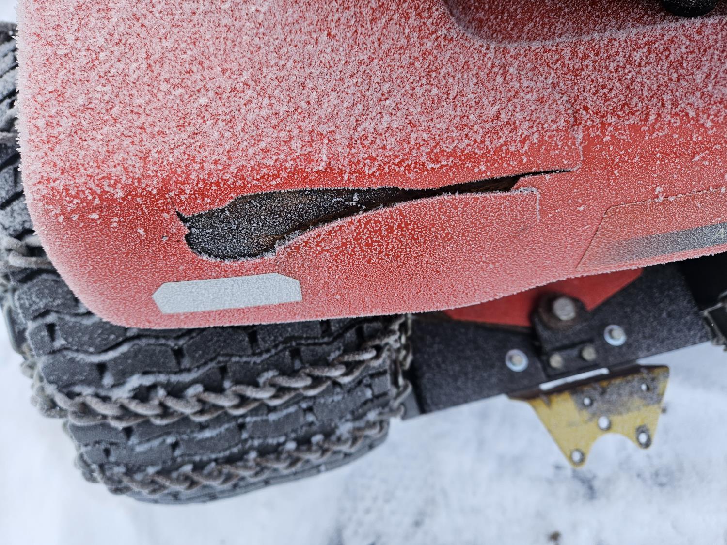 Briggs & Stratton 20 HP gas engine, hydrostatic transmission, 46 inch front mount blade, rear tire chains, rear wheel weights, no mower deck