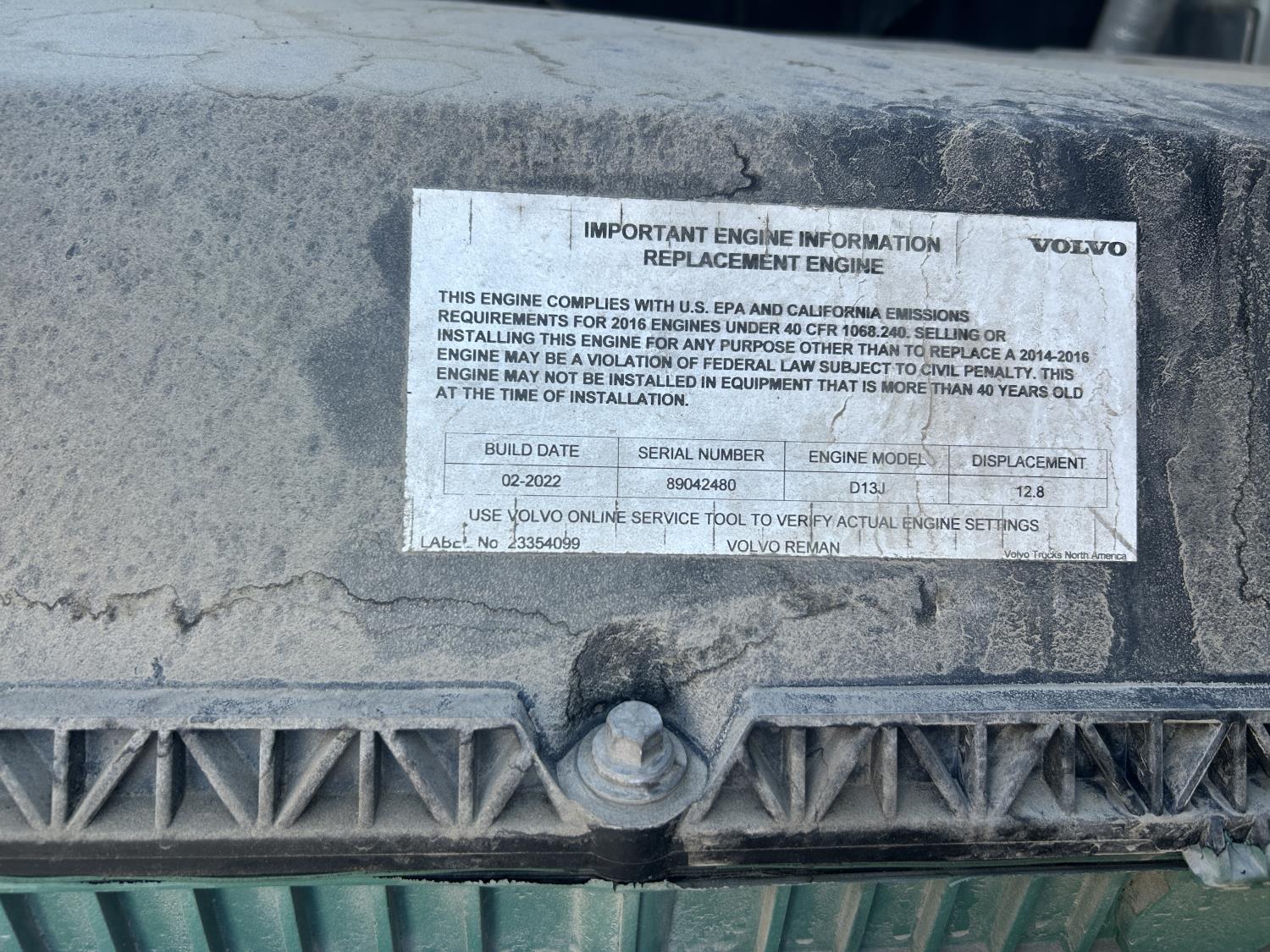Volvo D13J 12.8 L diesel engine, DEF required, Volvo AT2612D automatic transmission, A/C, air ride driver seat, air ride cab, air ride suspension, 12,000 lb front axle, 20,000 lb rear axles, 295/75R22.5 tires