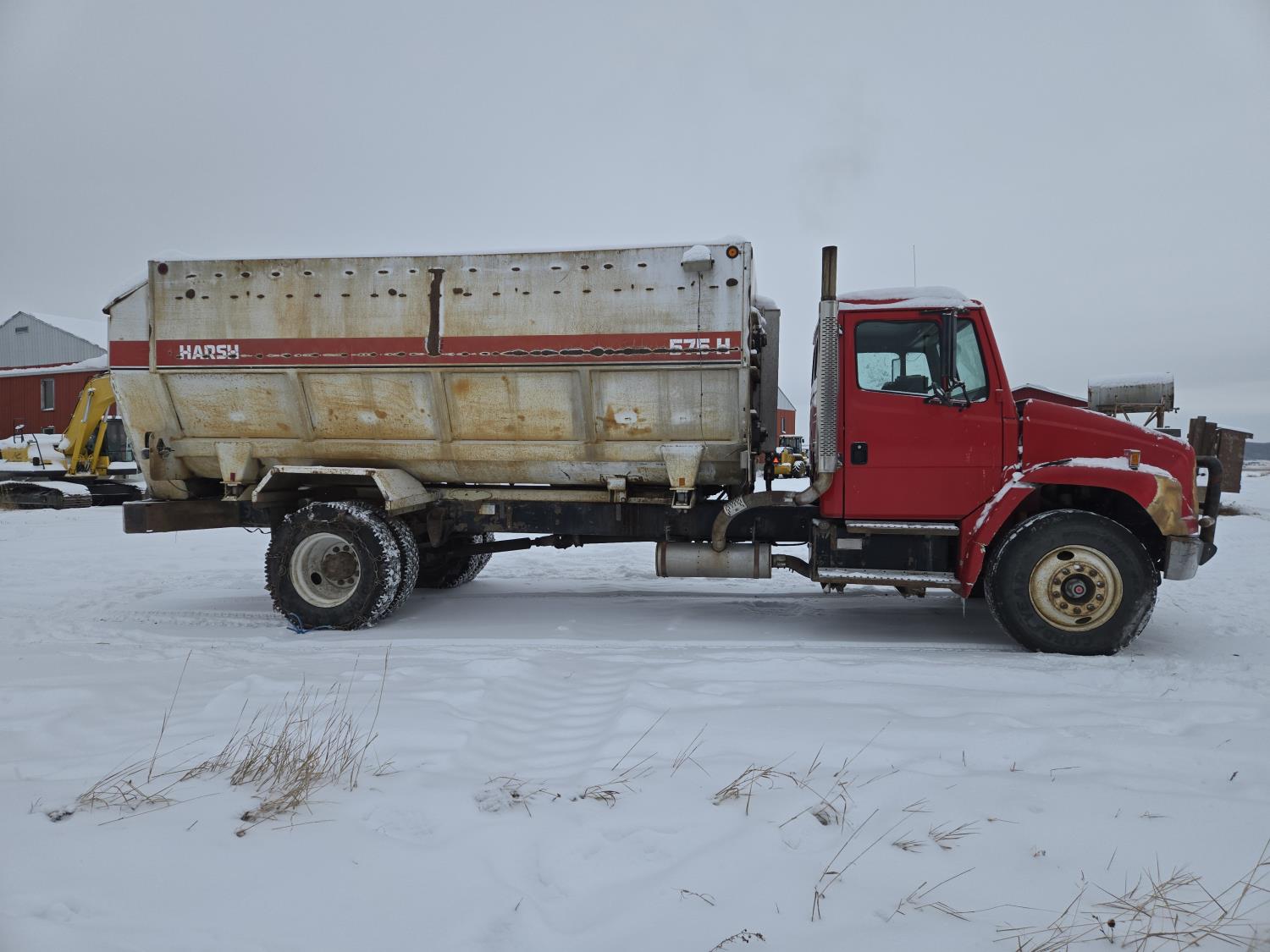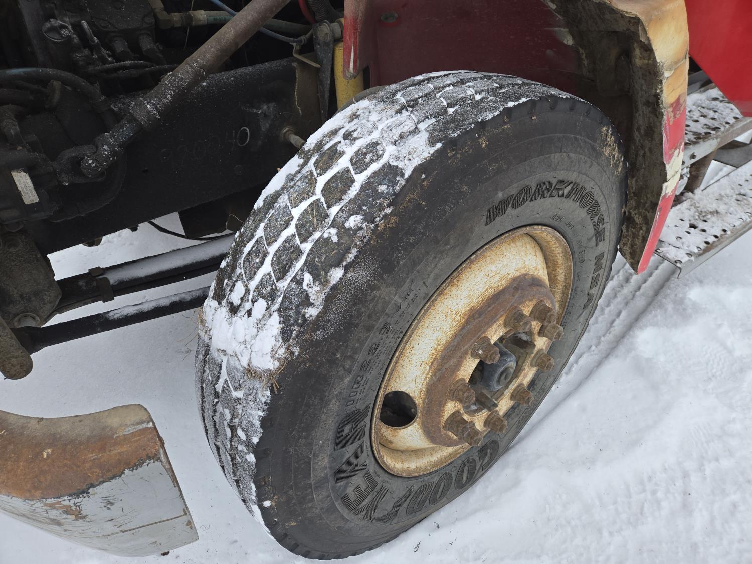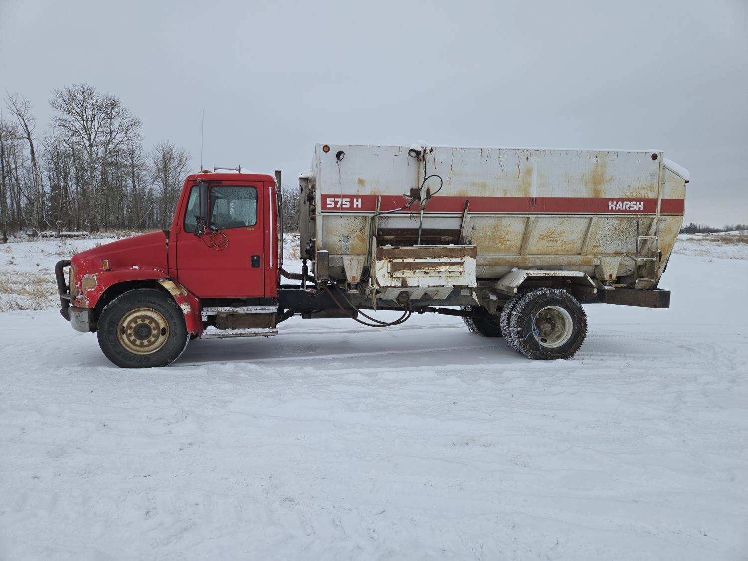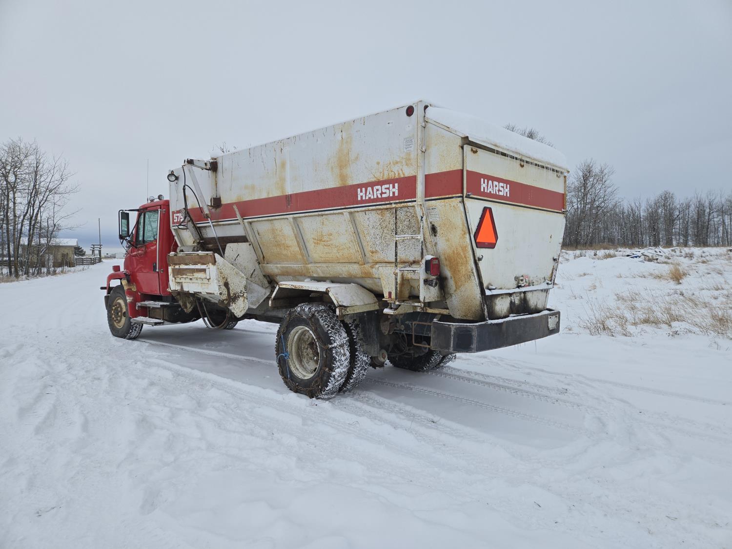 Cummins 6 cylinder diesel engine, automatic transmission, spring suspension, air brakes, Harsh 575H 16 ft 4 auger silage mixer box, 3 auger left hand discharge, Eaton Microprocessor scale head, 12,000 lb front axle, 22,7000 lb rear axle, 11R22.5 tires