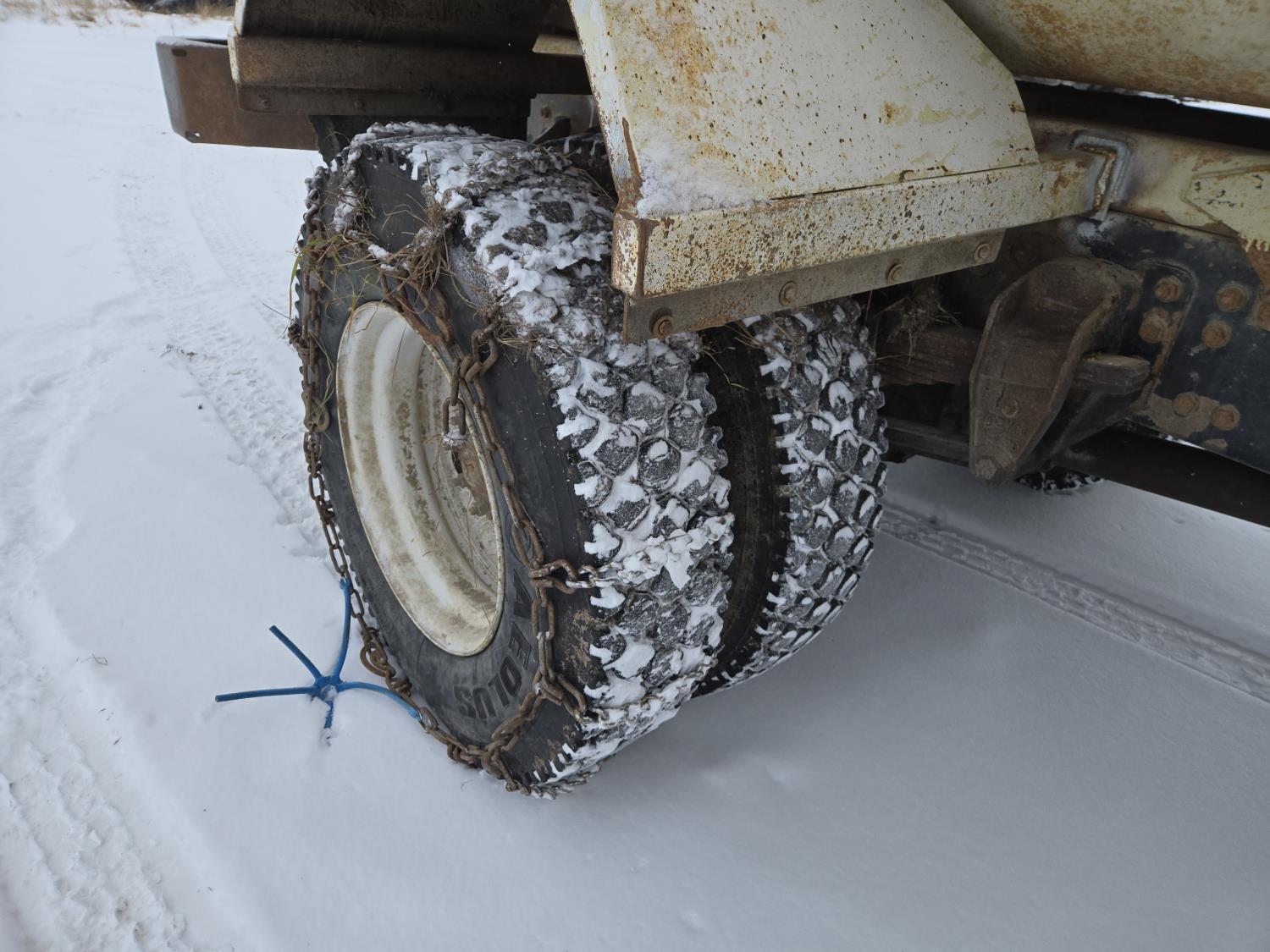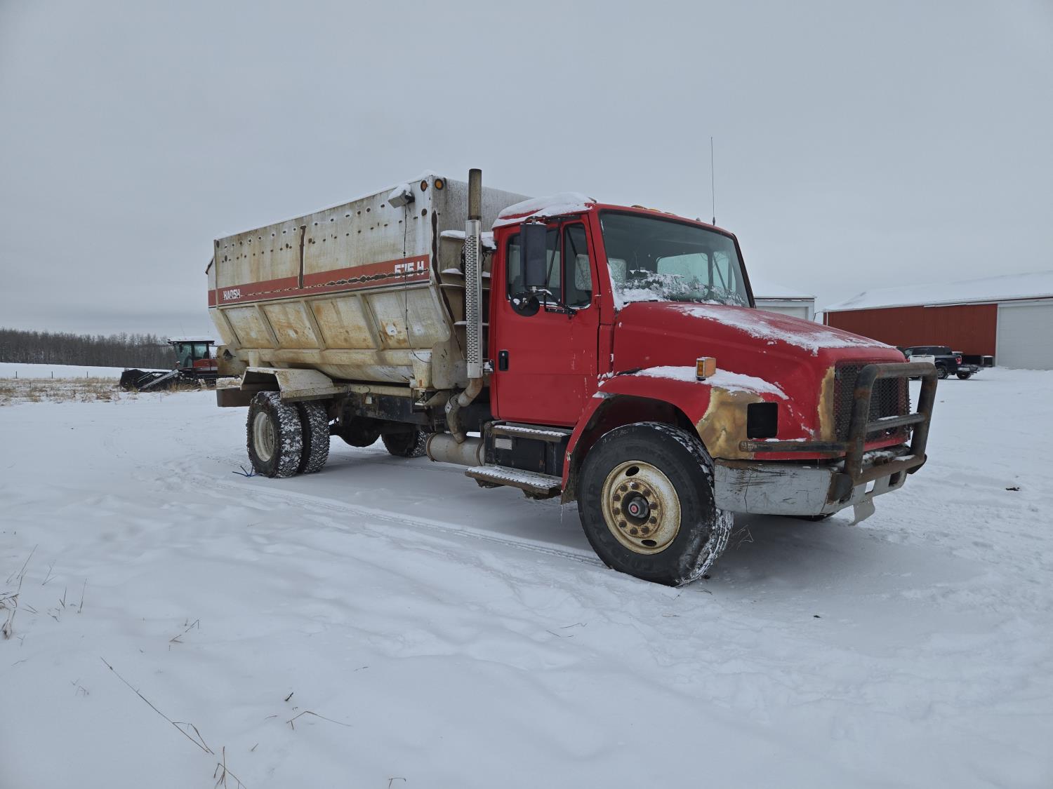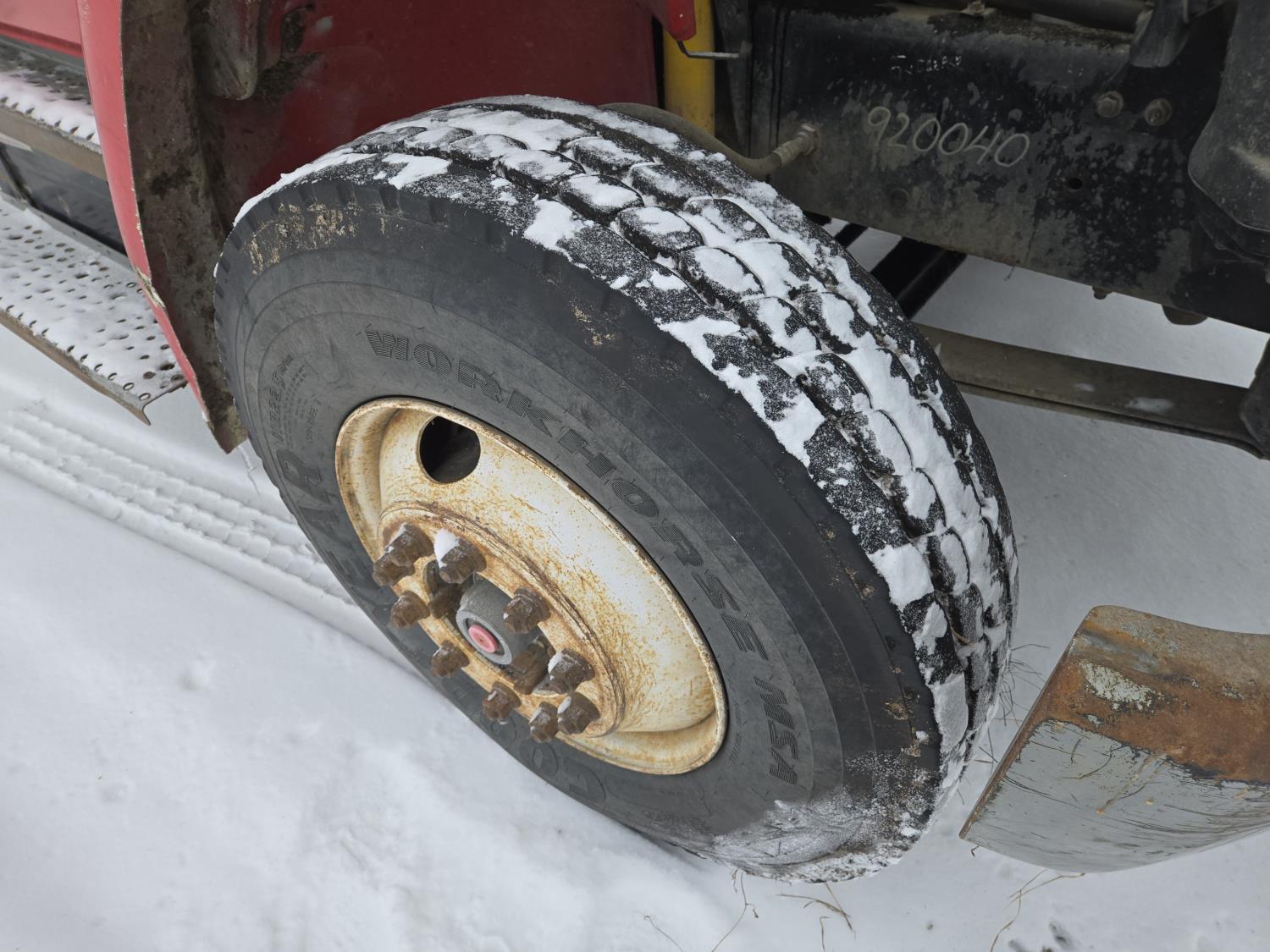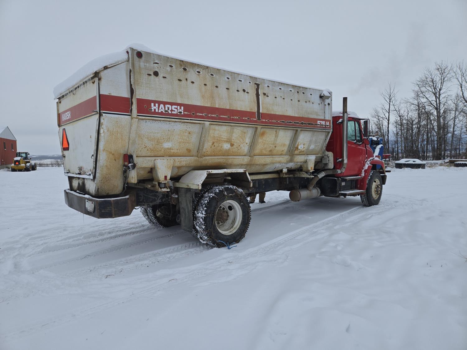 Cummins 6 cylinder diesel engine, automatic transmission, spring suspension, air brakes, Harsh 575H 16 ft 4 auger silage mixer box, 3 auger left hand discharge, Eaton Microprocessor scale head, 12,000 lb front axle, 22,7000 lb rear axle, 11R22.5 tires