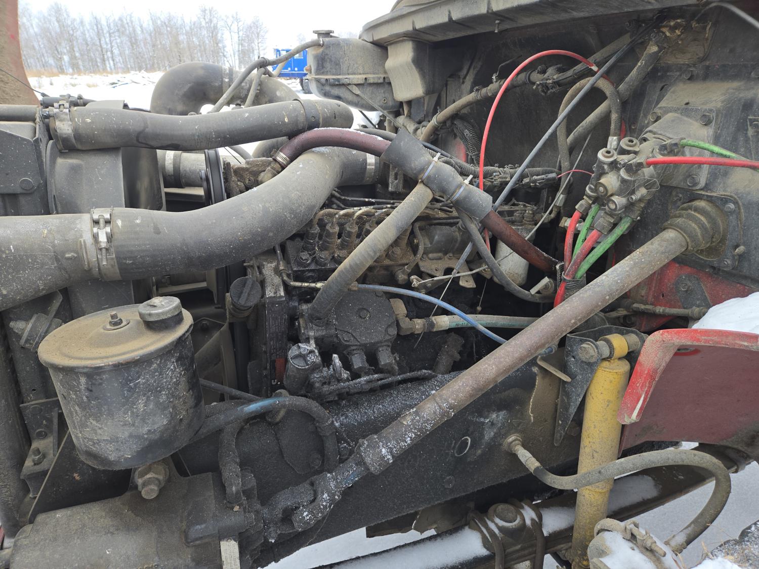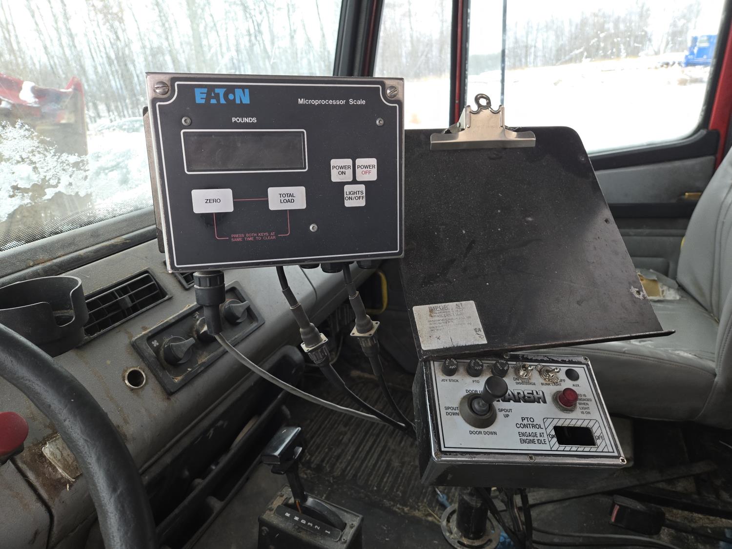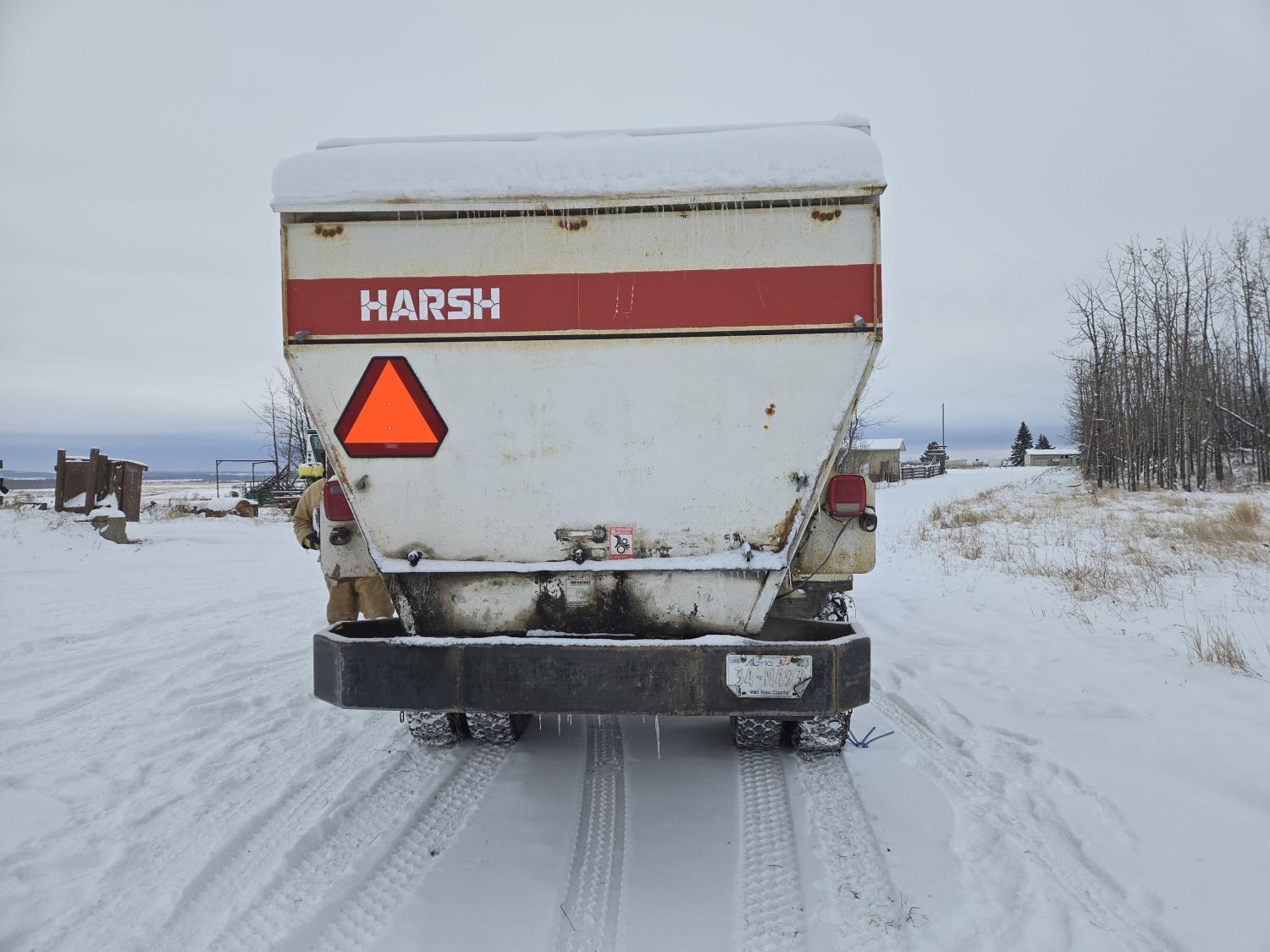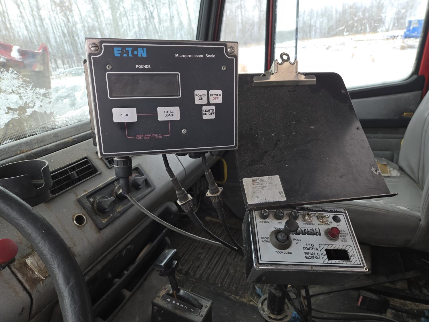 Cummins 6 cylinder diesel engine, automatic transmission, spring suspension, air brakes, Harsh 575H 16 ft 4 auger silage mixer box, 3 auger left hand discharge, Eaton Microprocessor scale head, 12,000 lb front axle, 22,7000 lb rear axle, 11R22.5 tires