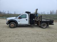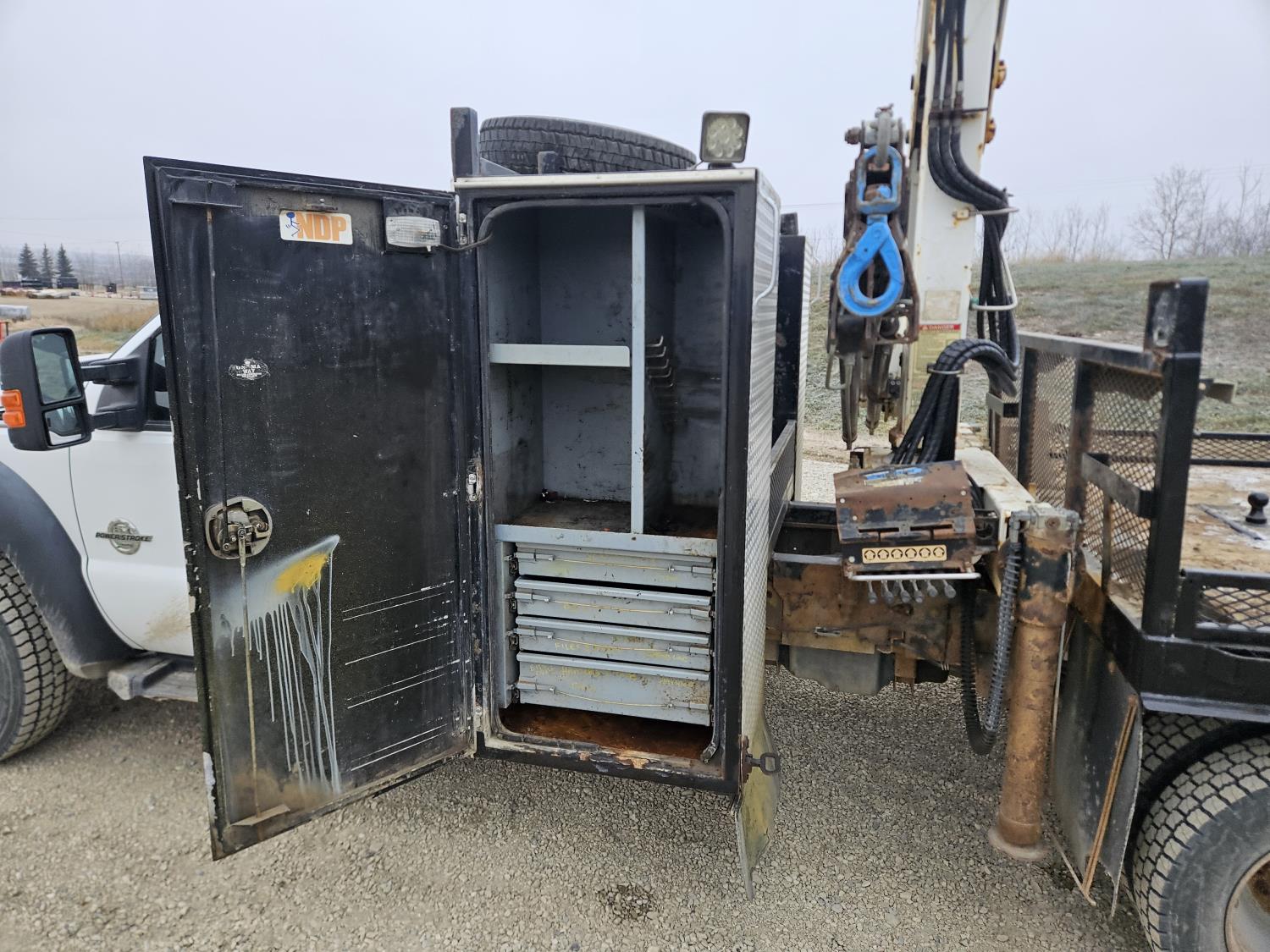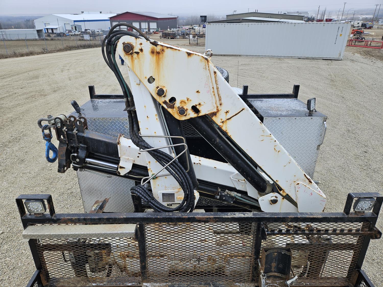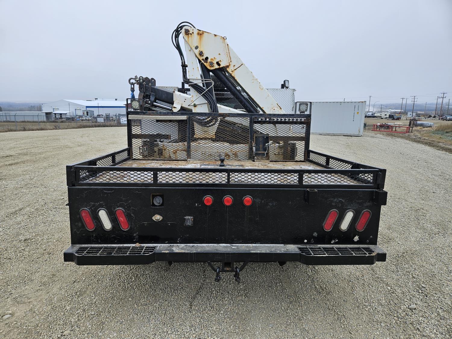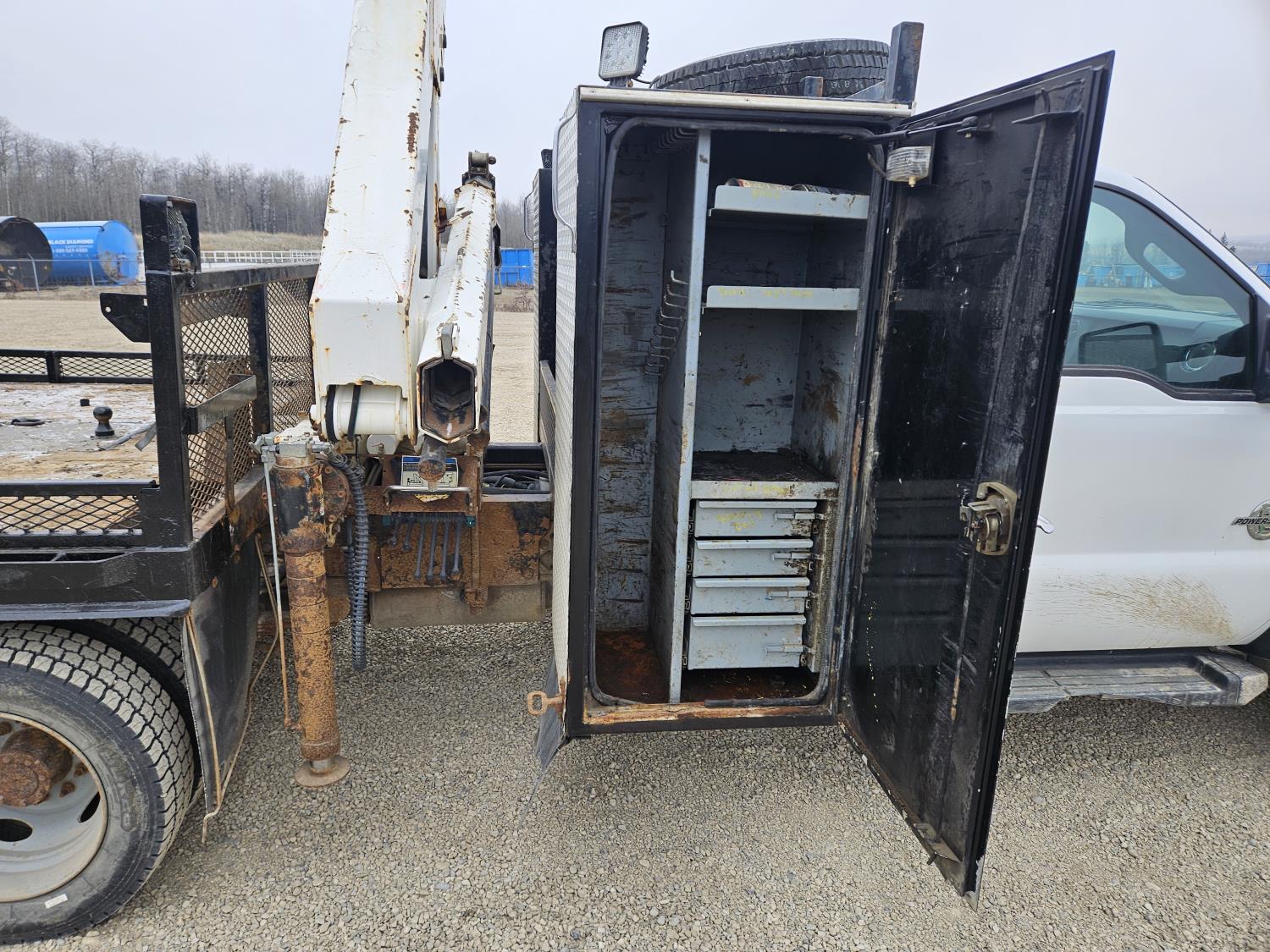 Powerstroke 6.7 L V8 diesel engine, positive air shutoff, automatic transmission, A/C, cruise control, stereo, hydraulic wet kit, steel tool boxes, 96 inch x 66 inch deck, wood decking, rub rails, stale pockets, fold down sides, gooseneck hitch, IMT 6/39K3 3 section 26 ft knuckle crane, outriggers, 225/70R19.5 tires