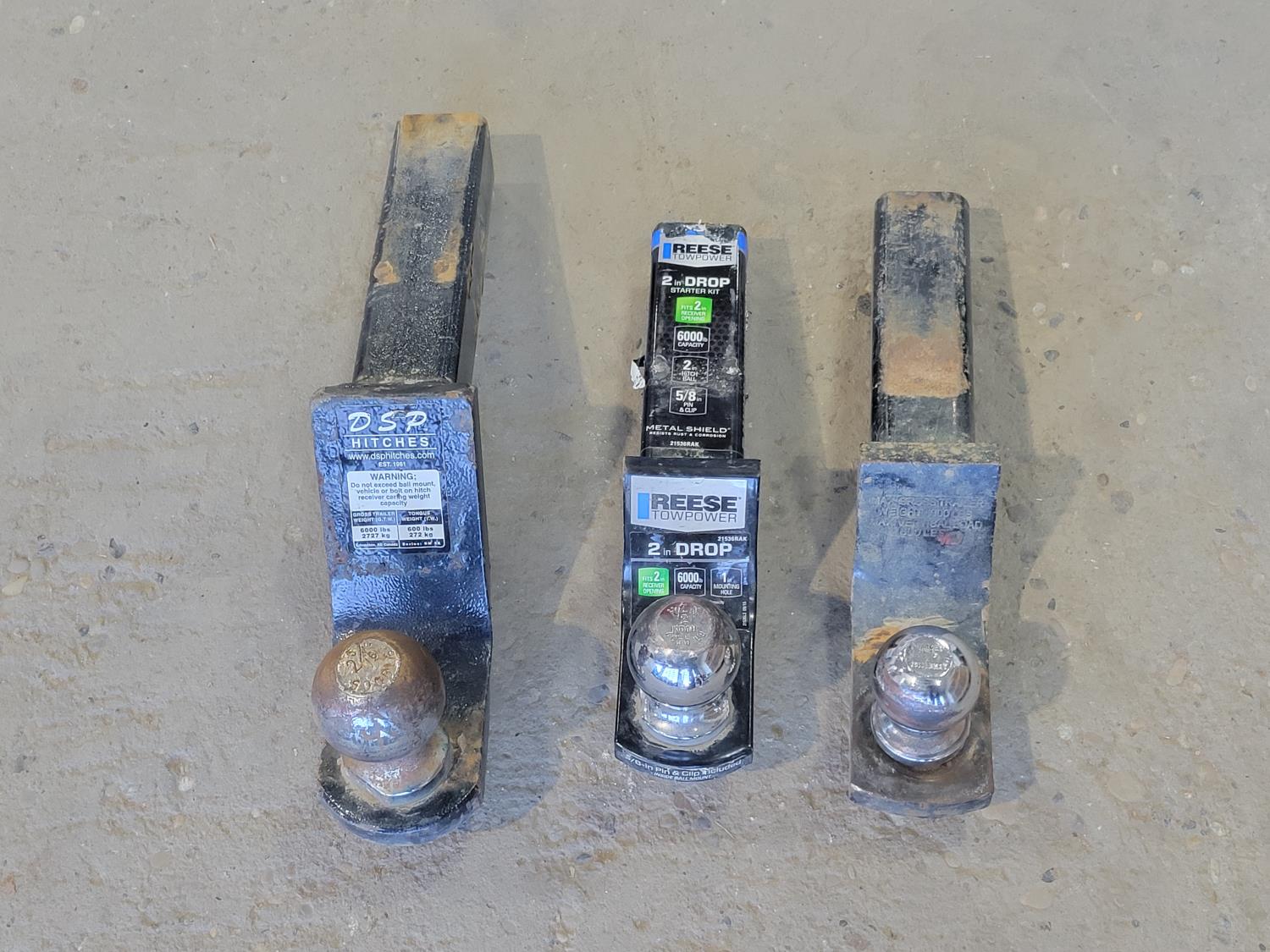 DSP 3 inch drip hitch with 2-5/16 inch ball, Reese 2 inch drop hitch with 2 inch ball, 2 inch drop hitch with 1-7/8 inch ball