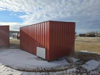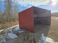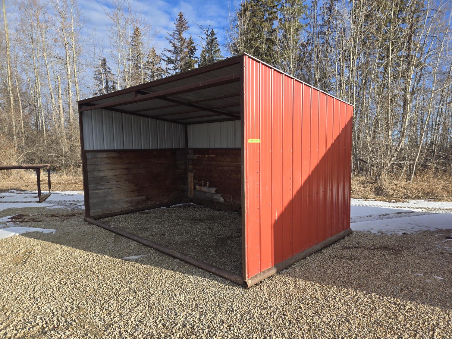 Square tube frame, metal roof and red side wall cladding, wood lined inside part way up, 8 ft high in front, 7 ft ft high at rear, no skids