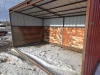 Square tube frame, metal roof and red side wall cladding, wood lined inside part way up, 8 ft high in front, 7 ft ft high at rear, no skids