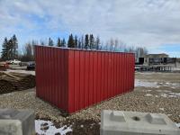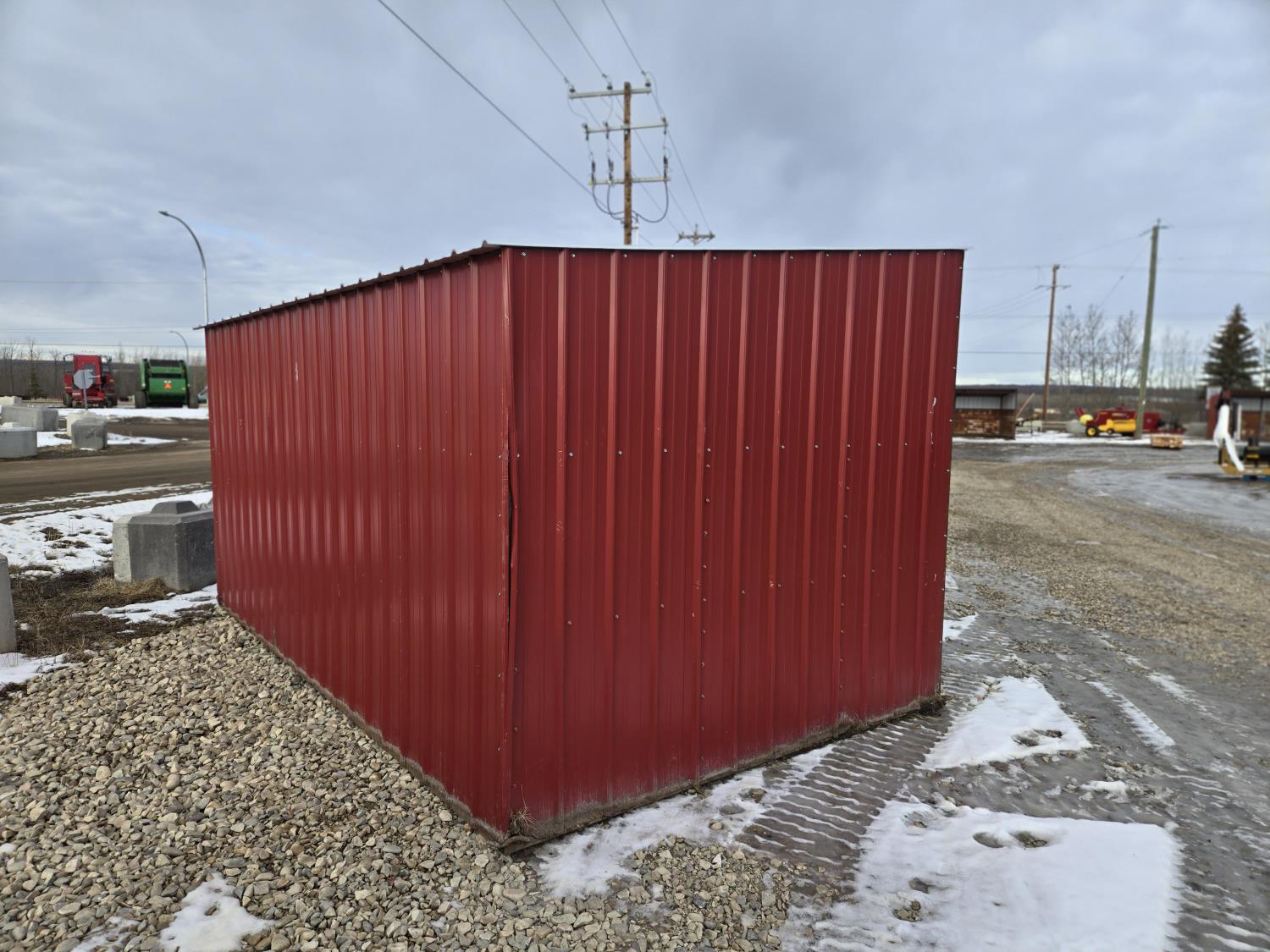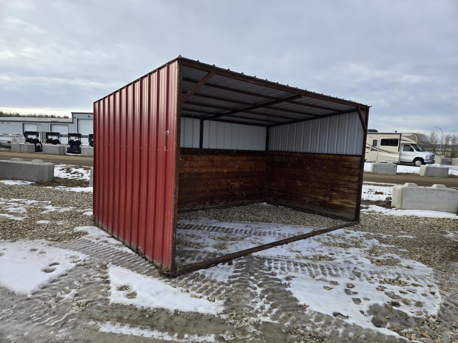Square tube frame, metal roof and red side wall cladding, wood lined inside part way up, 8 ft high in front, 7 ft ft high at rear, no skids