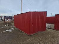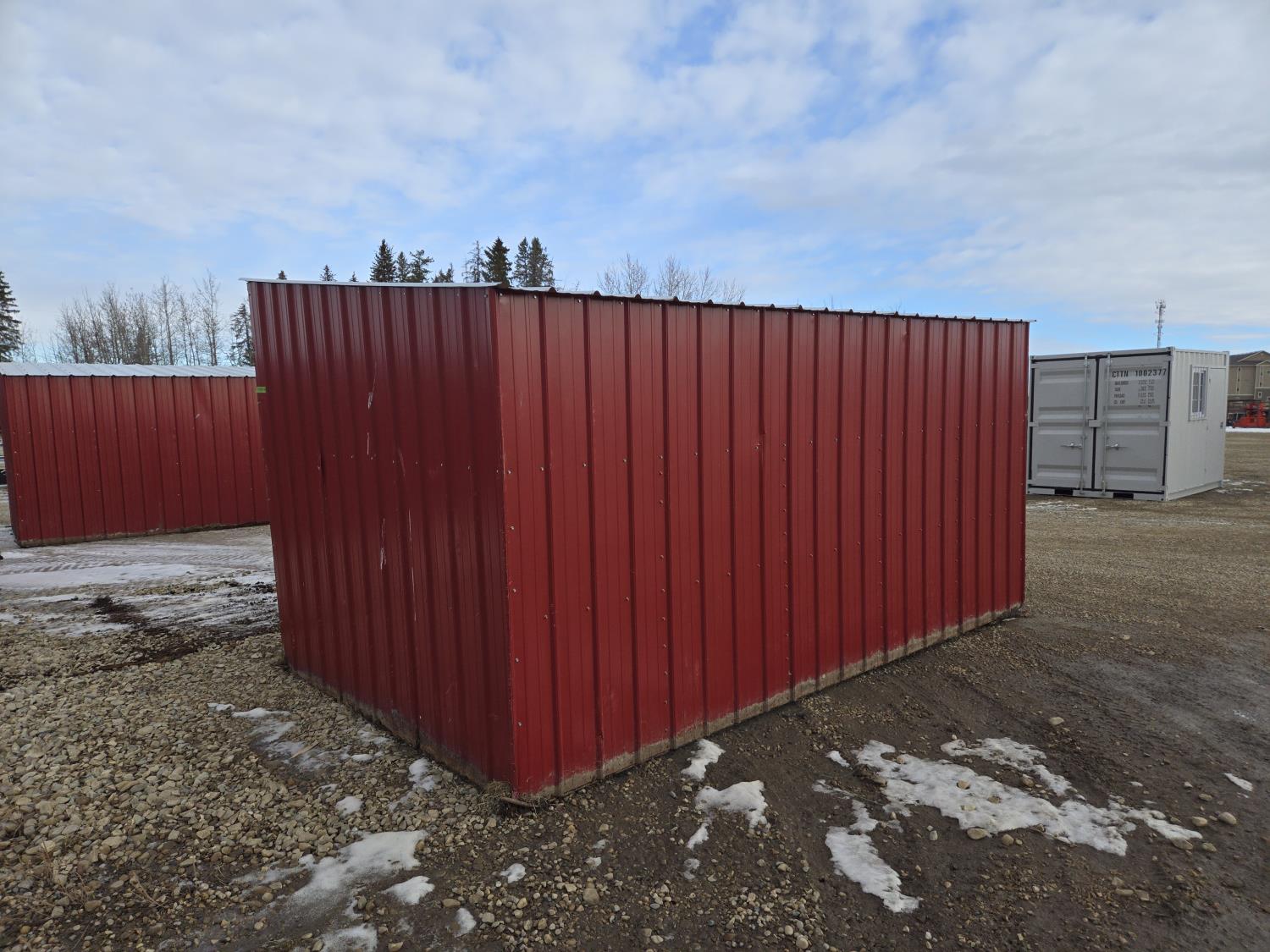 Square tube frame, metal roof and red side wall cladding, wood lined inside part way up, 8 ft high in front, 7 ft ft high at rear, no skids