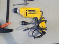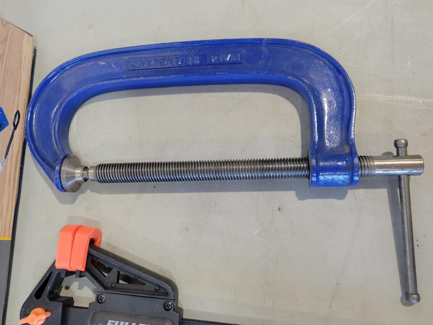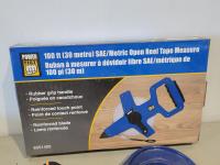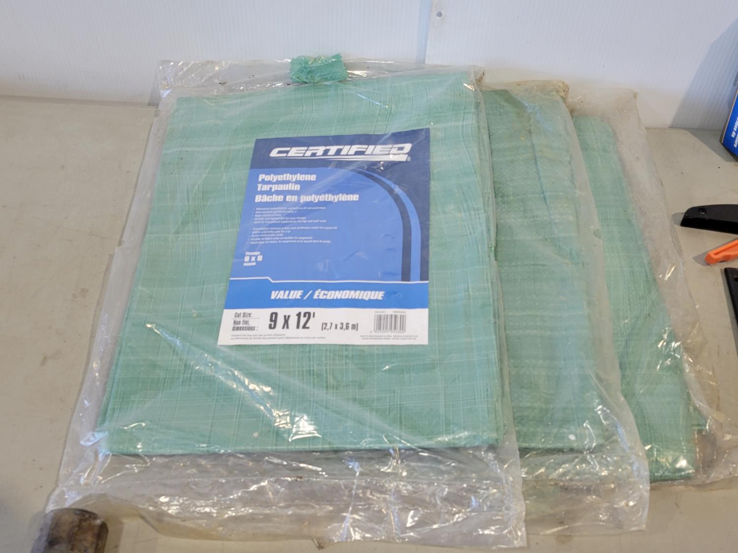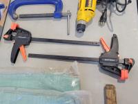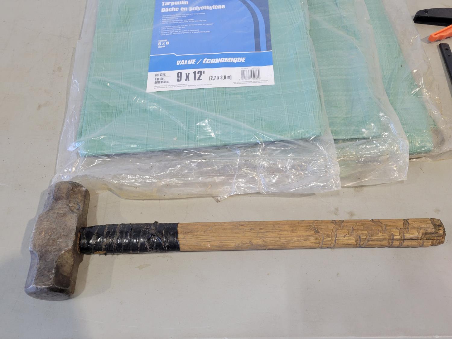 (3) 9 ft x 12 ft poly tarps, (2) 12 inch Fuller wood clamps, 8 inch C-clamp, Power Fist 100 ft open reel tape measure, DeWalt 3/8 inch drill