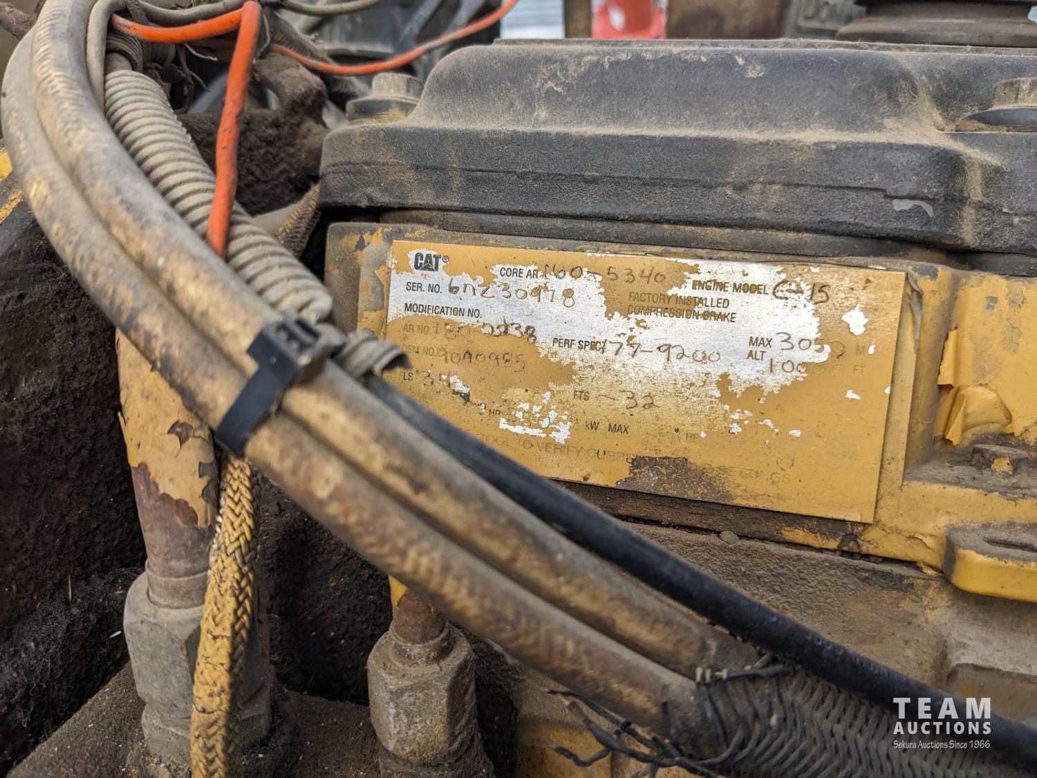 Caterpillar C15 15.2 L 6 cylinder 550 HP engine, Eaton Fuller 18 speed manual transmission, air ride driver seat, radio, hydraulic wet kit, Nordic hoist, Cancade 19' box, electric roll tarp, remote hoist and opener, air ride suspension, 16,000 lb front axle, 46,000 lb rear axles, full lockers, 238 inch WB, all aluminum wheels, 385/65R22.5 front tires, 11R24.5 rear tires