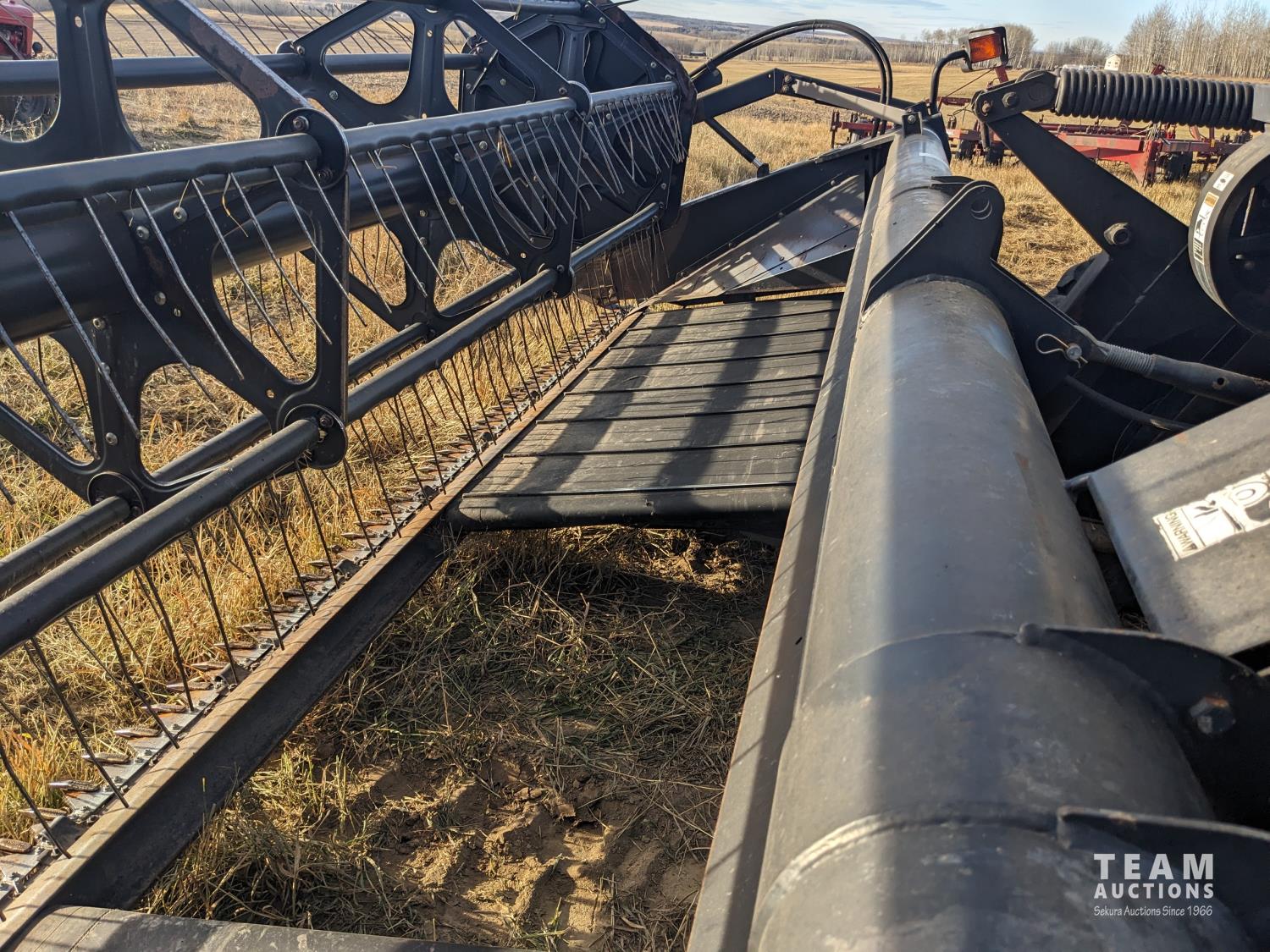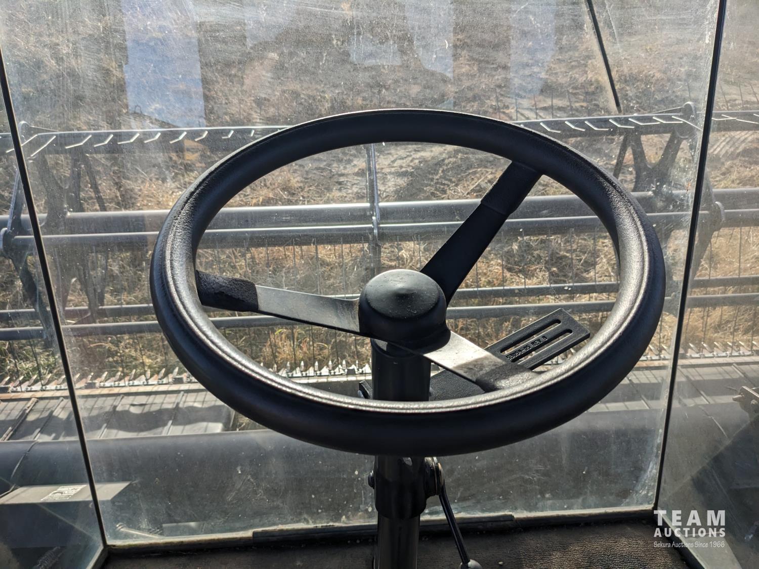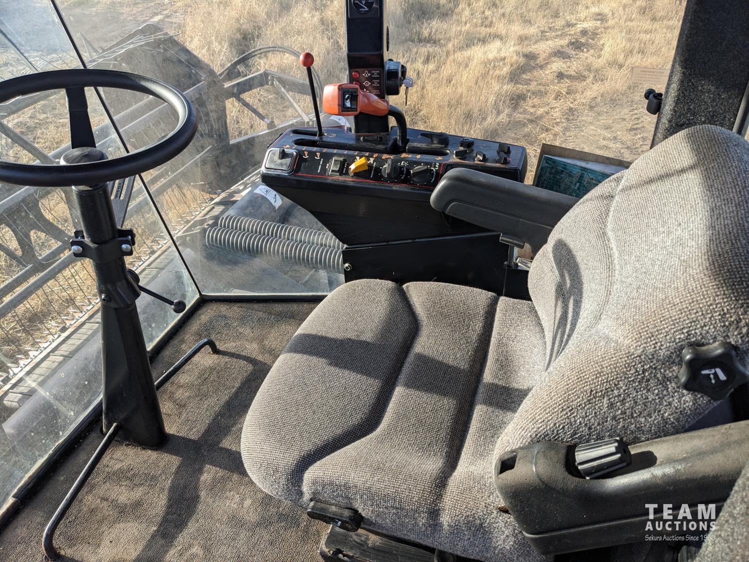 1999 Macdon 972 triple delivery rigid draper header, pickup reel, Cummins 3.9 L 4 cylinder diesel engine, A/C, radio, 21.5-16.1 front tires